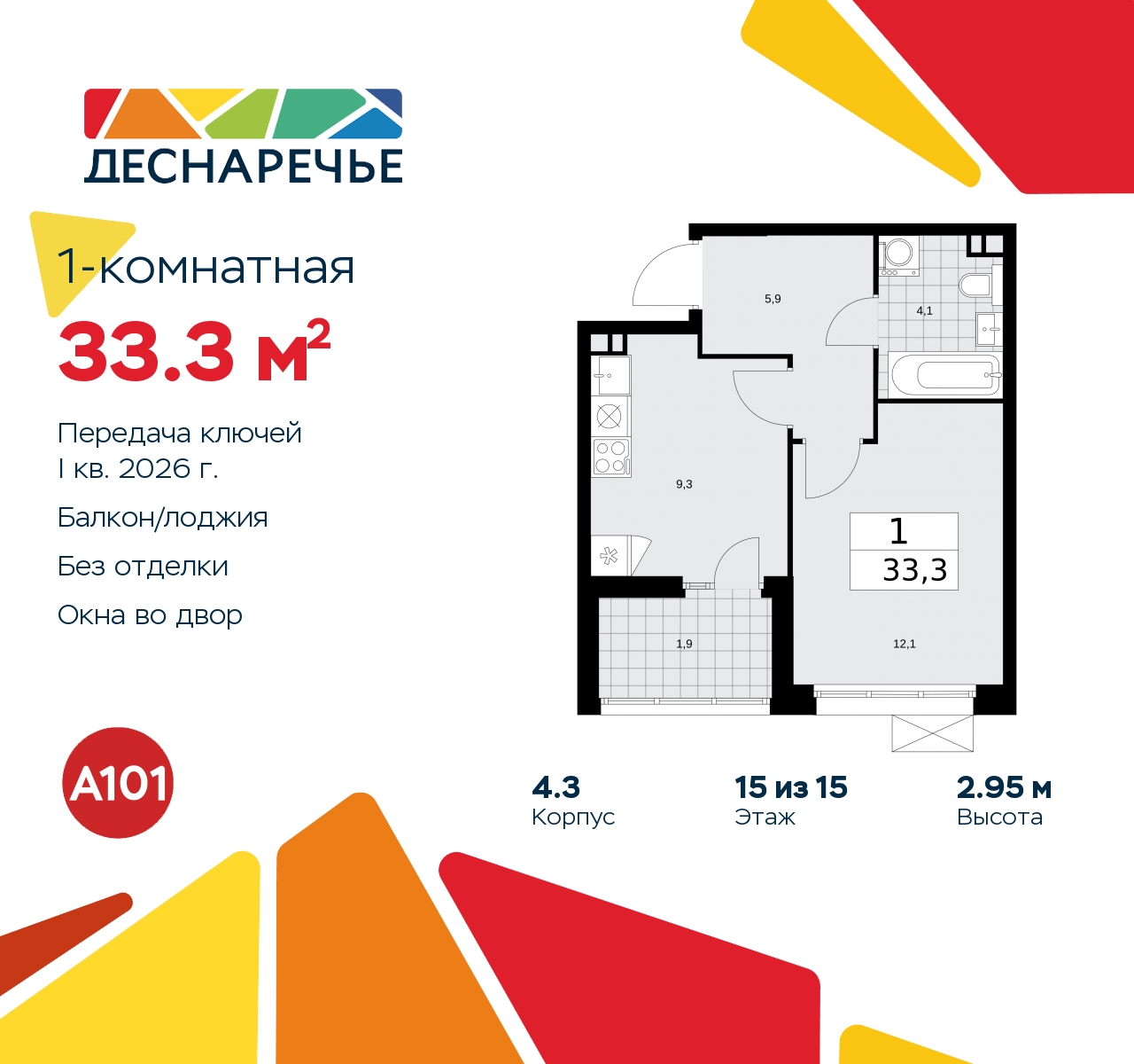 Однокомнатная квартира в ЖК "Деснаречье" на 15 этаже. Квартира без отделки, новый собственник может сделать ремонт по своему дизайн-проекту. Общая площадь: 33.3 кв.м., жилая: 12.1 кв.м., площадь просторной кухни-столовой: 9.3 кв.м. Все окна выходят на одну сторону. В квартире одна лоджия, один совмещенный санузел. Высота потолков 2.95 м. Эта квартира предлагается без отделки. Будут установлены стеклопакеты с повышенной тепло- и шумоизоляцией, в квартиру заведены все коммуникации. Вы сможете в полном объеме реализовать ваши идеи обустройства вашего комфортного дома. Для тех, кто ценит время и не хочет дополнительных трат на ремонт мы предлагаем квартиры с предчистовой и дизайнерской отделкой. Квартира находится в корпусе 4.3. Дом монолитный, одноподъездный, высотой 15 этажей. На этаже 10 квартир. В подъезде 1 пассажирский и 1 грузовой лифт. Начало строительства - 3 квартал 2023 года. Окончание строительства - 1 квартал 2026 года. Оформление сделки по договору долевого участия. Артикул квартиры по базе застройщика 88К-4.3-717. ПРЕДЛОЖЕНИЯ ОТ ЗАСТРОЙЩИКА В ОКТЯБРЕ 2025: Ипотека от 13,9 % для всех! На весь срок. "Семейная ипотека" вернулась. Ставка от 3,5 % на весь срок! Без удорожания! Выгодное ипотечное комбо: Ипотека от 2200 р./мес. и от 6 % после рождения ребёнка! Ипотека для всех "Держи пять!" - ставка 5 % на 2 года! *более подробную информацию по скидкам и акциям уточняйте в отделе продаж Масштабный проект "Деснаречье" на юго-западе Москвы, который включает три новых района («квартала»), объединённые общей идеей – воплотить в реальность мечты современных жителей столицы об интересном, комфортном и разноплановом городском пространстве в окружении рек и лесов, словно сошедших с полотен русских живописцев: - «Берег» оценят все, кому близка водная стихия: плеск волн, солнечные блики и прогулки вдоль тихого течения речи. - «Лес» утопает в зелени парков и лесов. Здесь соблюдён идеальный баланс загородного спокойствия и столичного комфорта. - «Парк», самый энергичный и яркий, отличается высокой концентрацией пространств для спорта и творчества. Жилой комплекс "Деснаречье" расположится в 12 км от МКАД по современному Калужскому шоссе. Внешний облик зданий соответствует современному стилю и стандартам, характерным и для других популярных проектов ГК «А101»: сочетание контрастных тонов, большое количество остекления, в котором отражается небо, гармония с природным окружением. Весь город - в вашем районе. Находиться на территории «15-минутного города» значит иметь всё необходимое для полноценной жизни в шаговой доступности. Маршруты в районе «Деснаречье» выстроены так, чтобы добраться до магазинов, парков, школ, салонов услуг и других объектов можно было всего за несколько минут пешком или на велосипеде. Двор закрытый от машин – это тишина, комфорт и безопасность, поэтому все машино-места (включая «семейные» и увеличенные, с возможностью установки роллетных шкафов) находятся в подземном паркинге. В паркинги можно спуститься на лифте из любого подъезда или по лестнице. Рядом с «Деснаречьем» в 2027 году планируется открытие станции метро «Десна», до которой будет удобно добраться пешком или на велосипеде. Дорога на автомобиле до перехватывающих парковок станций «Ольховая» и «Прокшино» займёт около 10 минут. В процессе реализации проекта будут появляться новые маршруты общественного