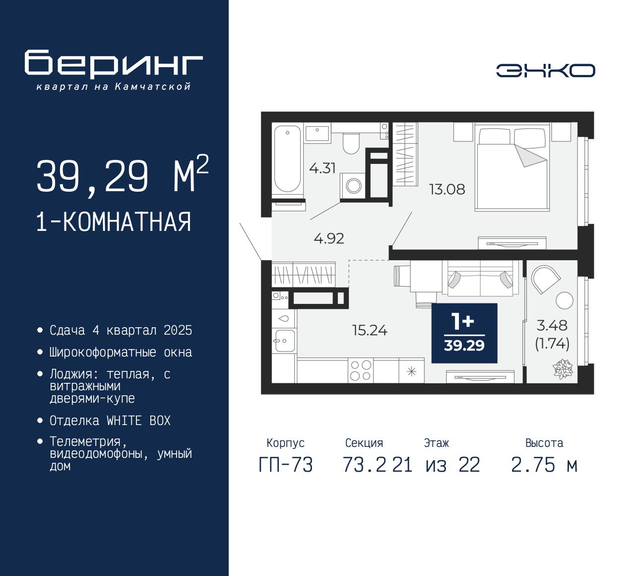 Продается 1-комн. квартира в ЖК "Беринг" на 21 этаже. Квартира без отделки, новый собственник может сделать ремонт по индивидуальному проекту. Общая площадь: 39.29 кв.м., жилая: 13.08 кв.м., площадь просторной кухни-столовой: 15.24 кв.м. Все окна выходят на одну сторону. В квартире одна лоджия, один совмещенный санузел. Высота потолков 2.75 м. Дом монолитный, многоподъездный, переменной этажности, от 9 до 22 этажей. Квартира находится в 73.2-й секции высотой 22 этажа в корпусе ГП-73. На этаже 7 квартир. В подъезде 1 пассажирский и 1 грузовой лифт. Окончание строительства - 4 квартал 2025 года. Оформление сделки по договору долевого участия. Подобно знаменитому исследователю, мы чувствуем себя первооткрывателями этой локации. Хотим показать новую суть места, сформировать для вас жизненный опыт, которого ещё не было. Беринг — район зелёного цвета. Беринг — район, который откроется вам с другой стороны. Впечатлит новым уровнем комфорта и качеством жизни. Беринг — открытие на карте города. Первый квартал расположен в районе Тура, в границах улиц: Камчатская – Западносибирская – Энтузиастов. Вокруг уже есть всё для того, чтобы ежедневная рутина была лишь частью жизни и не доставляла дискомфорта. Школы и детские сады, магазины и аптеки, поликлиника, места для семейного отдыха, пеших и велопрогулок, и даже рыбалки. Масштабное озеленение дворов — визитная карточка ЭНКО и ваш оазис спокойствия, чтобы отвлечься от повседневности. Раскидистые деревья, кустарники, травы и цветы — осталось остановиться, вдохнуть и расслабиться, глядя на эту природную красоту. Стилистика подъездов продолжает концепцию Беринга, вдохновлённого Камчаткой: сдержанный, но при этом впечатляющий дизайн соседствует с удобством и функциональностью. (AQID02315705)