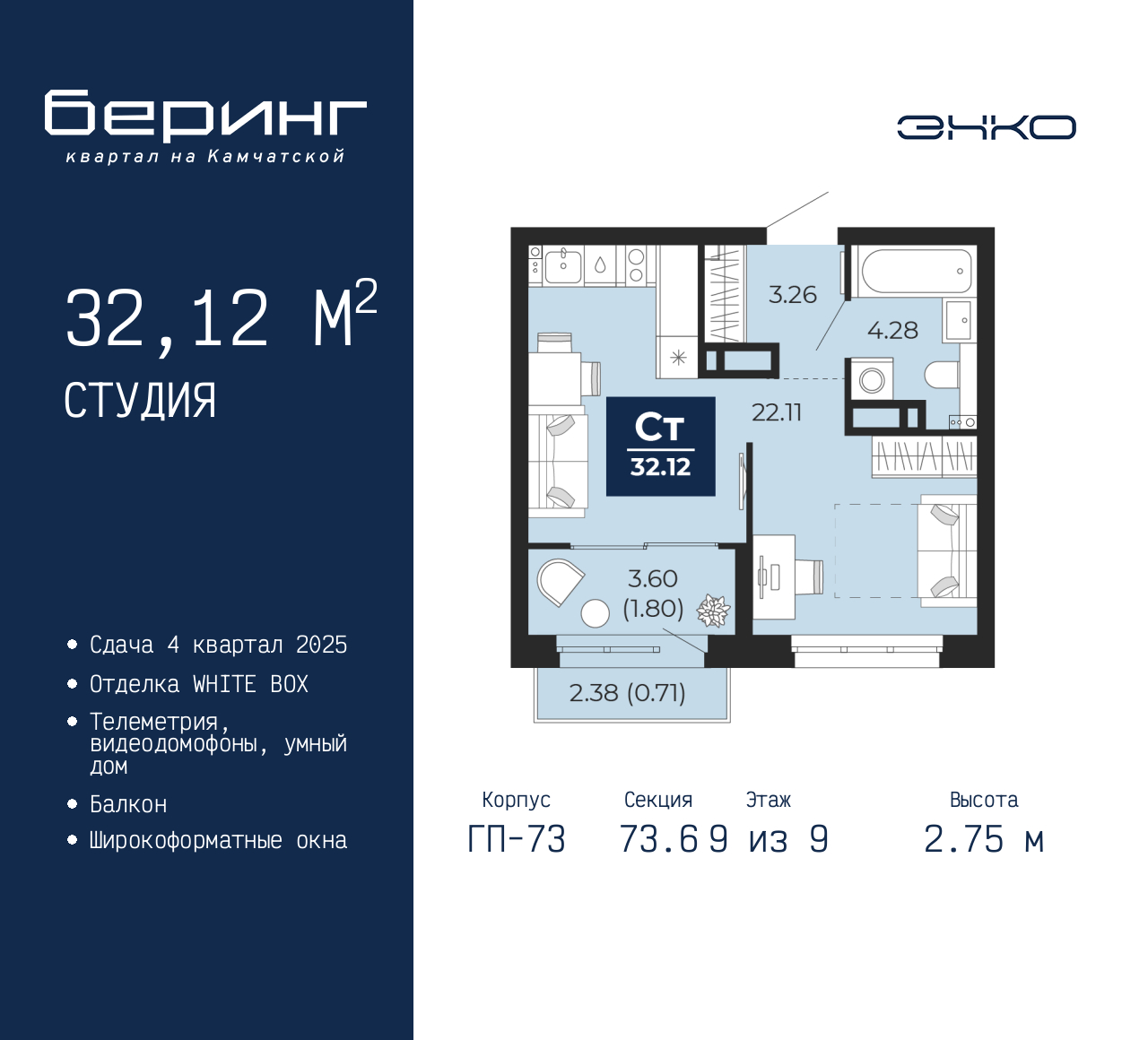 Продается 1-комн. квартира-студия в ЖК "Беринг" на 9 этаже. Квартира без отделки, новый собственник может сделать ремонт по своему проекту. Общая площадь: 32.12 кв.м., площадь гостиной 22.11 кв.м., из которых 5 кв.м. выделено под кухонную зону. Все окна выходят на одну сторону. В квартире один балкон, один совмещенный санузел. Высота потолков 2.75 м. Дом монолитный, многоподъездный, переменной этажности, от 9 до 22 этажей. Квартира находится в 73.6-й секции высотой 9 этажей в корпусе ГП-73. На этаже 5 квартир. В подъезде 1 пассажирский и 1 грузовой лифт. Окончание строительства - 4 квартал 2025 года. Оформление сделки по договору долевого участия. Подобно знаменитому исследователю, мы чувствуем себя первооткрывателями этой локации. Хотим показать новую суть места, сформировать для вас жизненный опыт, которого ещё не было. Беринг — район зелёного цвета. Беринг — район, который откроется вам с другой стороны. Впечатлит новым уровнем комфорта и качеством жизни. Беринг — открытие на карте города. Первый квартал расположен в районе Тура, в границах улиц: Камчатская – Западносибирская – Энтузиастов. Вокруг уже есть всё для того, чтобы ежедневная рутина была лишь частью жизни и не доставляла дискомфорта. Школы и детские сады, магазины и аптеки, поликлиника, места для семейного отдыха, пеших и велопрогулок, и даже рыбалки. Масштабное озеленение дворов — визитная карточка ЭНКО и ваш оазис спокойствия, чтобы отвлечься от повседневности. Раскидистые деревья, кустарники, травы и цветы — осталось остановиться, вдохнуть и расслабиться, глядя на эту природную красоту. Стилистика подъездов продолжает концепцию Беринга, вдохновлённого Камчаткой: сдержанный, но при этом впечатляющий дизайн соседствует с удобством и функциональностью. (AQID02315691)