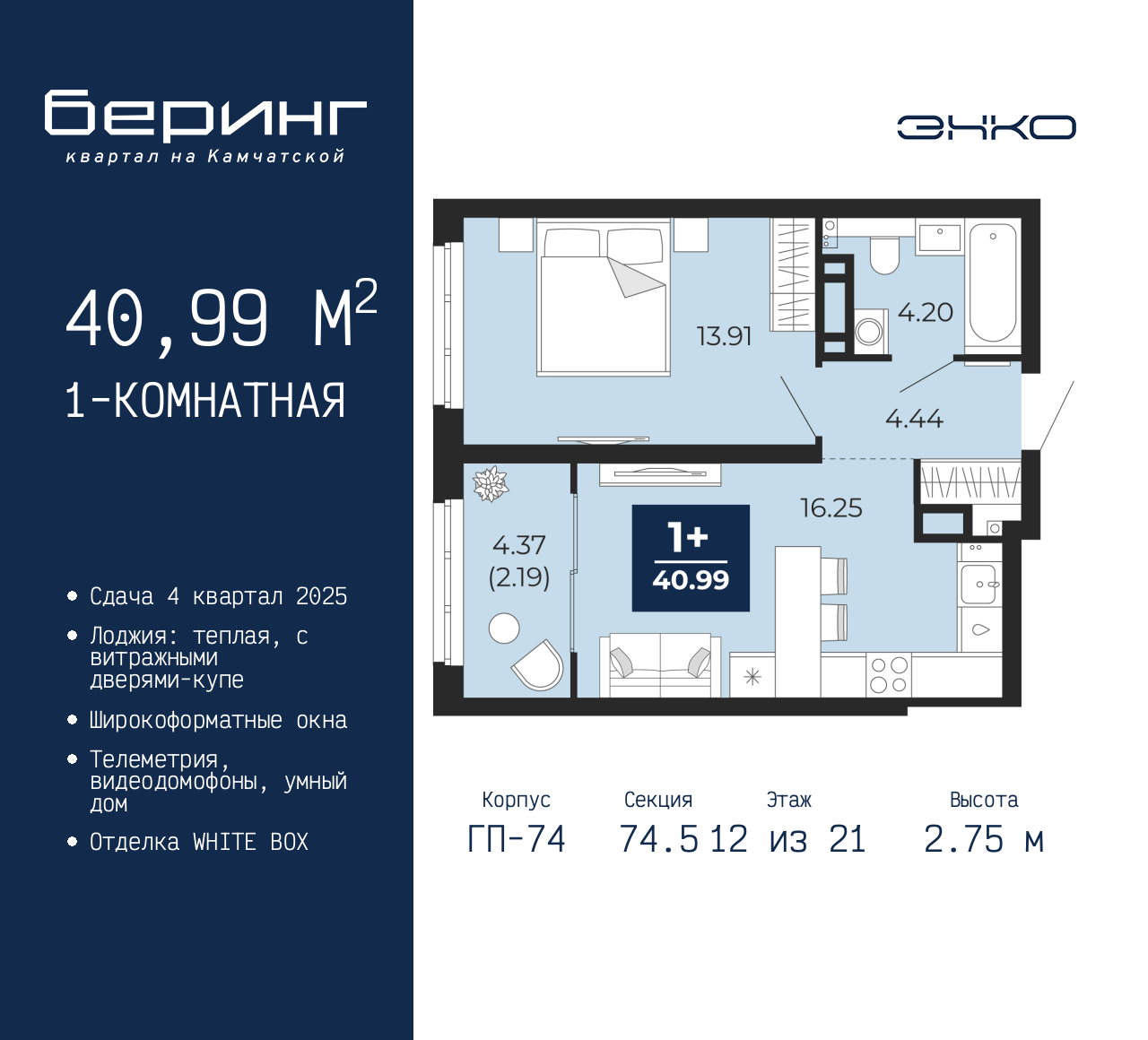 1-комн. квартира в ЖК "Беринг" на 12 этаже. Квартира без отделки, полностью готова к чистовой отделке и дальнейшему ремонту. Общая площадь: 40.99 кв.м., жилая: 13.91 кв.м., площадь просторной кухни-столовой: 16.25 кв.м. Все окна выходят на одну сторону. В квартире одна лоджия, один совмещенный санузел. Высота потолков 2.75 м. Дом монолитный, многоподъездный, переменной этажности, от 9 до 21 этажей. Квартира находится в 74.5-й секции высотой 21 этаж в корпусе ГП-74. На этаже 7 квартир. В подъезде 1 пассажирский и 1 грузовой лифт. Окончание строительства - 4 квартал 2025 года. Оформление сделки по договору долевого участия. Подобно знаменитому исследователю, мы чувствуем себя первооткрывателями этой локации. Хотим показать новую суть места, сформировать для вас жизненный опыт, которого ещё не было. Беринг — район зелёного цвета. Беринг — район, который откроется вам с другой стороны. Впечатлит новым уровнем комфорта и качеством жизни. Беринг — открытие на карте города. Первый квартал расположен в районе Тура, в границах улиц: Камчатская – Западносибирская – Энтузиастов. Вокруг уже есть всё для того, чтобы ежедневная рутина была лишь частью жизни и не доставляла дискомфорта. Школы и детские сады, магазины и аптеки, поликлиника, места для семейного отдыха, пеших и велопрогулок, и даже рыбалки. Масштабное озеленение дворов — визитная карточка ЭНКО и ваш оазис спокойствия, чтобы отвлечься от повседневности. Раскидистые деревья, кустарники, травы и цветы — осталось остановиться, вдохнуть и расслабиться, глядя на эту природную красоту. Стилистика подъездов продолжает концепцию Беринга, вдохновлённого Камчаткой: сдержанный, но при этом впечатляющий дизайн соседствует с удобством и функциональностью. (AQID02315768)