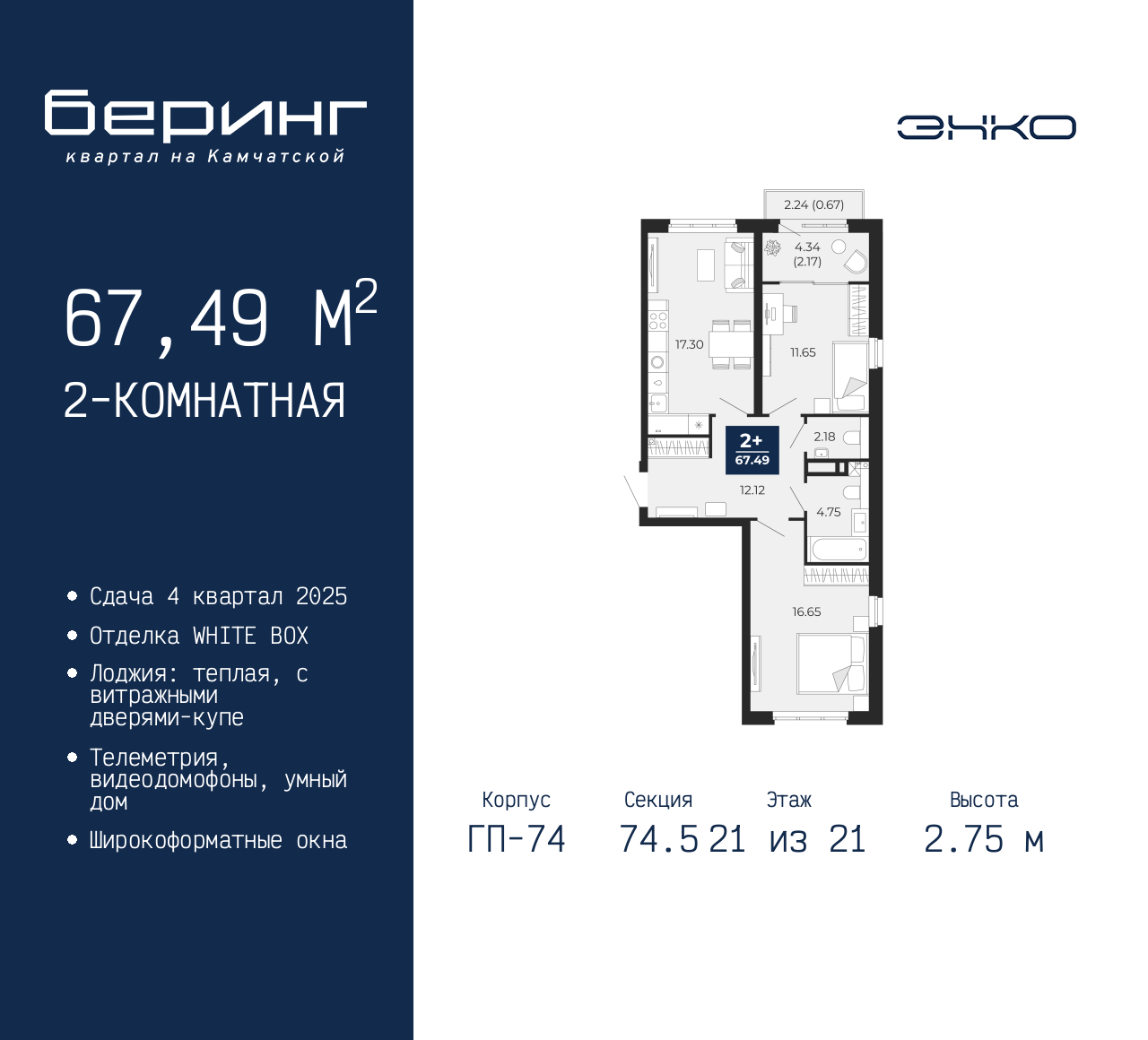 Двухкомнатная квартира в ЖК "Беринг" на 21 этаже. Квартира без отделки, полностью готова к чистовой отделке и дальнейшему ремонту. Общая площадь: 67.49 кв.м., жилая: 28.3 кв.м., площадь просторной кухни-столовой: 17.3 кв.м. Квартира без проходных комнат, окна выходят нa три cтopoны дома. В квартире один балкон и одна лоджия, один совмещенный и один раздельный санузел. Высота потолков 2.75 м. Дом монолитный, многоподъездный, переменной этажности, от 9 до 21 этажей. Квартира находится в 74.5-й секции высотой 21 этаж в корпусе ГП-74. На этаже 7 квартир. В подъезде 1 пассажирский и 1 грузовой лифт. Окончание строительства - 4 квартал 2025 года. Оформление сделки по договору долевого участия. Подобно знаменитому исследователю, мы чувствуем себя первооткрывателями этой локации. Хотим показать новую суть места, сформировать для вас жизненный опыт, которого ещё не было. Беринг — район зелёного цвета. Беринг — район, который откроется вам с другой стороны. Впечатлит новым уровнем комфорта и качеством жизни. Беринг — открытие на карте города. Первый квартал расположен в районе Тура, в границах улиц: Камчатская – Западносибирская – Энтузиастов. Вокруг уже есть всё для того, чтобы ежедневная рутина была лишь частью жизни и не доставляла дискомфорта. Школы и детские сады, магазины и аптеки, поликлиника, места для семейного отдыха, пеших и велопрогулок, и даже рыбалки. Масштабное озеленение дворов — визитная карточка ЭНКО и ваш оазис спокойствия, чтобы отвлечься от повседневности. Раскидистые деревья, кустарники, травы и цветы — осталось остановиться, вдохнуть и расслабиться, глядя на эту природную красоту. Стилистика подъездов продолжает концепцию Беринга, вдохновлённого Камчаткой: сдержанный, но при этом впечатляющий дизайн соседствует с удобством и функциональностью. (AQID02316265)