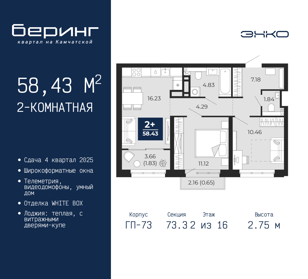 2-комн. квартира в ЖК "Беринг" на 2 этаже. Квартира без отделки, после получения ключей можно делать ремонт. Общая площадь: 58.43 кв.м., жилая: 21.58 кв.м., площадь просторной кухни-столовой: 16.21 кв.м. Комнаты изолированные, все окна выходят на одну сторону. В квартире один балкон и одна лоджия, один совмещенный и один раздельный санузел. Высота потолков 2.75 м. Дом монолитный, многоподъездный, переменной этажности, от 9 до 22 этажей. Квартира находится в 73.3-й секции высотой 16 этажей в корпусе ГП-73. На этаже 8 квартир. В подъезде 1 пассажирский и 1 грузовой лифт. Окончание строительства - 4 квартал 2025 года. Оформление сделки по договору долевого участия. Подобно знаменитому исследователю, мы чувствуем себя первооткрывателями этой локации. Хотим показать новую суть места, сформировать для вас жизненный опыт, которого ещё не было. Беринг — район зелёного цвета. Беринг — район, который откроется вам с другой стороны. Впечатлит новым уровнем комфорта и качеством жизни. Беринг — открытие на карте города. Первый квартал расположен в районе Тура, в границах улиц: Камчатская – Западносибирская – Энтузиастов. Вокруг уже есть всё для того, чтобы ежедневная рутина была лишь частью жизни и не доставляла дискомфорта. Школы и детские сады, магазины и аптеки, поликлиника, места для семейного отдыха, пеших и велопрогулок, и даже рыбалки. Масштабное озеленение дворов — визитная карточка ЭНКО и ваш оазис спокойствия, чтобы отвлечься от повседневности. Раскидистые деревья, кустарники, травы и цветы — осталось остановиться, вдохнуть и расслабиться, глядя на эту природную красоту. Стилистика подъездов продолжает концепцию Беринга, вдохновлённого Камчаткой: сдержанный, но при этом впечатляющий дизайн соседствует с удобством и функциональностью. (AQID02316098)