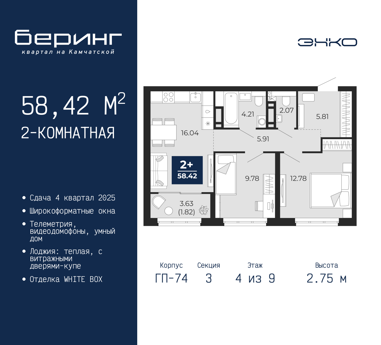 Продается двухкомнатная квартира в ЖК "Беринг" на 4 этаже. Квартира без отделки, после получения ключей можно делать ремонт. Общая площадь: 58.42 кв.м., жилая: 22.56 кв.м., площадь просторной кухни-столовой: 16.04 кв.м. Комнаты изолированные, все окна выходят на одну сторону. В квартире одна лоджия, один совмещенный и один раздельный санузел. Высота потолков 2.75 м. Дом монолитный, многоподъездный, переменной этажности, от 9 до 21 этажей. Квартира находится в 3-й секции высотой 9 этажей в корпусе ГП-74. На этаже 7 квартир. В подъезде 1 грузовой лифт. Окончание строительства - 4 квартал 2025 года. Оформление сделки по договору долевого участия. Подобно знаменитому исследователю, мы чувствуем себя первооткрывателями этой локации. Хотим показать новую суть места, сформировать для вас жизненный опыт, которого ещё не было. Беринг — район зелёного цвета. Беринг — район, который откроется вам с другой стороны. Впечатлит новым уровнем комфорта и качеством жизни. Беринг — открытие на карте города. Первый квартал расположен в районе Тура, в границах улиц: Камчатская – Западносибирская – Энтузиастов. Вокруг уже есть всё для того, чтобы ежедневная рутина была лишь частью жизни и не доставляла дискомфорта. Школы и детские сады, магазины и аптеки, поликлиника, места для семейного отдыха, пеших и велопрогулок, и даже рыбалки. Масштабное озеленение дворов — визитная карточка ЭНКО и ваш оазис спокойствия, чтобы отвлечься от повседневности. Раскидистые деревья, кустарники, травы и цветы — осталось остановиться, вдохнуть и расслабиться, глядя на эту природную красоту. Стилистика подъездов продолжает концепцию Беринга, вдохновлённого Камчаткой: сдержанный, но при этом впечатляющий дизайн соседствует с удобством и функциональностью. (AQID02316105)