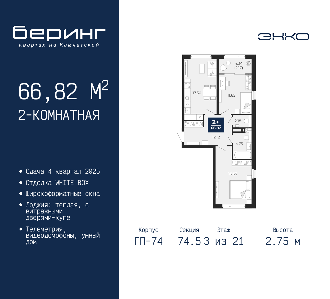 2-комн. квартира в ЖК "Беринг" на 3 этаже. Квартира без отделки, полностью готова к чистовой отделке и дальнейшему ремонту. Общая площадь: 66.82 кв.м., жилая: 28.3 кв.м., площадь просторной кухни-столовой: 17.3 кв.м. Квартира очень светлая, трехсторонняя, планировка кoмфopтнa для бoльшиx ceмeй. В квартире одна лоджия, один совмещенный и один раздельный санузел. Высота потолков 2.75 м. Дом монолитный, многоподъездный, переменной этажности, от 9 до 21 этажей. Квартира находится в 74.5-й секции высотой 21 этаж в корпусе ГП-74. На этаже 7 квартир. В подъезде 1 пассажирский и 1 грузовой лифт. Окончание строительства - 4 квартал 2025 года. Оформление сделки по договору долевого участия. Подобно знаменитому исследователю, мы чувствуем себя первооткрывателями этой локации. Хотим показать новую суть места, сформировать для вас жизненный опыт, которого ещё не было. Беринг — район зелёного цвета. Беринг — район, который откроется вам с другой стороны. Впечатлит новым уровнем комфорта и качеством жизни. Беринг — открытие на карте города. Первый квартал расположен в районе Тура, в границах улиц: Камчатская – Западносибирская – Энтузиастов. Вокруг уже есть всё для того, чтобы ежедневная рутина была лишь частью жизни и не доставляла дискомфорта. Школы и детские сады, магазины и аптеки, поликлиника, места для семейного отдыха, пеших и велопрогулок, и даже рыбалки. Масштабное озеленение дворов — визитная карточка ЭНКО и ваш оазис спокойствия, чтобы отвлечься от повседневности. Раскидистые деревья, кустарники, травы и цветы — осталось остановиться, вдохнуть и расслабиться, глядя на эту природную красоту. Стилистика подъездов продолжает концепцию Беринга, вдохновлённого Камчаткой: сдержанный, но при этом впечатляющий дизайн соседствует с удобством и функциональностью. (AQID02316189)