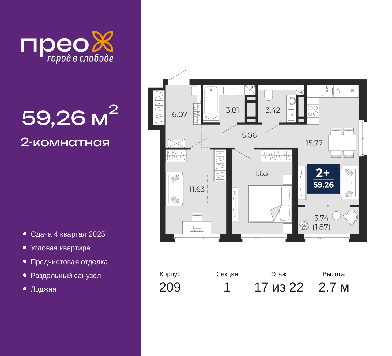 - Общая площадь 59.26 м²