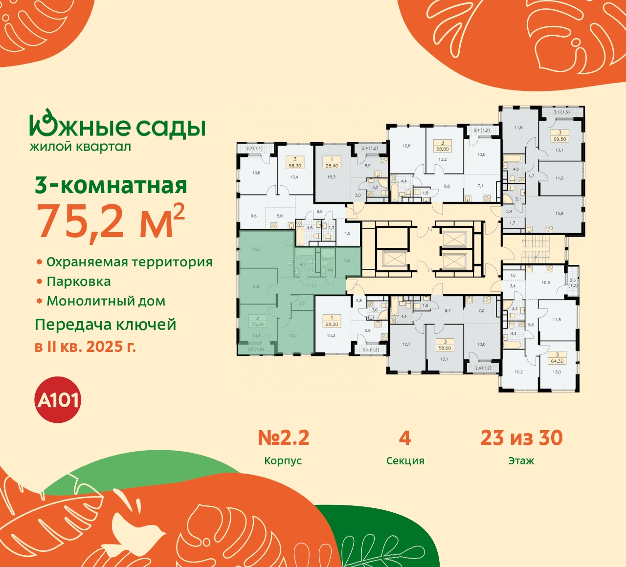 Просторная трехкомнатная квартира с отделкой в ЖК "Южные сады" на 23 этаже. Общая площадь: 75.2 кв.м., жилая: 30.7 кв.м., площадь просторной кухни-столовой: 16.2 кв.м. Угловая квартира, идеально подойдет любителям тишины и панорамных видов. В квартире одна лоджия, два совмещенных санузла. Высота потолков 2.87 м. Имеется ниша под гардероб. Квартира находится в корпусе 2.2. Дом монолитный, одноподъездный, высотой 30 этажей. На этаже 8 квартир. В подъезде 3 грузовых лифта. Начало строительства - 2 квартал 2022 года. Окончание строительства - 1 квартал 2026 года. Оформление сделки по договору долевого участия. Артикул квартиры по базе застройщика 99К-2.2-482. В шаговой доступности от дома расположены станции метро (расстояние по прямой): «Бунинская аллея» (1.1 км), «Улица Горчакова» (1.2 км), «Бульвар адмирала Ушакова» (1.7 км), «Потапово» (1.7 км). ПРЕДЛОЖЕНИЯ ОТ ЗАСТРОЙЩИКА В ОКТЯБРЕ 2025: Ипотека от 13,9 % для всех! На весь срок. "Семейная ипотека" вернулась. Ставка от 3,5 % на весь срок! Без удорожания! Выгодное ипотечное комбо: Ипотека от 2200 р./мес. и от 6 % после рождения ребёнка! Ипотека для всех "Держи пять!" - ставка 5 % на 2 года! *более подробную информацию по скидкам и акциям уточняйте в отделе продаж Новый проект "Южные сады" от застройщика "А101" будет построен на юге Москвы в пешей доступности от метро "Бунинская аллея". Дома будут возведены в окружении парков, а на территории комплекса будет выполнено благоустройство "Сады Средиземноморья" - тёплые оттенки и натуральные материалы покрытий, разнообразие плодовых и вечнозелёных деревьев, живые изгороди и эстетика средиземноморского сада. На первых этажах откроются магазины, кафе с летними террасами, фитнес-залы и салоны красоты. Для каждой группы домов фасады разработаны отдельно. Сочетание различных цветов и материалов привносит разнообразие и динамику в облик нового района. В отделке вентилируемых фасадов будут применяться качественные и долговечные материалы: штукатурка, облицовочная фасадная плитка разных размеров и текстур. Подъезды с витражным остеклением хорошо просматриваются со стороны двора. Естественное освещение днём и уютный вечерний свет создают ощущение «я дома» задолго до входа в квартиру, повышают комфорт и безопасность. Эксклюзивный авторский дизайн входных групп от Studio 211 созвучен природному окружению. Среди особенностей проекта московская прописка, школы и детские сады Южного Бутово, удобный выезд на СБВ. В каждой квартире предусмотрены летние помещения, просторные окна, высокие потолки. На ваш выбор застройщик предлагает как квартиры без отделки, с отделкой WHITE BOX, а также с дизайнерской отделкой. (AQID01757626)