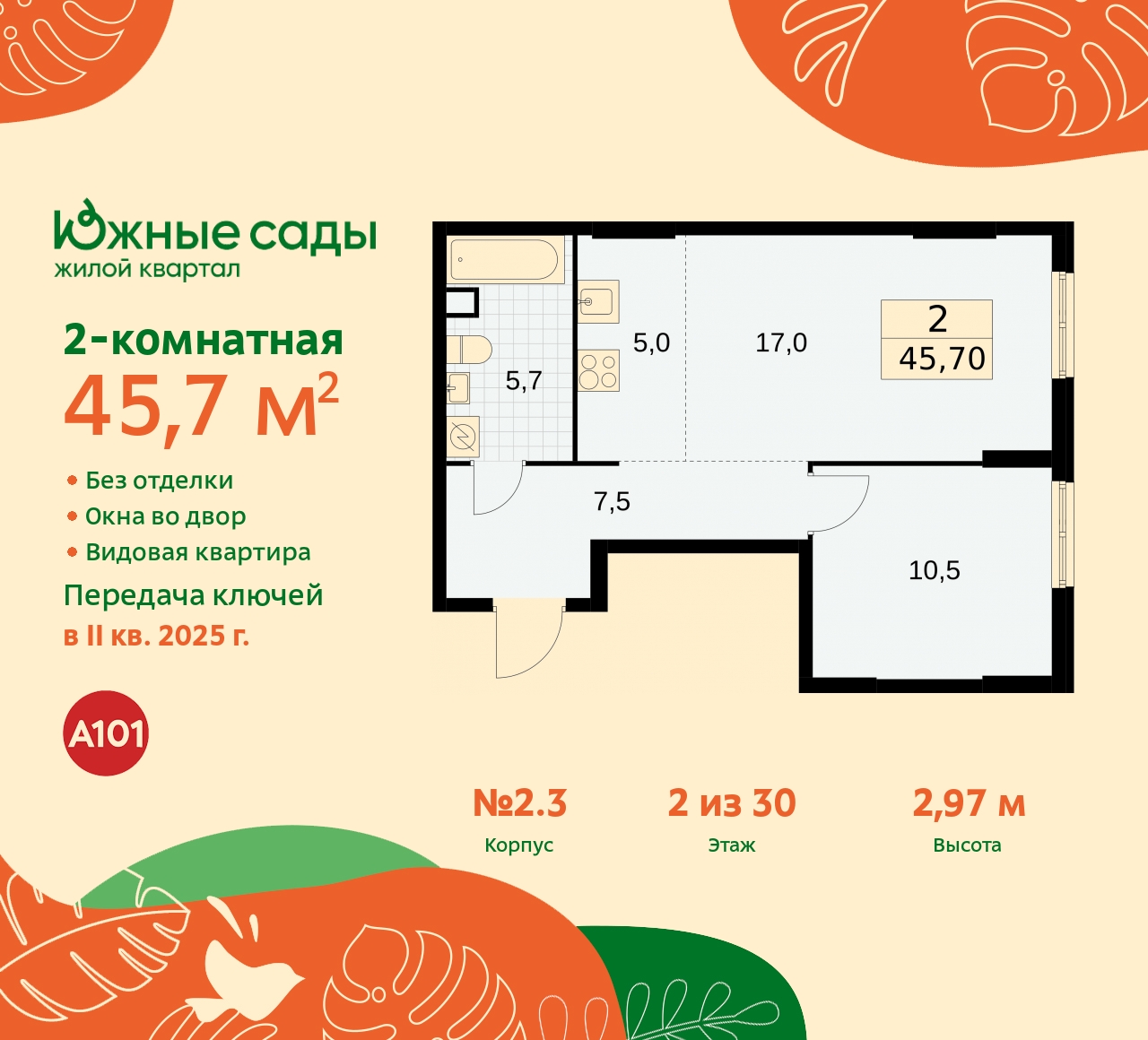 Двухкомнатная квартира с европланировкой в ЖК "Южные сады" на 2 этаже. Квартира без отделки, после оформления собственности можно делать ремонт. Общая площадь: 45.7 кв.м., жилая: 27.5 кв.м., суммарная площадь гостиной-столовой с кухонной зоной: 22 кв.м. Европланировка, за счет большой площади кухни-гостиной квартира выглядит просторной и очень удобна для жизни. Комнаты изолированные, все окна выходят на одну сторону. В квартире один совмещенный санузел. Высота потолков 2.87 м. Эта квартира предлагается без отделки. Будут установлены стеклопакеты с повышенной тепло- и шумоизоляцией, в квартиру заведены все коммуникации. Вы сможете в полном объеме реализовать ваши идеи обустройства вашего комфортного дома. Видовая квартира. Дом монолитный, трехподъездный, переменной этажности, от 16 до 30 этажей. Квартира находится во 2-й секции высотой 30 этажей в корпусе 2.3. На этаже 5 квартир. В подъезде 3 грузовых лифта. Начало строительства - 2 квартал 2022 года. Окончание строительства - 1 квартал 2026 года. Оформление сделки по договору долевого участия. Артикул квартиры по базе застройщика 99К-2.3-633. В шаговой доступности от жилого комплекса имеются станции метро (расстояние по прямой): «Бунинская аллея» (1.1 км), «Улица Горчакова» (1.2 км), «Бульвар адмирала Ушакова» (1.7 км), «Потапово» (1.7 км). ПРЕДЛОЖЕНИЯ ОТ ЗАСТРОЙЩИКА В ОКТЯБРЕ 2025: Ипотека от 13,9 % для всех! На весь срок. "Семейная ипотека" вернулась. Ставка от 3,5 % на весь срок! Без удорожания! Выгодное ипотечное комбо: Ипотека от 2200 р./мес. и от 6 % после рождения ребёнка! Ипотека для всех "Держи пять!" - ставка 5 % на 2 года! *более подробную информацию по скидкам и акциям уточняйте в отделе продаж Новый проект "Южные сады" от застройщика "А101" будет построен на юге Москвы в пешей доступности от метро "Бунинская аллея". Дома будут возведены в окружении парков, а на территории комплекса будет выполнено благоустройство "Сады Средиземноморья" - тёплые оттенки и натуральные материалы покрытий, разнообразие плодовых и вечнозелёных деревьев, живые изгороди и эстетика средиземноморского сада. На первых этажах откроются магазины, кафе с летними террасами, фитнес-залы и салоны красоты. Для каждой группы домов фасады разработаны отдельно. Сочетание различных цветов и материалов привносит разнообразие и динамику в облик нового района. В отделке вентилируемых фасадов будут применяться качественные и долговечные материалы: штукатурка, облицовочная фасадная плитка разных размеров и текстур. Подъезды с витражным остеклением хорошо просматриваются со стороны двора. Естественное освещение днём и уютный вечерний свет создают ощущение «я дома» задолго до входа в квартиру, повышают комфорт и безопасность. Эксклюзивный авторский дизайн входных групп от Studio 211 созвучен природному окружению. Среди особенностей проекта московская прописка, школы и детские сады Южного Бутово, удобный выезд на СБВ. В каждой квартире предусмотрены летние помещения, просторные окна, высокие потолки. На ваш выбор застройщик предлагает как квартиры без отделки, с отделкой WHITE BOX, а также с дизайнерской отделкой. (AQID01758116)