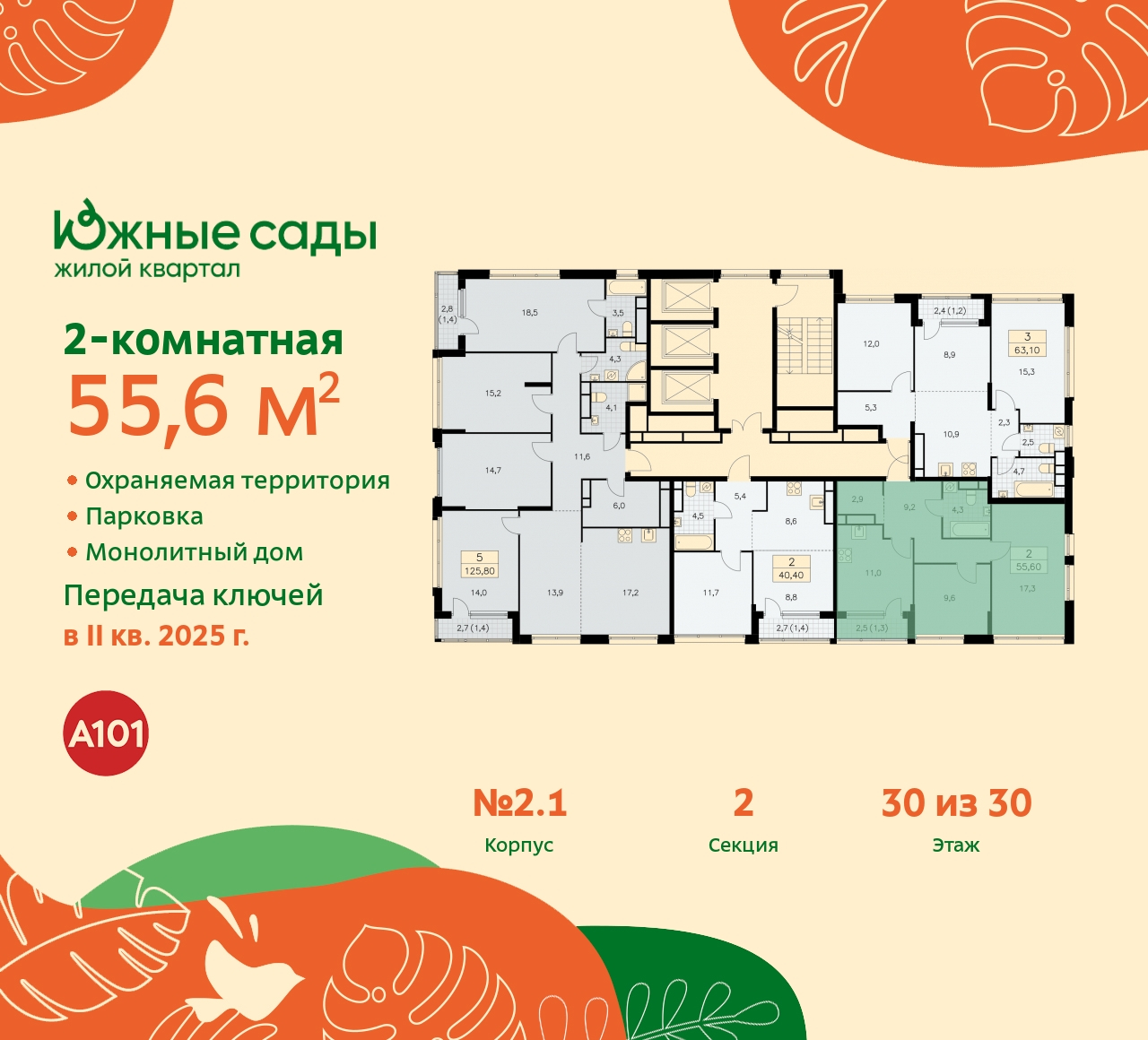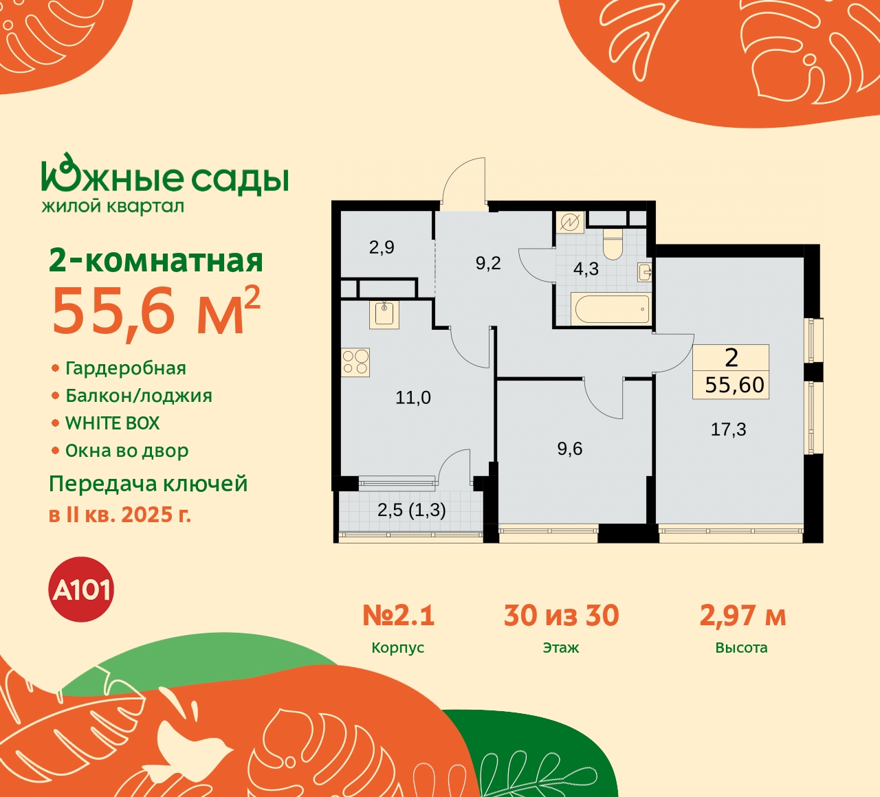 Двухкомнатная квартира с предчистовой отделкой в ЖК "Южные сады" на 30 этаже. Общая площадь: 55.6 кв.м., жилая: 26.6 кв.м., площадь просторной кухни-столовой: 11 кв.м. Комнаты изолированные, все окна выходят на одну сторону. В квартире одна лоджия, один совмещенный санузел. Высота потолков 2.87 м. Эта квартира будет сдана с предчистовой отделкой white box – это квартира с ровными белыми стенами. Такая отделка позволяет сразу приступить к чистовой отделке: выбрать цвета и материалы для стен и полов, купить и расставить мебель и оборудование, развесить светильники и подобрать декор. При желании вы можете заказать дизайнерскую отделку от застройщика по одному из 6 проектов. Это позволит Вам сэкономить время и деньги, а стоимость такого ремонта можно внести в ипотечные платежи. Имеется ниша под гардероб. Дом монолитный, трехподъездный, переменной этажности, от 16 до 30 этажей. Квартира находится во 2-й секции высотой 30 этажей в корпусе 2.1. На этаже 5 квартир. В подъезде 3 грузовых лифта. Начало строительства - 2 квартал 2022 года. Окончание строительства - 1 квартал 2026 года. Оформление сделки по договору долевого участия. Артикул квартиры по базе застройщика 99К-2.1-218. В шаговой доступности от жилого комплекса находятся станции метро (расстояние по прямой): «Бунинская аллея» (1.1 км), «Улица Горчакова» (1.2 км), «Бульвар адмирала Ушакова» (1.7 км), «Потапово» (1.7 км). ПРЕДЛОЖЕНИЯ ОТ ЗАСТРОЙЩИКА В ОКТЯБРЕ 2025: Ипотека от 13,9 % для всех! На весь срок. "Семейная ипотека" вернулась. Ставка от 3,5 % на весь срок! Без удорожания! Выгодное ипотечное комбо: Ипотека от 2200 р./мес. и от 6 % после рождения ребёнка! Ипотека для всех "Держи пять!" - ставка 5 % на 2 года! *более подробную информацию по скидкам и акциям уточняйте в отделе продаж Новый проект "Южные сады" от застройщика "А101" будет построен на юге Москвы в пешей доступности от метро "Бунинская аллея". Дома будут возведены в окружении парков, а на территории комплекса будет выполнено благоустройство "Сады Средиземноморья" - тёплые оттенки и натуральные материалы покрытий, разнообразие плодовых и вечнозелёных деревьев, живые изгороди и эстетика средиземноморского сада. На первых этажах откроются магазины, кафе с летними террасами, фитнес-залы и салоны красоты. Для каждой группы домов фасады разработаны отдельно. Сочетание различных цветов и материалов привносит разнообразие и динамику в облик нового района. В отделке вентилируемых фасадов будут применяться качественные и долговечные материалы: штукатурка, облицовочная фасадная плитка разных размеров и текстур. Подъезды с витражным остеклением хорошо просматриваются со стороны двора. Естественное освещение днём и уютный вечерний свет создают ощущение «я дома» задолго до входа в квартиру, повышают комфорт и безопасность. Эксклюзивный авторский дизайн входных групп от Studio 211 созвучен природному окружению. Среди особенностей проекта московская прописка, школы и детские сады Южного Бутово, удобный выезд на СБВ. В каждой квартире предусмотрены летние помещения, просторные окна, высокие потолки. На ваш выбор застройщик предлагает как квартиры без отделки, с отделкой WHITE BOX, а также с дизайнерской отделкой. (AQID01760084)