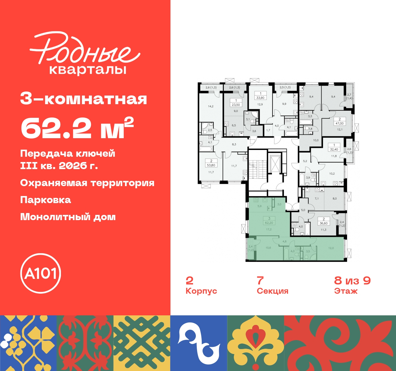 3-комн. квартира с европланировкой в ЖК "Родные кварталы" на 8 этаже. Квартира без отделки, после оформления собственности можно делать ремонт. Общая площадь: 62.2 кв.м., жилая: 39.8 кв.м., суммарная площадь гостиной-столовой с кухонной зоной: 23.1 кв.м. Европейская планировка, площадь комнат позволяет разместить в них все необходимое, а в просторной кухне-гостиной удобно как готовить, так и отдыхать. Квартира - распашонка, без проходных комнат, окна выходят на paзные стороны дома. В квартире одна лоджия, два совмещенных санузла. Высота потолков 2.9 м. Дом монолитный, многоподъездный, высотой 9 этажей. Квартира находится в 7-й секции в корпусе 2. На этаже 7 квартир. В подъезде 1 грузовой лифт. Начало строительства - 4 квартал 2023 года. Окончание строительства - 3 квартал 2026 года. Оформление сделки по договору долевого участия. Артикул квартиры по базе застройщика 96К-2-329. ПРЕДЛОЖЕНИЯ ОТ ЗАСТРОЙЩИКА В ОКТЯБРЕ 2025: Ипотека от 13,9 % для всех! На весь срок. "Семейная ипотека" вернулась. Ставка от 3,5 % на весь срок! Без удорожания! Выгодное ипотечное комбо: Ипотека от 2200 р./мес. и от 6 % после рождения ребёнка! Ипотека для всех "Держи пять!" - ставка 5 % на 2 года! *более подробную информацию по скидкам и акциям уточняйте в отделе продаж Новый жилой комплекс "Родные кварталы" строится в уютной, экологически благополучной локации на юго-западе столицы. В ближайшем окружении – ухоженные малоэтажные посёлки и живописный Ульяновский лесопарк. Благодаря этому из окон откроются вдохновляющие виды, которые не исчезнут со временем за фасадами многоэтажек. Через весь район пройдёт главный бульвар, который свяжет набережную, жилые кварталы и площади в единое дружелюбное пространство, органично наполненное узнаваемыми элементами культурных традиций разных народов. В жилом комплексе создаются условия для комфортного отдыха и занятий спортом всех жителей. Здесь можно прогуляться и отдохнуть в лесопарке на берегу ручья, позаниматься на тренажёрах под открытым небом и спортивных площадках. Для малышей построят игровые комплексы, развивающие силу, координацию и ловкость. Всего в жилом комплексе будет оборудовано 6 га территории для спокойного отдыха и около 9 га — для активного. Подъезды в домах освещены в любое время суток, входы и вестибюль хорошо просматриваются с улицы. Витражное остекление обеспечивает приток естественного света днём, а вечером зажигаются светильники. В отделке домов используется сочетание вентилируемого фасада с облицовкой из фибробетонной плитки и штукатуркой. Комфортная высота домов соразмерна человеку и в среднем составляет 10 этажей. Все дома обеспечены собственными подземными паркингами. В них размещаются машино-места и кладовые. В паркинг или кладовую можно спуститься на лифте или по лестнице. В комплексе появятся бытовые сервисы, магазины, аптеки и другие торгово-бытовые объекты. В жилом районе «Родные кварталы» будут построены: - образовательный центр: школа на 1300 учеников и детский сад на 250 малышей, - два детских сада на 200 мест каждый (один из них сдаётся в 1-й очереди). В транспортной доступности уже работают: - школа № 41 и детский сад — по Боровскому шоссе, - школа № 2057 и детский сад — на запад от района, в дер. Марушкино. ЖК «Родные кварталы» строится в Новомосковском округе столицы, в 15 минутах на автомобиле от аэропорта «Внуково». Район обеспеч