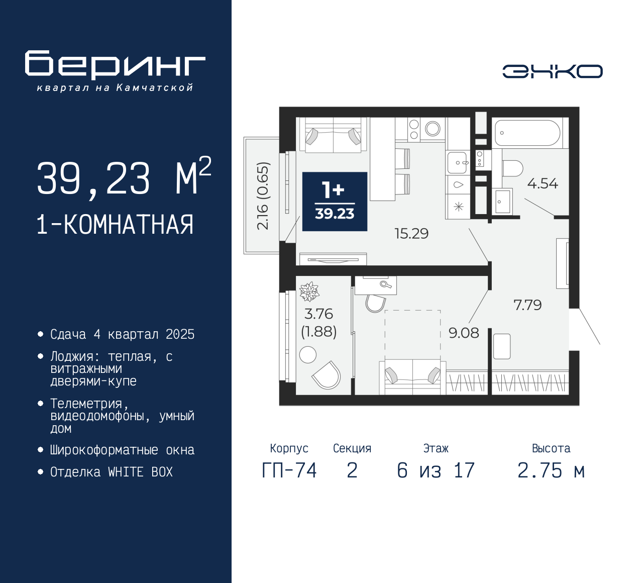 1-комн. квартира в ЖК "Беринг" на 6 этаже. Квартира без отделки, новый владелец может сделать ремонт по своему проекту. Общая площадь: 39.23 кв.м., жилая: 9.08 кв.м., площадь просторной кухни-столовой: 15.29 кв.м. Все окна выходят на одну сторону. В квартире один балкон и одна лоджия, один совмещенный санузел. Высота потолков 2.75 м. Дом монолитный, многоподъездный, переменной этажности, от 9 до 21 этажей. Квартира находится во 2-й секции высотой 17 этажей в корпусе ГП-74. На этаже 7 квартир. В подъезде 1 пассажирский и 1 грузовой лифт. Окончание строительства - 4 квартал 2025 года. Оформление сделки по договору долевого участия. Подобно знаменитому исследователю, мы чувствуем себя первооткрывателями этой локации. Хотим показать новую суть места, сформировать для вас жизненный опыт, которого ещё не было. Беринг — район зелёного цвета. Беринг — район, который откроется вам с другой стороны. Впечатлит новым уровнем комфорта и качеством жизни. Беринг — открытие на карте города. Первый квартал расположен в районе Тура, в границах улиц: Камчатская – Западносибирская – Энтузиастов. Вокруг уже есть всё для того, чтобы ежедневная рутина была лишь частью жизни и не доставляла дискомфорта. Школы и детские сады, магазины и аптеки, поликлиника, места для семейного отдыха, пеших и велопрогулок, и даже рыбалки. Масштабное озеленение дворов — визитная карточка ЭНКО и ваш оазис спокойствия, чтобы отвлечься от повседневности. Раскидистые деревья, кустарники, травы и цветы — осталось остановиться, вдохнуть и расслабиться, глядя на эту природную красоту. Стилистика подъездов продолжает концепцию Беринга, вдохновлённого Камчаткой: сдержанный, но при этом впечатляющий дизайн соседствует с удобством и функциональностью. (AQID02315750)