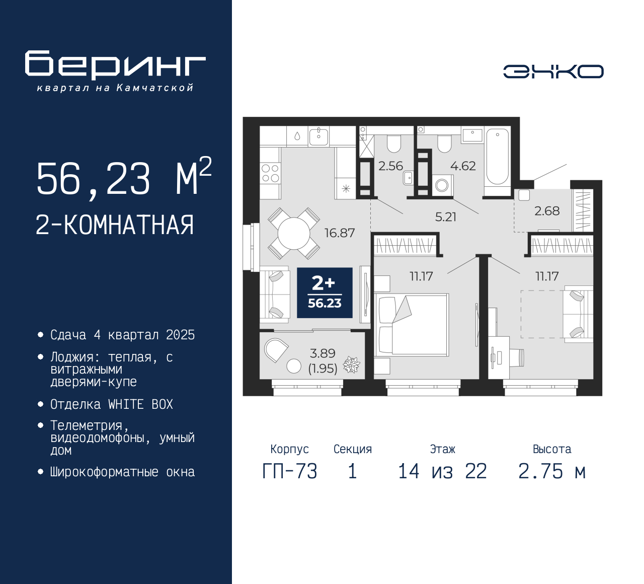 Продается 2-комн. квартира от застройщика в ЖК "Беринг" на 14 этаже. Квартира без отделки, новый собственник может сделать ремонт по индивидуальному дизайн-проекту. Общая площадь: 56.23 кв.м., жилая: 22.34 кв.м., площадь просторной кухни-столовой: 16.87 кв.м. Угловая квартира, очень светлая, естественная вентиляция при открытии окон. В квартире одна лоджия, один совмещенный и один раздельный санузел. Высота потолков 2.75 м. Дом монолитный, многоподъездный, переменной этажности, от 9 до 22 этажей. Квартира находится в 1-й секции высотой 22 этажа в корпусе ГП-73. На этаже 5 квартир. В подъезде 1 пассажирский и 1 грузовой лифт. Окончание строительства - 4 квартал 2025 года. Оформление сделки по договору долевого участия. Подобно знаменитому исследователю, мы чувствуем себя первооткрывателями этой локации. Хотим показать новую суть места, сформировать для вас жизненный опыт, которого ещё не было. Беринг — район зелёного цвета. Беринг — район, который откроется вам с другой стороны. Впечатлит новым уровнем комфорта и качеством жизни. Беринг — открытие на карте города. Первый квартал расположен в районе Тура, в границах улиц: Камчатская – Западносибирская – Энтузиастов. Вокруг уже есть всё для того, чтобы ежедневная рутина была лишь частью жизни и не доставляла дискомфорта. Школы и детские сады, магазины и аптеки, поликлиника, места для семейного отдыха, пеших и велопрогулок, и даже рыбалки. Масштабное озеленение дворов — визитная карточка ЭНКО и ваш оазис спокойствия, чтобы отвлечься от повседневности. Раскидистые деревья, кустарники, травы и цветы — осталось остановиться, вдохнуть и расслабиться, глядя на эту природную красоту. Стилистика подъездов продолжает концепцию Беринга, вдохновлённого Камчаткой: сдержанный, но при этом впечатляющий дизайн соседствует с удобством и функциональностью. (AQID02316038)