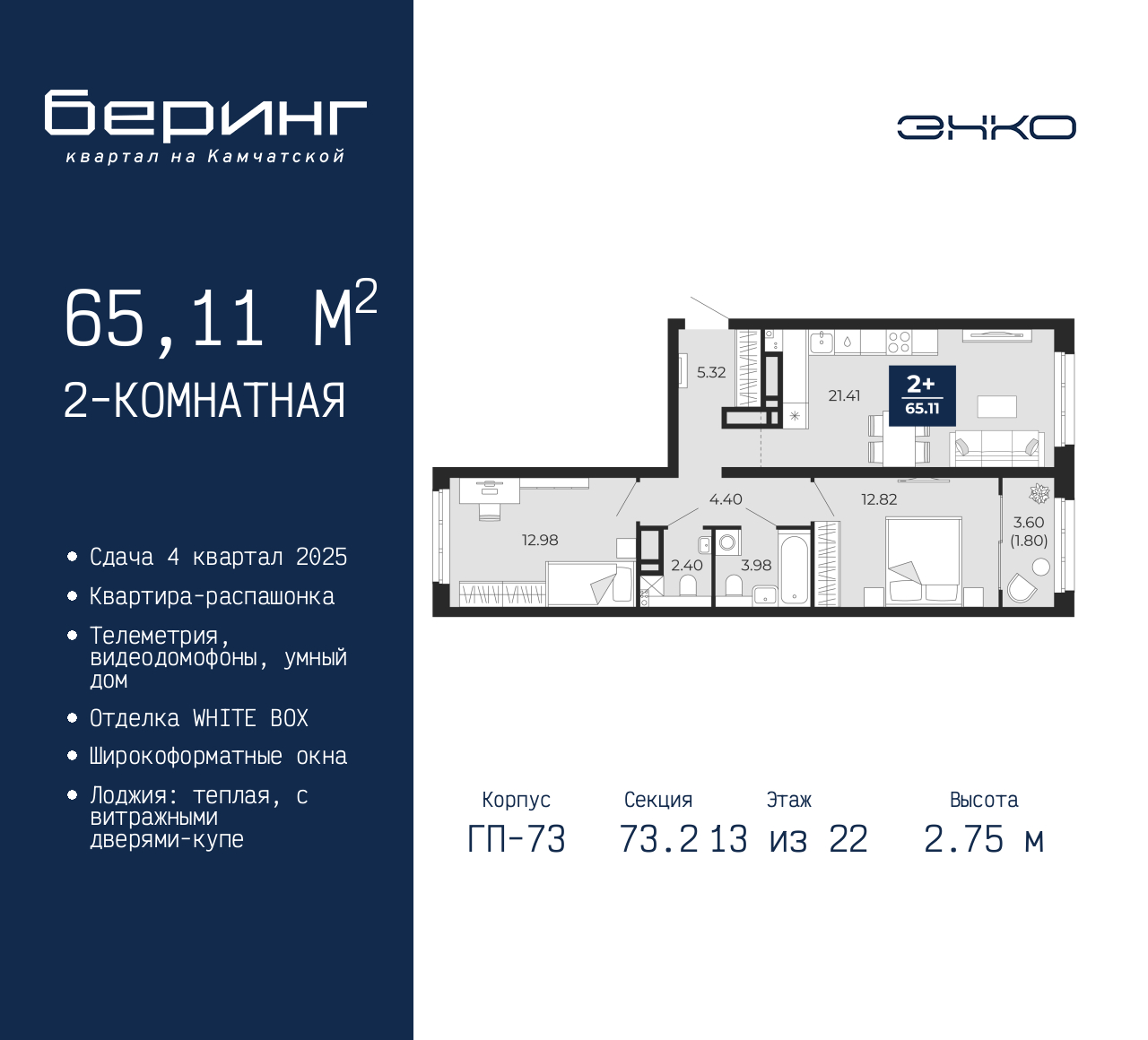 Просторная 2-комн. квартира в ЖК "Беринг" на 13 этаже. Квартира без отделки, новый собственник может сделать ремонт по своему дизайн-проекту. Общая площадь: 65.11 кв.м., жилая: 25.8 кв.м., площадь просторной кухни-столовой: 21.41 кв.м. Квартира - распашонка, без проходных комнат, окна выходят на paзные стороны дома. В квартире одна лоджия, один совмещенный и один раздельный санузел. Высота потолков 2.75 м. Дом монолитный, многоподъездный, переменной этажности, от 9 до 22 этажей. Квартира находится в 73.2-й секции высотой 22 этажа в корпусе ГП-73. На этаже 7 квартир. В подъезде 1 пассажирский и 1 грузовой лифт. Окончание строительства - 4 квартал 2025 года. Оформление сделки по договору долевого участия. Подобно знаменитому исследователю, мы чувствуем себя первооткрывателями этой локации. Хотим показать новую суть места, сформировать для вас жизненный опыт, которого ещё не было. Беринг — район зелёного цвета. Беринг — район, который откроется вам с другой стороны. Впечатлит новым уровнем комфорта и качеством жизни. Беринг — открытие на карте города. Первый квартал расположен в районе Тура, в границах улиц: Камчатская – Западносибирская – Энтузиастов. Вокруг уже есть всё для того, чтобы ежедневная рутина была лишь частью жизни и не доставляла дискомфорта. Школы и детские сады, магазины и аптеки, поликлиника, места для семейного отдыха, пеших и велопрогулок, и даже рыбалки. Масштабное озеленение дворов — визитная карточка ЭНКО и ваш оазис спокойствия, чтобы отвлечься от повседневности. Раскидистые деревья, кустарники, травы и цветы — осталось остановиться, вдохнуть и расслабиться, глядя на эту природную красоту. Стилистика подъездов продолжает концепцию Беринга, вдохновлённого Камчаткой: сдержанный, но при этом впечатляющий дизайн соседствует с удобством и функциональностью. (AQID02316129)