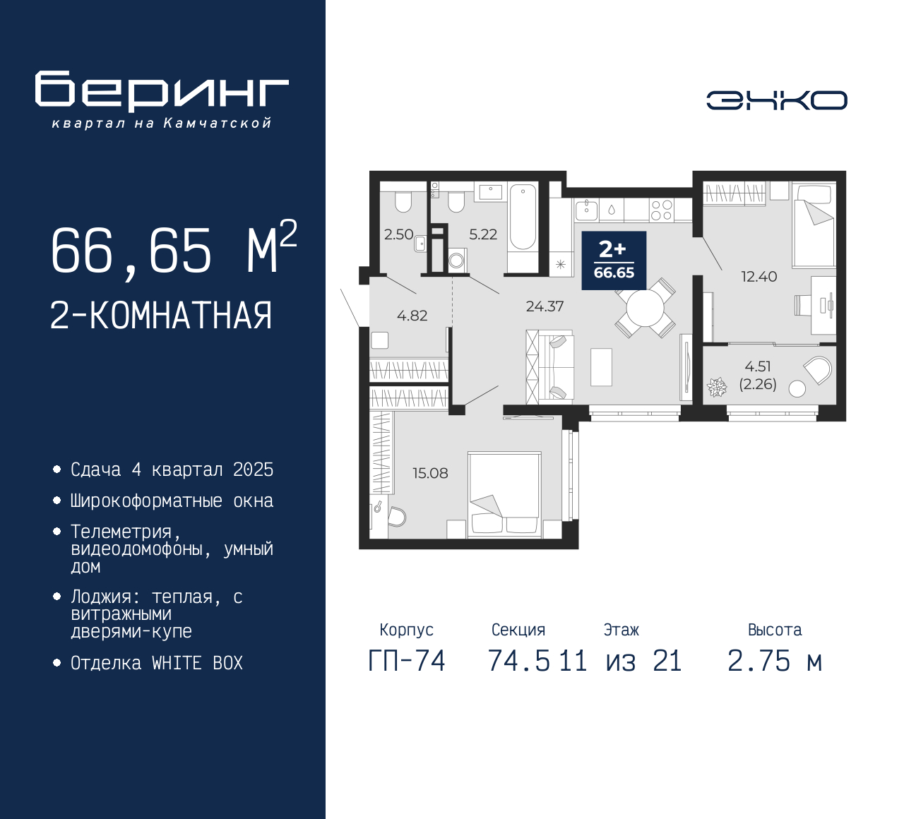 2-комн. квартира в ЖК "Беринг" на 11 этаже. Квартира без отделки, после выдачи ключей можно делать ремонт. Общая площадь: 66.65 кв.м., жилая: 27.48 кв.м., площадь просторной кухни-столовой: 24.37 кв.м. Угловая квартира, очень светлая, естественная вентиляция при открытии окон. В квартире одна лоджия, один совмещенный и один раздельный санузел. Высота потолков 2.75 м. Дом монолитный, многоподъездный, переменной этажности, от 9 до 21 этажей. Квартира находится в 74.5-й секции высотой 21 этаж в корпусе ГП-74. На этаже 7 квартир. В подъезде 1 пассажирский и 1 грузовой лифт. Окончание строительства - 4 квартал 2025 года. Оформление сделки по договору долевого участия. Подобно знаменитому исследователю, мы чувствуем себя первооткрывателями этой локации. Хотим показать новую суть места, сформировать для вас жизненный опыт, которого ещё не было. Беринг — район зелёного цвета. Беринг — район, который откроется вам с другой стороны. Впечатлит новым уровнем комфорта и качеством жизни. Беринг — открытие на карте города. Первый квартал расположен в районе Тура, в границах улиц: Камчатская – Западносибирская – Энтузиастов. Вокруг уже есть всё для того, чтобы ежедневная рутина была лишь частью жизни и не доставляла дискомфорта. Школы и детские сады, магазины и аптеки, поликлиника, места для семейного отдыха, пеших и велопрогулок, и даже рыбалки. Масштабное озеленение дворов — визитная карточка ЭНКО и ваш оазис спокойствия, чтобы отвлечься от повседневности. Раскидистые деревья, кустарники, травы и цветы — осталось остановиться, вдохнуть и расслабиться, глядя на эту природную красоту. Стилистика подъездов продолжает концепцию Беринга, вдохновлённого Камчаткой: сдержанный, но при этом впечатляющий дизайн соседствует с удобством и функциональностью. (AQID02316136)