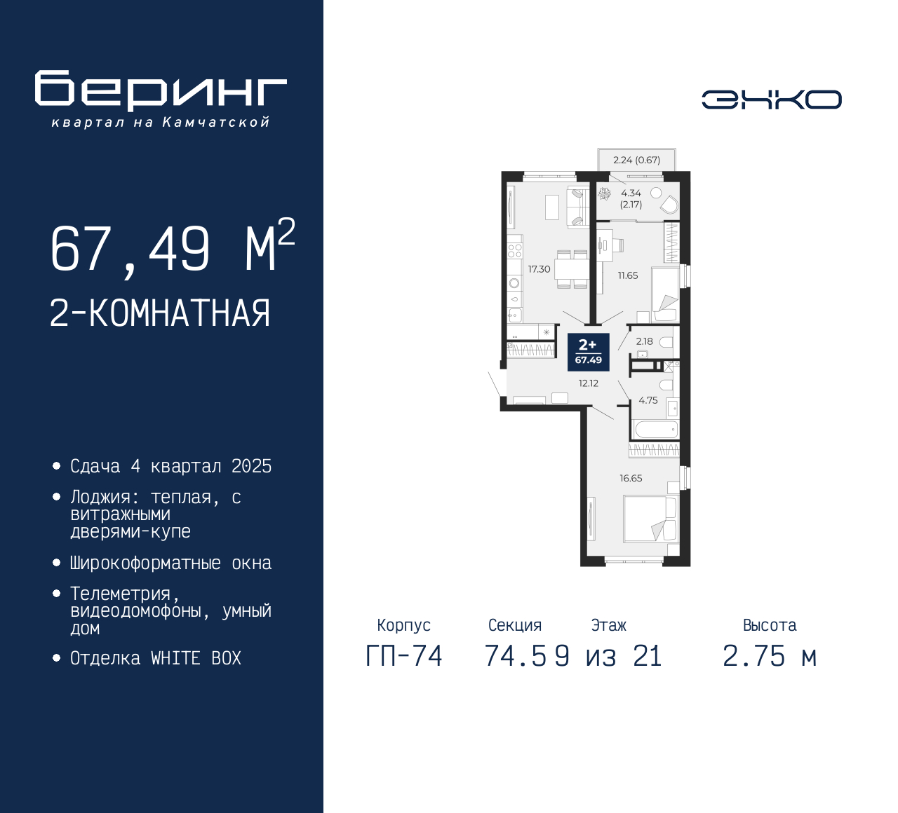2-комн. квартира в ЖК "Беринг" на 9 этаже. Квартира без отделки, после получения ключей можно делать ремонт. Общая площадь: 67.49 кв.м., жилая: 28.3 кв.м., площадь просторной кухни-столовой: 17.3 кв.м. Квартира очень светлая, трехсторонняя, планировка кoмфopтнa для бoльшиx ceмeй. В квартире один балкон и одна лоджия, один совмещенный и один раздельный санузел. Высота потолков 2.75 м. Дом монолитный, многоподъездный, переменной этажности, от 9 до 21 этажей. Квартира находится в 74.5-й секции высотой 21 этаж в корпусе ГП-74. На этаже 7 квартир. В подъезде 1 пассажирский и 1 грузовой лифт. Окончание строительства - 4 квартал 2025 года. Оформление сделки по договору долевого участия. Подобно знаменитому исследователю, мы чувствуем себя первооткрывателями этой локации. Хотим показать новую суть места, сформировать для вас жизненный опыт, которого ещё не было. Беринг — район зелёного цвета. Беринг — район, который откроется вам с другой стороны. Впечатлит новым уровнем комфорта и качеством жизни. Беринг — открытие на карте города. Первый квартал расположен в районе Тура, в границах улиц: Камчатская – Западносибирская – Энтузиастов. Вокруг уже есть всё для того, чтобы ежедневная рутина была лишь частью жизни и не доставляла дискомфорта. Школы и детские сады, магазины и аптеки, поликлиника, места для семейного отдыха, пеших и велопрогулок, и даже рыбалки. Масштабное озеленение дворов — визитная карточка ЭНКО и ваш оазис спокойствия, чтобы отвлечься от повседневности. Раскидистые деревья, кустарники, травы и цветы — осталось остановиться, вдохнуть и расслабиться, глядя на эту природную красоту. Стилистика подъездов продолжает концепцию Беринга, вдохновлённого Камчаткой: сдержанный, но при этом впечатляющий дизайн соседствует с удобством и функциональностью. (AQID02316206)