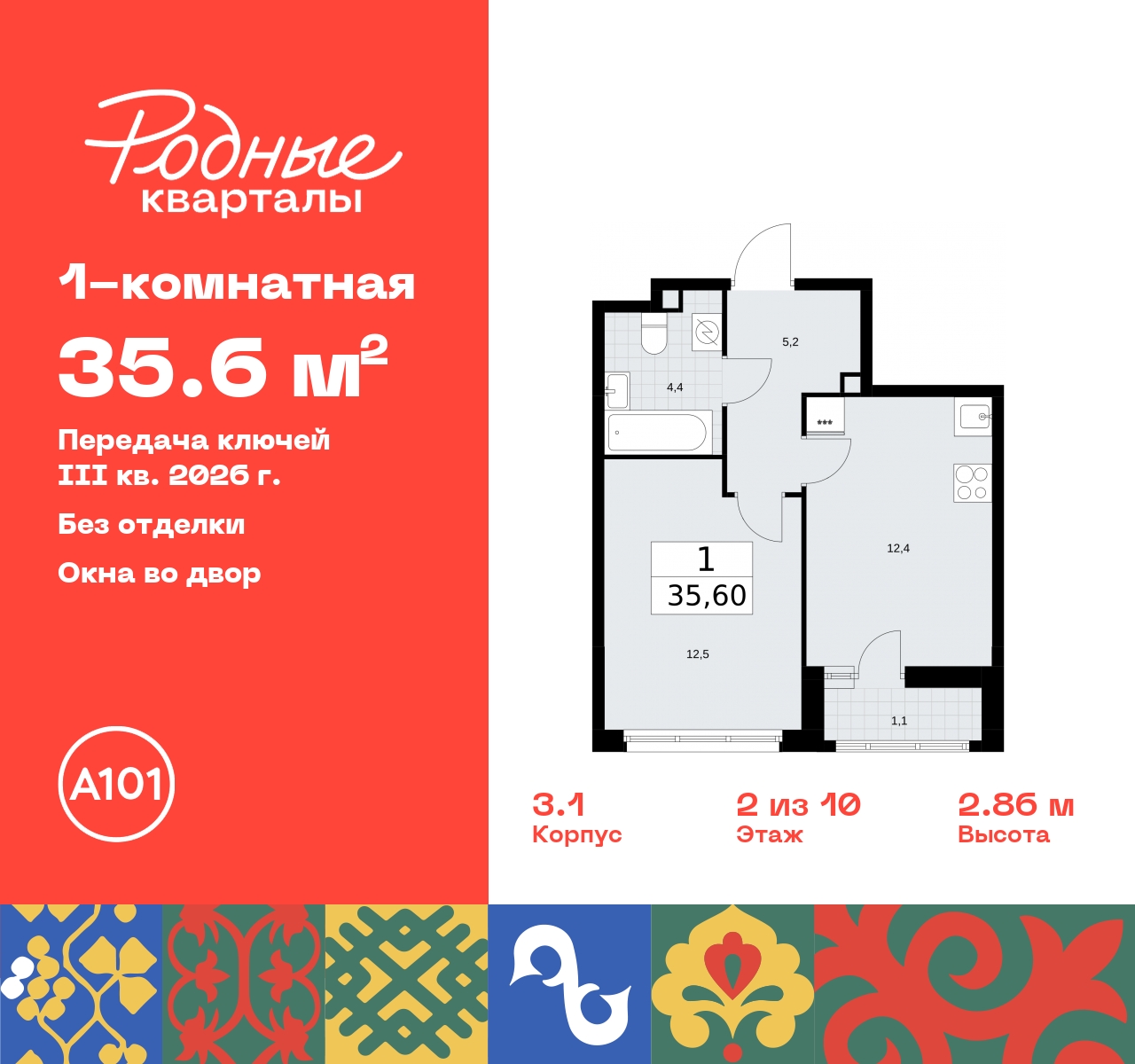 1-комн. квартира в ЖК "Родные кварталы" на 2 этаже. Квартира без отделки, полностью готова к ремонту. Общая площадь: 35.6 кв.м., жилая: 12.5 кв.м., площадь просторной кухни-столовой: 12.4 кв.м. Все окна выходят на одну сторону. В квартире одна лоджия, один совмещенный санузел. Высота потолков 2.95 м. Дом монолитный, черырехподъездный, высотой 10 этажей. Квартира находится в 1-й секции в корпусе 3.1. На этаже 5 квартир. В подъезде 1 грузовой лифт. Начало строительства - 2 квартал 2024 года. Окончание строительства - 3 квартал 2026 года. Оформление сделки по договору долевого участия. Артикул квартиры по базе застройщика 96К-3.1-3. ПРЕДЛОЖЕНИЯ ОТ ЗАСТРОЙЩИКА В ОКТЯБРЕ 2025: Ипотека от 13,9 % для всех! На весь срок. "Семейная ипотека" вернулась. Ставка от 3,5 % на весь срок! Без удорожания! Выгодное ипотечное комбо: Ипотека от 2200 р./мес. и от 6 % после рождения ребёнка! Ипотека для всех "Держи пять!" - ставка 5 % на 2 года! *более подробную информацию по скидкам и акциям уточняйте в отделе продаж Новый жилой комплекс "Родные кварталы" строится в уютной, экологически благополучной локации на юго-западе столицы. В ближайшем окружении – ухоженные малоэтажные посёлки и живописный Ульяновский лесопарк. Благодаря этому из окон откроются вдохновляющие виды, которые не исчезнут со временем за фасадами многоэтажек. Через весь район пройдёт главный бульвар, который свяжет набережную, жилые кварталы и площади в единое дружелюбное пространство, органично наполненное узнаваемыми элементами культурных традиций разных народов. В жилом комплексе создаются условия для комфортного отдыха и занятий спортом всех жителей. Здесь можно прогуляться и отдохнуть в лесопарке на берегу ручья, позаниматься на тренажёрах под открытым небом и спортивных площадках. Для малышей построят игровые комплексы, развивающие силу, координацию и ловкость. Всего в жилом комплексе будет оборудовано 6 га территории для спокойного отдыха и около 9 га — для активного. Подъезды в домах освещены в любое время суток, входы и вестибюль хорошо просматриваются с улицы. Витражное остекление обеспечивает приток естественного света днём, а вечером зажигаются светильники. В отделке домов используется сочетание вентилируемого фасада с облицовкой из фибробетонной плитки и штукатуркой. Комфортная высота домов соразмерна человеку и в среднем составляет 10 этажей. Все дома обеспечены собственными подземными паркингами. В них размещаются машино-места и кладовые. В паркинг или кладовую можно спуститься на лифте или по лестнице. В комплексе появятся бытовые сервисы, магазины, аптеки и другие торгово-бытовые объекты. В жилом районе «Родные кварталы» будут построены: - образовательный центр: школа на 1300 учеников и детский сад на 250 малышей, - два детских сада на 200 мест каждый (один из них сдаётся в 1-й очереди). В транспортной доступности уже работают: - школа № 41 и детский сад — по Боровскому шоссе, - школа № 2057 и детский сад — на запад от района, в дер. Марушкино. ЖК «Родные кварталы» строится в Новомосковском округе столицы, в 15 минутах на автомобиле от аэропорта «Внуково». Район обеспечен удобными выездами на три крупные современные автотрассы. Здесь уже работает и активно развивается система наземного общественного транспорта, включая междугородние рейсы. Интенсивное развитие локации обеспечивают две действующие станции крупных 