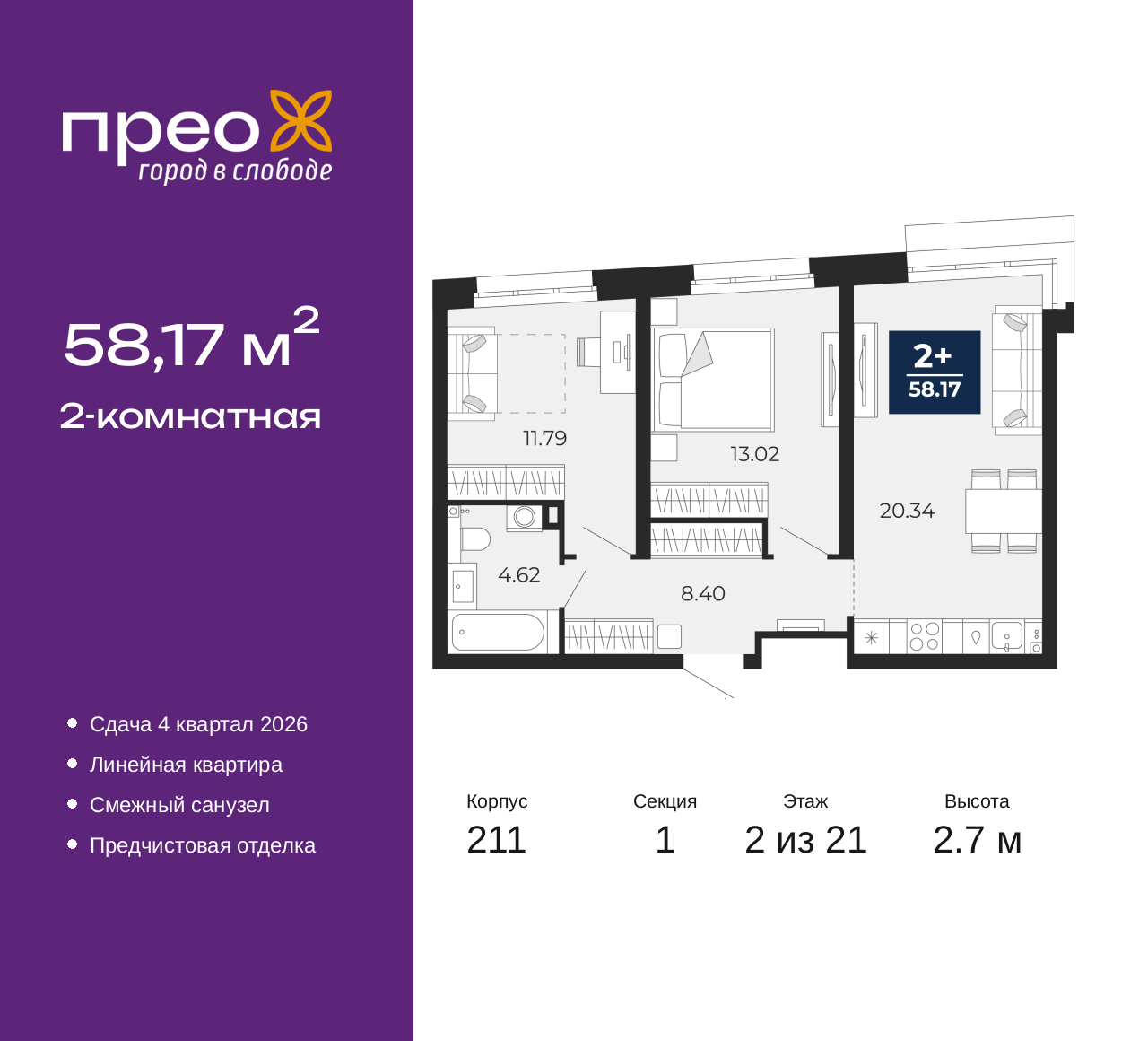 Просторная 2-комн. квартира с предчистовой отделкой в ЖК "Прео" на 2 этаже. Общая площадь: 58.17 кв.м., жилая: 24.81 кв.м., площадь просторной кухни-столовой: 20.34 кв.м. Комнаты изолированные, все окна выходят на одну сторону. В квартире один совмещенный санузел. Высота потолков 2.7 м. Дом монолитный, черырехподъездный, переменной этажности, от 14 до 21 этажей. Квартира находится в 1-й секции высотой 21 этаж в корпусе 211. На этаже 8 квартир. В подъезде 1 пассажирский и 1 грузовой лифт. Окончание строительства - 4 квартал 2026 года. Оформление сделки по договору долевого участия. Преображенский — один из самых привлекательных районов для жизни! Это полностью самостоятельный жилой район с точки зрения инфраструктуры. Преображенский находится между Московским и Червишевским трактами в квартале улиц Закалужская — Вьюжная — Александра Протозанова. Не нужно ждать, когда появится инфраструктура — переезжайте на всё готовое. Вблизи расположены действующие школа и детский сад. В этом году откроется еще один сад, а в следующем году — школа. По соседству с Преображенским запланировано строительство городского парка «Комарово» площадью 38 гектар. За 10 минут можно доехать на автомобиле до крупных ТРЦ: «Лента», «Кристалл», «Леруа Мерлен», «Метро» и «Ашан». С 2018 года в районе открыт Соседский центр — пространство, созданное для формирования добрососедской среды, совместного досуга, общения и реализации соседских инициатив. Здесь проходят встречи соседей, а также сами жители района организовывают мероприятия. Организатором такого события может стать любой желающий. В квартирах выполнена качественная предчистовая отделка. Гладкие стены с финишным выравниванием по маякам. Ровный потолок для установки натяжного потолка. Установлены пятикамерные окна с двойным стеклопакетом (3 стекла). Дизайнерские холлы с видеонаблюдением, безбарьерным и прозрачным входом – всегда светло и спокойно. На первом этаже есть просторные колясочные, где все жители могут оставлять свои коляски и велосипеды. В Преображенском есть всё, что нужно для активного отдыха и занятий спортом. Мы сделали большое футбольное поле с безопасным покрытием. Также установили хоккейный корт, который оборудован по всем необходимым стандартам. Во дворах можно делать упражнения на специальных площадках с турниками. Весь район мы обустроили велодорожками, которые связаны в единый маршрут. У нас есть сухие фонтаны, бьющие из земли, деревья, веревки, сетки, скалодром, газон, песок и резинка — осталось просто дать своему ребенку право на свободную игру. По-настоящему хорошие дворы — это те, которые дети предпочитают соцсетям и телевизору. Аккредитация в банках: «Сбербанк России», ПАО «Газпромбанк», ПАО «Банк Уралсиб», ПАО Банк «ВТБ», ОАО «Альфа-Банк» и других. (AQID02427624)