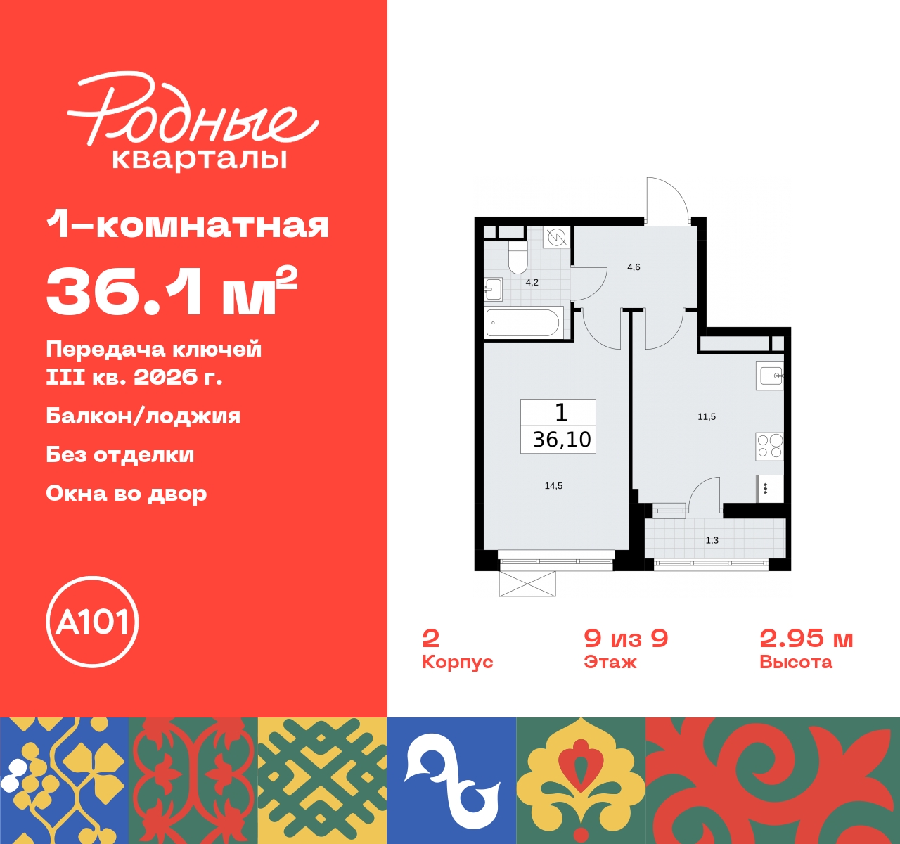 1-комн. квартира в ЖК "Родные кварталы" на 9 этаже. Квартира без отделки, новый владелец может сделать ремонт по своему дизайн-проекту. Общая площадь: 36.1 кв.м., жилая: 14.5 кв.м., площадь просторной кухни-столовой: 11.5 кв.м. Все окна выходят на одну сторону. В квартире одна лоджия, один совмещенный санузел. Высота потолков 2.9 м. Дом монолитный, многоподъездный, высотой 9 этажей. Квартира находится в 3-й секции в корпусе 2. На этаже 5 квартир. В подъезде 1 грузовой лифт. Начало строительства - 4 квартал 2023 года. Окончание строительства - 3 квартал 2026 года. Оформление сделки по договору долевого участия. Артикул квартиры по базе застройщика 96К-2-143. ПРЕДЛОЖЕНИЯ ОТ ЗАСТРОЙЩИКА В ОКТЯБРЕ 2025: Ипотека от 13,9 % для всех! На весь срок. "Семейная ипотека" вернулась. Ставка от 3,5 % на весь срок! Без удорожания! Выгодное ипотечное комбо: Ипотека от 2200 р./мес. и от 6 % после рождения ребёнка! Ипотека для всех "Держи пять!" - ставка 5 % на 2 года! *более подробную информацию по скидкам и акциям уточняйте в отделе продаж Новый жилой комплекс "Родные кварталы" строится в уютной, экологически благополучной локации на юго-западе столицы. В ближайшем окружении – ухоженные малоэтажные посёлки и живописный Ульяновский лесопарк. Благодаря этому из окон откроются вдохновляющие виды, которые не исчезнут со временем за фасадами многоэтажек. Через весь район пройдёт главный бульвар, который свяжет набережную, жилые кварталы и площади в единое дружелюбное пространство, органично наполненное узнаваемыми элементами культурных традиций разных народов. В жилом комплексе создаются условия для комфортного отдыха и занятий спортом всех жителей. Здесь можно прогуляться и отдохнуть в лесопарке на берегу ручья, позаниматься на тренажёрах под открытым небом и спортивных площадках. Для малышей построят игровые комплексы, развивающие силу, координацию и ловкость. Всего в жилом комплексе будет оборудовано 6 га территории для спокойного отдыха и около 9 га — для активного. Подъезды в домах освещены в любое время суток, входы и вестибюль хорошо просматриваются с улицы. Витражное остекление обеспечивает приток естественного света днём, а вечером зажигаются светильники. В отделке домов используется сочетание вентилируемого фасада с облицовкой из фибробетонной плитки и штукатуркой. Комфортная высота домов соразмерна человеку и в среднем составляет 10 этажей. Все дома обеспечены собственными подземными паркингами. В них размещаются машино-места и кладовые. В паркинг или кладовую можно спуститься на лифте или по лестнице. В комплексе появятся бытовые сервисы, магазины, аптеки и другие торгово-бытовые объекты. В жилом районе «Родные кварталы» будут построены: - образовательный центр: школа на 1300 учеников и детский сад на 250 малышей, - два детских сада на 200 мест каждый (один из них сдаётся в 1-й очереди). В транспортной доступности уже работают: - школа № 41 и детский сад — по Боровскому шоссе, - школа № 2057 и детский сад — на запад от района, в дер. Марушкино. ЖК «Родные кварталы» строится в Новомосковском округе столицы, в 15 минутах на автомобиле от аэропорта «Внуково». Район обеспечен удобными выездами на три крупные современные автотрассы. Здесь уже работает и активно развивается система наземного общественного транспорта, включая междугородние рейсы. Интенсивное развитие локации обеспечивают две
