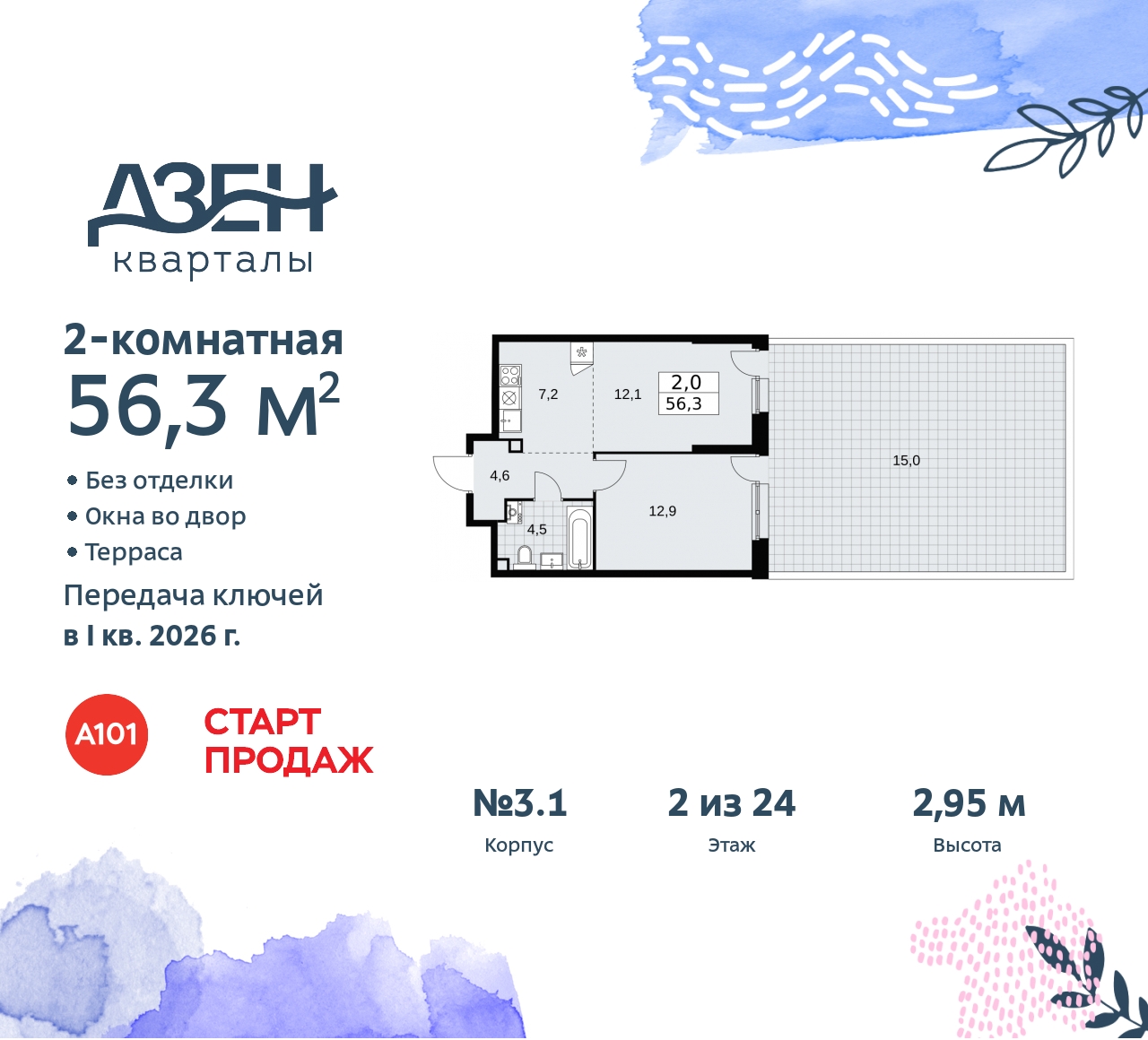 Продается двухкомнатная квартира с европланировкой в ЖК "Дзен-кварталы" на 2 этаже. Квартира без отделки, после оформления собственности можно делать ремонт. Общая площадь: 56.3 кв.м., жилая: 25 кв.м., суммарная площадь гостиной-столовой с кухонной зоной: 19.3 кв.м. Европланировка, зона гостиной комнаты объединена с кухней. Комнаты изолированные, все окна выходят на одну сторону. В квартире один балкон, один совмещенный санузел. Терраса представляет собой роскошную зону отдыха, где вы на свой вкус можете создать атмосферу комфорта и уюта. Высота потолков 2.95 м. Эта квартира предлагается без отделки. Будут установлены стеклопакеты с повышенной тепло- и шумоизоляцией, в квартиру заведены все коммуникации. Вы сможете в полном объеме реализовать ваши идеи обустройства вашего комфортного дома. Квартира находится в корпусе 3.1. Дом монолитный, одноподъездный, высотой 24 этажа. На этаже 10 квартир. В подъезде 1 пассажирский и 2 грузовых лифта. Начало строительства - 3 квартал 2023 года. Окончание строительства - 1 квартал 2026 года. Оформление сделки по договору долевого участия. Артикул квартиры по базе застройщика 41К-3.1-4. В шаговой доступности от дома расположены станции метро (расстояние по прямой): «Новомосковская (Коммунарка)» (800 м), «Новомосковская» (800 м), «Потапово» (1.1 км), также недалеко от этого корпуса расположены станции метро: «Коммунарка», «Улица Горчакова», «Бульвар адмирала Ушакова», «Ольховая», «Бунинская аллея». ПРЕДЛОЖЕНИЯ ОТ ЗАСТРОЙЩИКА В ОКТЯБРЕ 2025: Ипотека от 13,9 % для всех! На весь срок. "Семейная ипотека" вернулась. Ставка от 3,5 % на весь срок! Без удорожания! Выгодное ипотечное комбо: Ипотека от 2200 р./мес. и от 6 % после рождения ребёнка! Ипотека для всех "Держи пять!" - ставка 5 % на 2 года! *более подробную информацию по скидкам и акциям уточняйте в отделе продаж Новый район «Дзен-кварталы» возводится на юго-западе столицы – вдоль береговой линии живописного Ивановского пруда и реки Варварки. В основе проекта – «сочетание несочетаемого», гармония простого и утончённого, природного и урбанистического – стиль Japandi, объединяющий скандинавскую функциональность и восточную созерцательность. В приятном соседстве с домами нового района живописный Ивановский пруд — его береговая линия проходит по территории «Дзен-кварталов». Здесь будет благоустроена набережная для отдыха жителей нового района — по авторскому проекту Группы компаний «А101». На территории района появятся два детских сада и крупный образовательный комплекс, в состав которого войдут детский сад и школа. Все они будут спроектированы на основе собственной концепции образовательной среды ГК «А101», разработанной экспертами в области педагогики, детский психологии и эргономики учебных пространств. Фасадные решения выполнены в современном архитектурном стиле, основанном на сочетании японского минимализма и скандинавской функциональности. Использованы природные оттенки спокойного японского пейзажа, материалы, имитирующие натуральные поверхности – штукатурка, облицовочная плитка разных размеров и текстур. Подобный стилистический подход делает пространство созерцательными и гармоничным. Для комфортного хранения габаритных и сезонных вещей на уровне подземного этажа спланированы удобные кладовые помещения. Доступ в них осуществляется на лифте. Отличная транспортная до