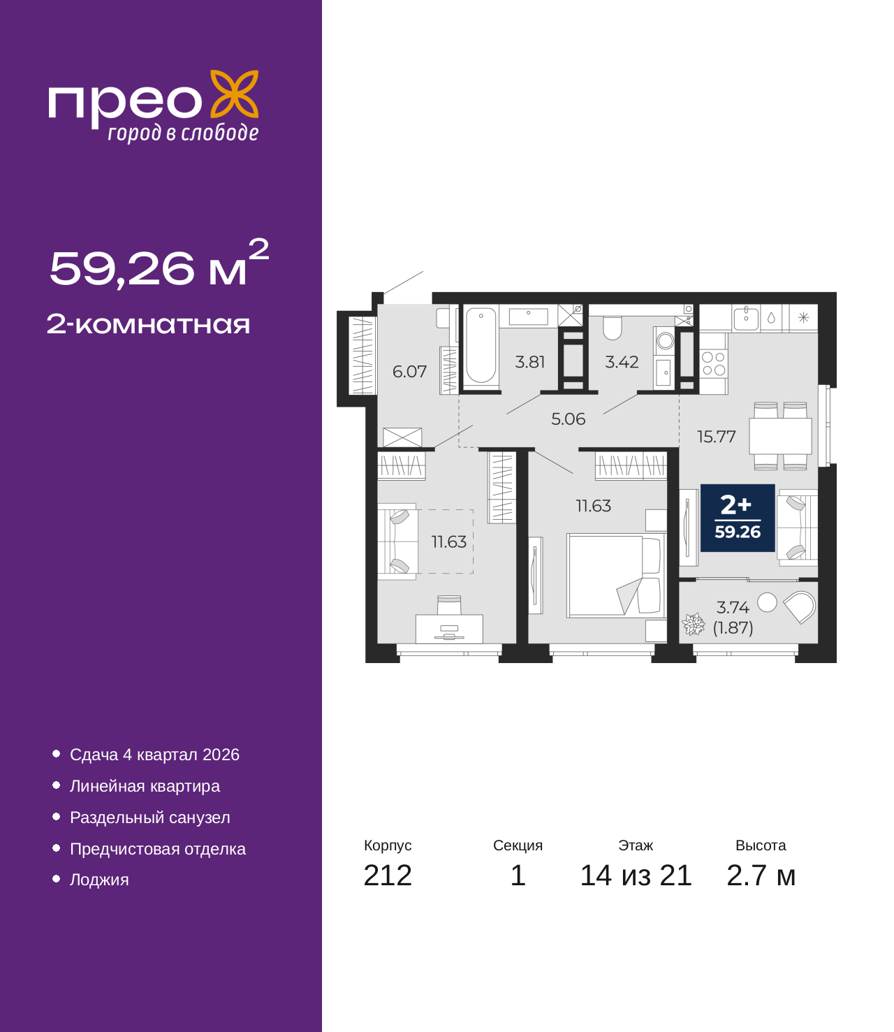 Просторная 2-комн. квартира с предчистовой отделкой в ЖК "Прео" на 14 этаже. Общая площадь: 59.26 кв.м., жилая: 23.26 кв.м., площадь просторной кухни-столовой: 15.77 кв.м. Комнаты изолированные, все окна выходят на одну сторону. В квартире одна лоджия, один раздельный санузел. Высота потолков 2.7 м. Квартира находится в корпусе 212. Дом монолитный, одноподъездный, высотой 21 этаж. На этаже 8 квартир. В подъезде 2 пассажирских и 1 грузовой лифт. Окончание строительства - 4 квартал 2026 года. Оформление сделки по договору долевого участия. Преображенский — один из самых привлекательных районов для жизни! Это полностью самостоятельный жилой район с точки зрения инфраструктуры. Преображенский находится между Московским и Червишевским трактами в квартале улиц Закалужская — Вьюжная — Александра Протозанова. Не нужно ждать, когда появится инфраструктура — переезжайте на всё готовое. Вблизи расположены действующие школа и детский сад. В этом году откроется еще один сад, а в следующем году — школа. По соседству с Преображенским запланировано строительство городского парка «Комарово» площадью 38 гектар. За 10 минут можно доехать на автомобиле до крупных ТРЦ: «Лента», «Кристалл», «Леруа Мерлен», «Метро» и «Ашан». С 2018 года в районе открыт Соседский центр — пространство, созданное для формирования добрососедской среды, совместного досуга, общения и реализации соседских инициатив. Здесь проходят встречи соседей, а также сами жители района организовывают мероприятия. Организатором такого события может стать любой желающий. В квартирах выполнена качественная предчистовая отделка. Гладкие стены с финишным выравниванием по маякам. Ровный потолок для установки натяжного потолка. Установлены пятикамерные окна с двойным стеклопакетом (3 стекла). Дизайнерские холлы с видеонаблюдением, безбарьерным и прозрачным входом – всегда светло и спокойно. На первом этаже есть просторные колясочные, где все жители могут оставлять свои коляски и велосипеды. В Преображенском есть всё, что нужно для активного отдыха и занятий спортом. Мы сделали большое футбольное поле с безопасным покрытием. Также установили хоккейный корт, который оборудован по всем необходимым стандартам. Во дворах можно делать упражнения на специальных площадках с турниками. Весь район мы обустроили велодорожками, которые связаны в единый маршрут. У нас есть сухие фонтаны, бьющие из земли, деревья, веревки, сетки, скалодром, газон, песок и резинка — осталось просто дать своему ребенку право на свободную игру. По-настоящему хорошие дворы — это те, которые дети предпочитают соцсетям и телевизору. Аккредитация в банках: ПАО Банк «ВТБ», ПАО «Банк Уралсиб», ОАО «Альфа-Банк», «Сбербанк России», ПАО «Газпромбанк» и других. (AQID02427632)