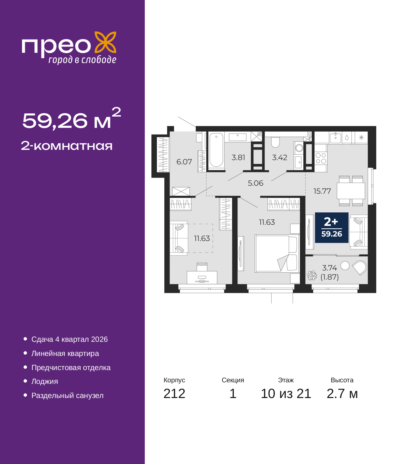 Продается 2-комн. квартира с предчистовой отделкой в ЖК "Прео" на 10 этаже. Общая площадь: 59.26 кв.м., жилая: 23.26 кв.м., площадь просторной кухни-столовой: 15.77 кв.м. Комнаты изолированные, все окна выходят на одну сторону. В квартире одна лоджия, один раздельный санузел. Высота потолков 2.7 м. Квартира находится в корпусе 212. Дом монолитный, одноподъездный, высотой 21 этаж. На этаже 8 квартир. В подъезде 2 пассажирских и 1 грузовой лифт. Окончание строительства - 4 квартал 2026 года. Оформление сделки по договору долевого участия. Преображенский — один из самых привлекательных районов для жизни! Это полностью самостоятельный жилой район с точки зрения инфраструктуры. Преображенский находится между Московским и Червишевским трактами в квартале улиц Закалужская — Вьюжная — Александра Протозанова. Не нужно ждать, когда появится инфраструктура — переезжайте на всё готовое. Вблизи расположены действующие школа и детский сад. В этом году откроется еще один сад, а в следующем году — школа. По соседству с Преображенским запланировано строительство городского парка «Комарово» площадью 38 гектар. За 10 минут можно доехать на автомобиле до крупных ТРЦ: «Лента», «Кристалл», «Леруа Мерлен», «Метро» и «Ашан». С 2018 года в районе открыт Соседский центр — пространство, созданное для формирования добрососедской среды, совместного досуга, общения и реализации соседских инициатив. Здесь проходят встречи соседей, а также сами жители района организовывают мероприятия. Организатором такого события может стать любой желающий. В квартирах выполнена качественная предчистовая отделка. Гладкие стены с финишным выравниванием по маякам. Ровный потолок для установки натяжного потолка. Установлены пятикамерные окна с двойным стеклопакетом (3 стекла). Дизайнерские холлы с видеонаблюдением, безбарьерным и прозрачным входом – всегда светло и спокойно. На первом этаже есть просторные колясочные, где все жители могут оставлять свои коляски и велосипеды. В Преображенском есть всё, что нужно для активного отдыха и занятий спортом. Мы сделали большое футбольное поле с безопасным покрытием. Также установили хоккейный корт, который оборудован по всем необходимым стандартам. Во дворах можно делать упражнения на специальных площадках с турниками. Весь район мы обустроили велодорожками, которые связаны в единый маршрут. У нас есть сухие фонтаны, бьющие из земли, деревья, веревки, сетки, скалодром, газон, песок и резинка — осталось просто дать своему ребенку право на свободную игру. По-настоящему хорошие дворы — это те, которые дети предпочитают соцсетям и телевизору. Аккредитация в банках: ОАО «Альфа-Банк», ПАО Банк «ВТБ», ПАО «Банк Уралсиб», ПАО «Газпромбанк», «Сбербанк России» и других. (AQID02427634)