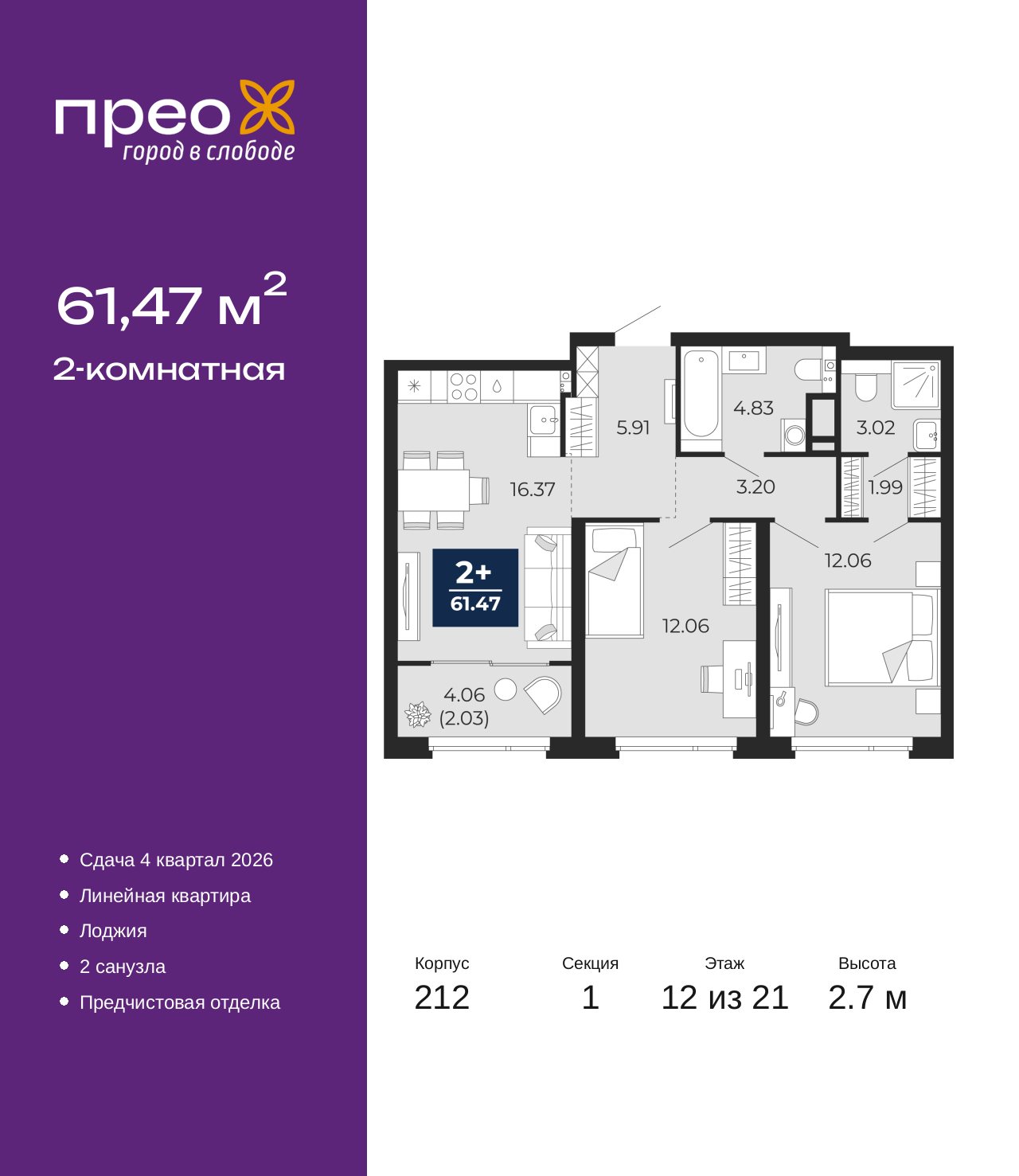 Двухкомнатная квартира от застройщика с предчистовой отделкой в ЖК "Прео" на 12 этаже. Общая площадь: 61.47 кв.м., жилая: 24.12 кв.м., площадь просторной кухни-столовой: 16.37 кв.м. Комнаты изолированные, все окна выходят на одну сторону. В квартире одна лоджия, два совмещенных санузла. Высота потолков 2.7 м. Квартира находится в корпусе 212. Дом монолитный, одноподъездный, высотой 21 этаж. На этаже 8 квартир. В подъезде 2 пассажирских и 1 грузовой лифт. Окончание строительства - 4 квартал 2026 года. Оформление сделки по договору долевого участия. Преображенский — один из самых привлекательных районов для жизни! Это полностью самостоятельный жилой район с точки зрения инфраструктуры. Преображенский находится между Московским и Червишевским трактами в квартале улиц Закалужская — Вьюжная — Александра Протозанова. Не нужно ждать, когда появится инфраструктура — переезжайте на всё готовое. Вблизи расположены действующие школа и детский сад. В этом году откроется еще один сад, а в следующем году — школа. По соседству с Преображенским запланировано строительство городского парка «Комарово» площадью 38 гектар. За 10 минут можно доехать на автомобиле до крупных ТРЦ: «Лента», «Кристалл», «Леруа Мерлен», «Метро» и «Ашан». С 2018 года в районе открыт Соседский центр — пространство, созданное для формирования добрососедской среды, совместного досуга, общения и реализации соседских инициатив. Здесь проходят встречи соседей, а также сами жители района организовывают мероприятия. Организатором такого события может стать любой желающий. В квартирах выполнена качественная предчистовая отделка. Гладкие стены с финишным выравниванием по маякам. Ровный потолок для установки натяжного потолка. Установлены пятикамерные окна с двойным стеклопакетом (3 стекла). Дизайнерские холлы с видеонаблюдением, безбарьерным и прозрачным входом – всегда светло и спокойно. На первом этаже есть просторные колясочные, где все жители могут оставлять свои коляски и велосипеды. В Преображенском есть всё, что нужно для активного отдыха и занятий спортом. Мы сделали большое футбольное поле с безопасным покрытием. Также установили хоккейный корт, который оборудован по всем необходимым стандартам. Во дворах можно делать упражнения на специальных площадках с турниками. Весь район мы обустроили велодорожками, которые связаны в единый маршрут. У нас есть сухие фонтаны, бьющие из земли, деревья, веревки, сетки, скалодром, газон, песок и резинка — осталось просто дать своему ребенку право на свободную игру. По-настоящему хорошие дворы — это те, которые дети предпочитают соцсетям и телевизору. Аккредитация в банках: ПАО «Газпромбанк», «Сбербанк России», ПАО Банк «ВТБ», ОАО «Альфа-Банк», ПАО «Банк Уралсиб» и других. (AQID02427648)
