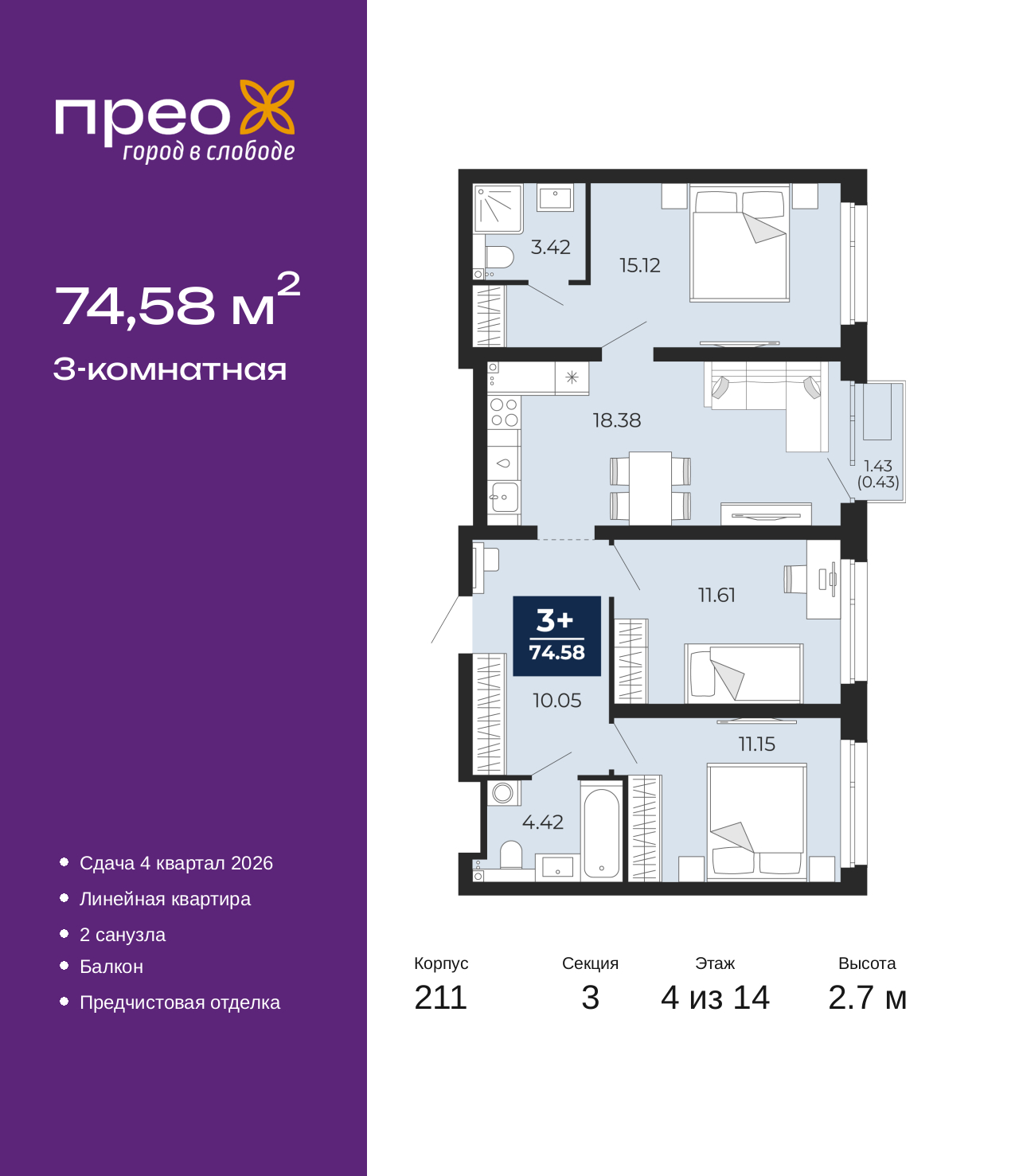 Продается трехкомнатная квартира с предчистовой отделкой в ЖК "Прео" на 4 этаже. Общая площадь: 74.58 кв.м., жилая: 37.88 кв.м., площадь просторной кухни-столовой: 18.38 кв.м. Комнаты изолированные, все окна выходят на одну сторону. В квартире один балкон, два совмещенных санузла. Высота потолков 2.7 м. Дом монолитный, черырехподъездный, переменной этажности, от 14 до 21 этажей. Квартира находится в 3-й секции высотой 14 этажей в корпусе 211. На этаже 6 квартир. В подъезде 1 пассажирский и 1 грузовой лифт. Окончание строительства - 4 квартал 2026 года. Оформление сделки по договору долевого участия. Преображенский — один из самых привлекательных районов для жизни! Это полностью самостоятельный жилой район с точки зрения инфраструктуры. Преображенский находится между Московским и Червишевским трактами в квартале улиц Закалужская — Вьюжная — Александра Протозанова. Не нужно ждать, когда появится инфраструктура — переезжайте на всё готовое. Вблизи расположены действующие школа и детский сад. В этом году откроется еще один сад, а в следующем году — школа. По соседству с Преображенским запланировано строительство городского парка «Комарово» площадью 38 гектар. За 10 минут можно доехать на автомобиле до крупных ТРЦ: «Лента», «Кристалл», «Леруа Мерлен», «Метро» и «Ашан». С 2018 года в районе открыт Соседский центр — пространство, созданное для формирования добрососедской среды, совместного досуга, общения и реализации соседских инициатив. Здесь проходят встречи соседей, а также сами жители района организовывают мероприятия. Организатором такого события может стать любой желающий. В квартирах выполнена качественная предчистовая отделка. Гладкие стены с финишным выравниванием по маякам. Ровный потолок для установки натяжного потолка. Установлены пятикамерные окна с двойным стеклопакетом (3 стекла). Дизайнерские холлы с видеонаблюдением, безбарьерным и прозрачным входом – всегда светло и спокойно. На первом этаже есть просторные колясочные, где все жители могут оставлять свои коляски и велосипеды. В Преображенском есть всё, что нужно для активного отдыха и занятий спортом. Мы сделали большое футбольное поле с безопасным покрытием. Также установили хоккейный корт, который оборудован по всем необходимым стандартам. Во дворах можно делать упражнения на специальных площадках с турниками. Весь район мы обустроили велодорожками, которые связаны в единый маршрут. У нас есть сухие фонтаны, бьющие из земли, деревья, веревки, сетки, скалодром, газон, песок и резинка — осталось просто дать своему ребенку право на свободную игру. По-настоящему хорошие дворы — это те, которые дети предпочитают соцсетям и телевизору. Аккредитация в банках: ПАО «Газпромбанк», ПАО Банк «ВТБ», ОАО «Альфа-Банк», ПАО «Банк Уралсиб», «Сбербанк России» и других. (AQID02427711)