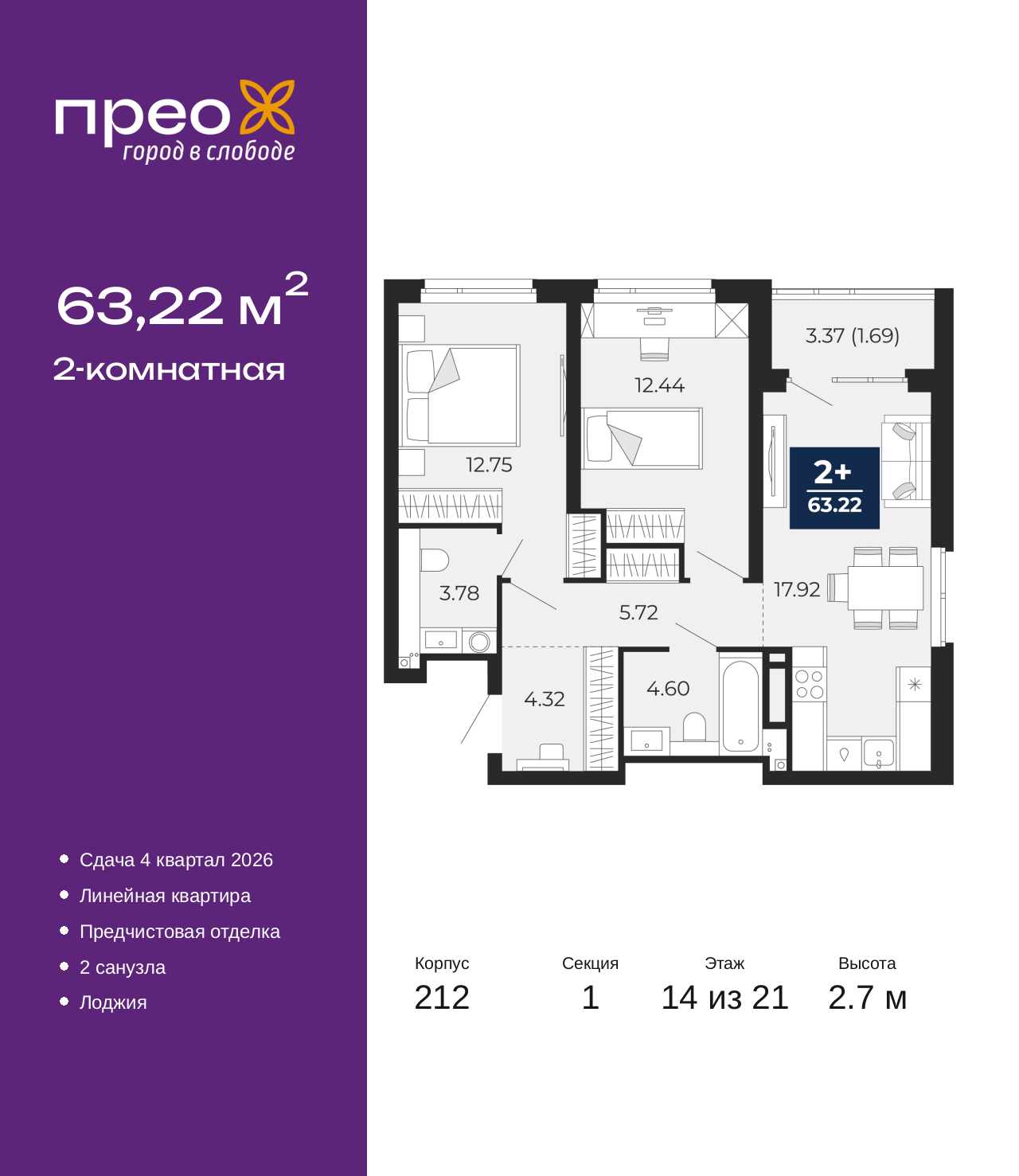 2-комн. квартира с предчистовой отделкой в ЖК "Прео" на 14 этаже. Общая площадь: 63.22 кв.м., жилая: 25.19 кв.м., площадь просторной кухни-столовой: 17.92 кв.м. Комнаты изолированные, все окна выходят на одну сторону. В квартире одна лоджия, один совмещенный и один раздельный санузел. Высота потолков 2.7 м. Квартира находится в корпусе 212. Дом монолитный, одноподъездный, высотой 21 этаж. На этаже 8 квартир. В подъезде 2 пассажирских и 1 грузовой лифт. Окончание строительства - 4 квартал 2026 года. Оформление сделки по договору долевого участия. Преображенский — один из самых привлекательных районов для жизни! Это полностью самостоятельный жилой район с точки зрения инфраструктуры. Преображенский находится между Московским и Червишевским трактами в квартале улиц Закалужская — Вьюжная — Александра Протозанова. Не нужно ждать, когда появится инфраструктура — переезжайте на всё готовое. Вблизи расположены действующие школа и детский сад. В этом году откроется еще один сад, а в следующем году — школа. По соседству с Преображенским запланировано строительство городского парка «Комарово» площадью 38 гектар. За 10 минут можно доехать на автомобиле до крупных ТРЦ: «Лента», «Кристалл», «Леруа Мерлен», «Метро» и «Ашан». С 2018 года в районе открыт Соседский центр — пространство, созданное для формирования добрососедской среды, совместного досуга, общения и реализации соседских инициатив. Здесь проходят встречи соседей, а также сами жители района организовывают мероприятия. Организатором такого события может стать любой желающий. В квартирах выполнена качественная предчистовая отделка. Гладкие стены с финишным выравниванием по маякам. Ровный потолок для установки натяжного потолка. Установлены пятикамерные окна с двойным стеклопакетом (3 стекла). Дизайнерские холлы с видеонаблюдением, безбарьерным и прозрачным входом – всегда светло и спокойно. На первом этаже есть просторные колясочные, где все жители могут оставлять свои коляски и велосипеды. В Преображенском есть всё, что нужно для активного отдыха и занятий спортом. Мы сделали большое футбольное поле с безопасным покрытием. Также установили хоккейный корт, который оборудован по всем необходимым стандартам. Во дворах можно делать упражнения на специальных площадках с турниками. Весь район мы обустроили велодорожками, которые связаны в единый маршрут. У нас есть сухие фонтаны, бьющие из земли, деревья, веревки, сетки, скалодром, газон, песок и резинка — осталось просто дать своему ребенку право на свободную игру. По-настоящему хорошие дворы — это те, которые дети предпочитают соцсетям и телевизору. Аккредитация в банках: ПАО Банк «ВТБ», ПАО «Газпромбанк», «Сбербанк России», ПАО «Банк Уралсиб», ОАО «Альфа-Банк» и других. (AQID02427673)