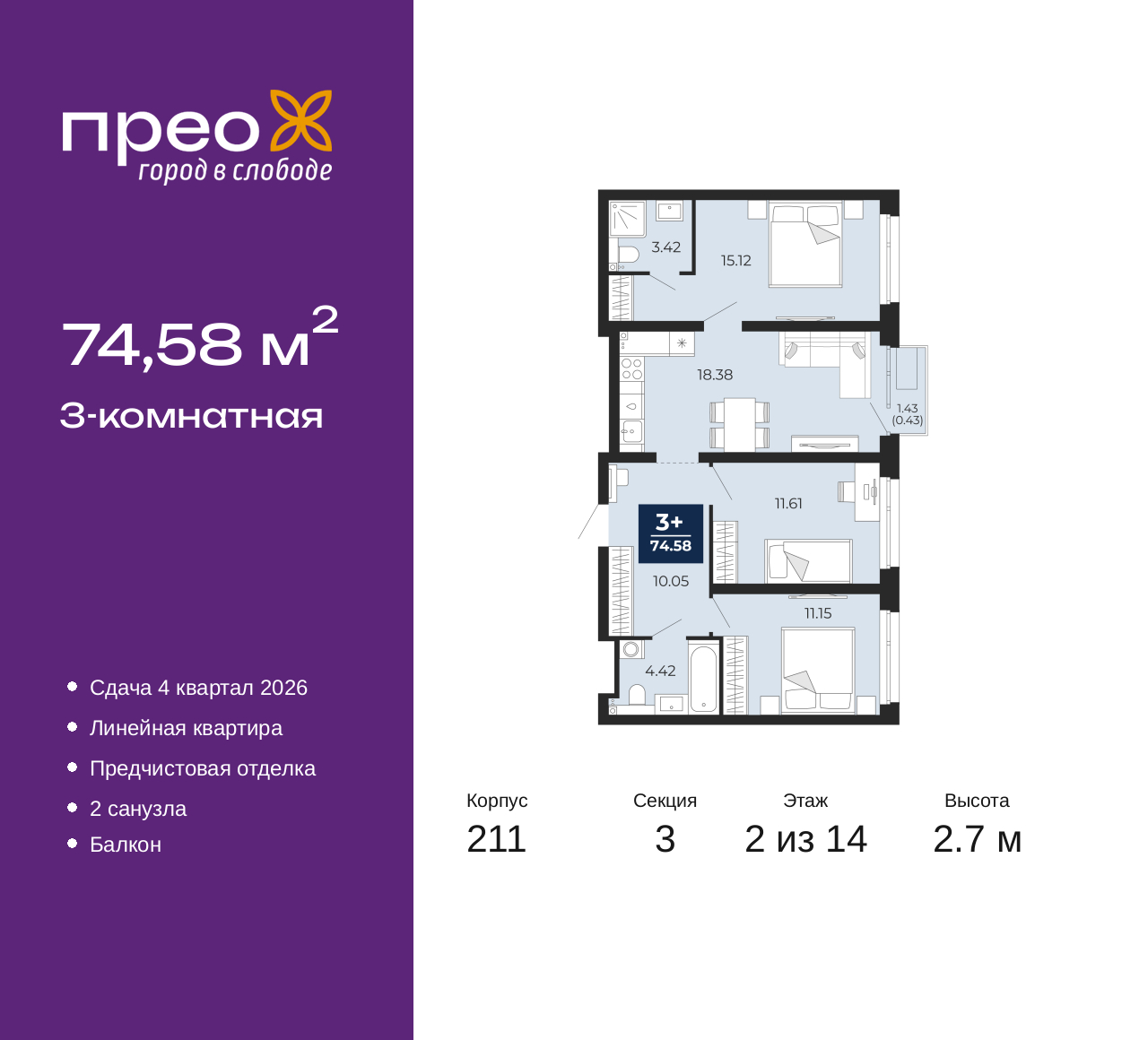 Продается трехкомнатная квартира с предчистовой отделкой в ЖК "Прео" на 2 этаже. Общая площадь: 74.58 кв.м., жилая: 37.88 кв.м., площадь просторной кухни-столовой: 18.38 кв.м. Комнаты изолированные, все окна выходят на одну сторону. В квартире один балкон, два совмещенных санузла. Высота потолков 2.7 м. Дом монолитный, черырехподъездный, переменной этажности, от 14 до 21 этажей. Квартира находится в 3-й секции высотой 14 этажей в корпусе 211. На этаже 6 квартир. В подъезде 1 пассажирский и 1 грузовой лифт. Окончание строительства - 4 квартал 2026 года. Оформление сделки по договору долевого участия. Преображенский — один из самых привлекательных районов для жизни! Это полностью самостоятельный жилой район с точки зрения инфраструктуры. Преображенский находится между Московским и Червишевским трактами в квартале улиц Закалужская — Вьюжная — Александра Протозанова. Не нужно ждать, когда появится инфраструктура — переезжайте на всё готовое. Вблизи расположены действующие школа и детский сад. В этом году откроется еще один сад, а в следующем году — школа. По соседству с Преображенским запланировано строительство городского парка «Комарово» площадью 38 гектар. За 10 минут можно доехать на автомобиле до крупных ТРЦ: «Лента», «Кристалл», «Леруа Мерлен», «Метро» и «Ашан». С 2018 года в районе открыт Соседский центр — пространство, созданное для формирования добрососедской среды, совместного досуга, общения и реализации соседских инициатив. Здесь проходят встречи соседей, а также сами жители района организовывают мероприятия. Организатором такого события может стать любой желающий. В квартирах выполнена качественная предчистовая отделка. Гладкие стены с финишным выравниванием по маякам. Ровный потолок для установки натяжного потолка. Установлены пятикамерные окна с двойным стеклопакетом (3 стекла). Дизайнерские холлы с видеонаблюдением, безбарьерным и прозрачным входом – всегда светло и спокойно. На первом этаже есть просторные колясочные, где все жители могут оставлять свои коляски и велосипеды. В Преображенском есть всё, что нужно для активного отдыха и занятий спортом. Мы сделали большое футбольное поле с безопасным покрытием. Также установили хоккейный корт, который оборудован по всем необходимым стандартам. Во дворах можно делать упражнения на специальных площадках с турниками. Весь район мы обустроили велодорожками, которые связаны в единый маршрут. У нас есть сухие фонтаны, бьющие из земли, деревья, веревки, сетки, скалодром, газон, песок и резинка — осталось просто дать своему ребенку право на свободную игру. По-настоящему хорошие дворы — это те, которые дети предпочитают соцсетям и телевизору. Аккредитация в банках: ПАО «Газпромбанк», ПАО «Банк Уралсиб», «Сбербанк России», ПАО Банк «ВТБ», ОАО «Альфа-Банк» и других. (AQID02427708)