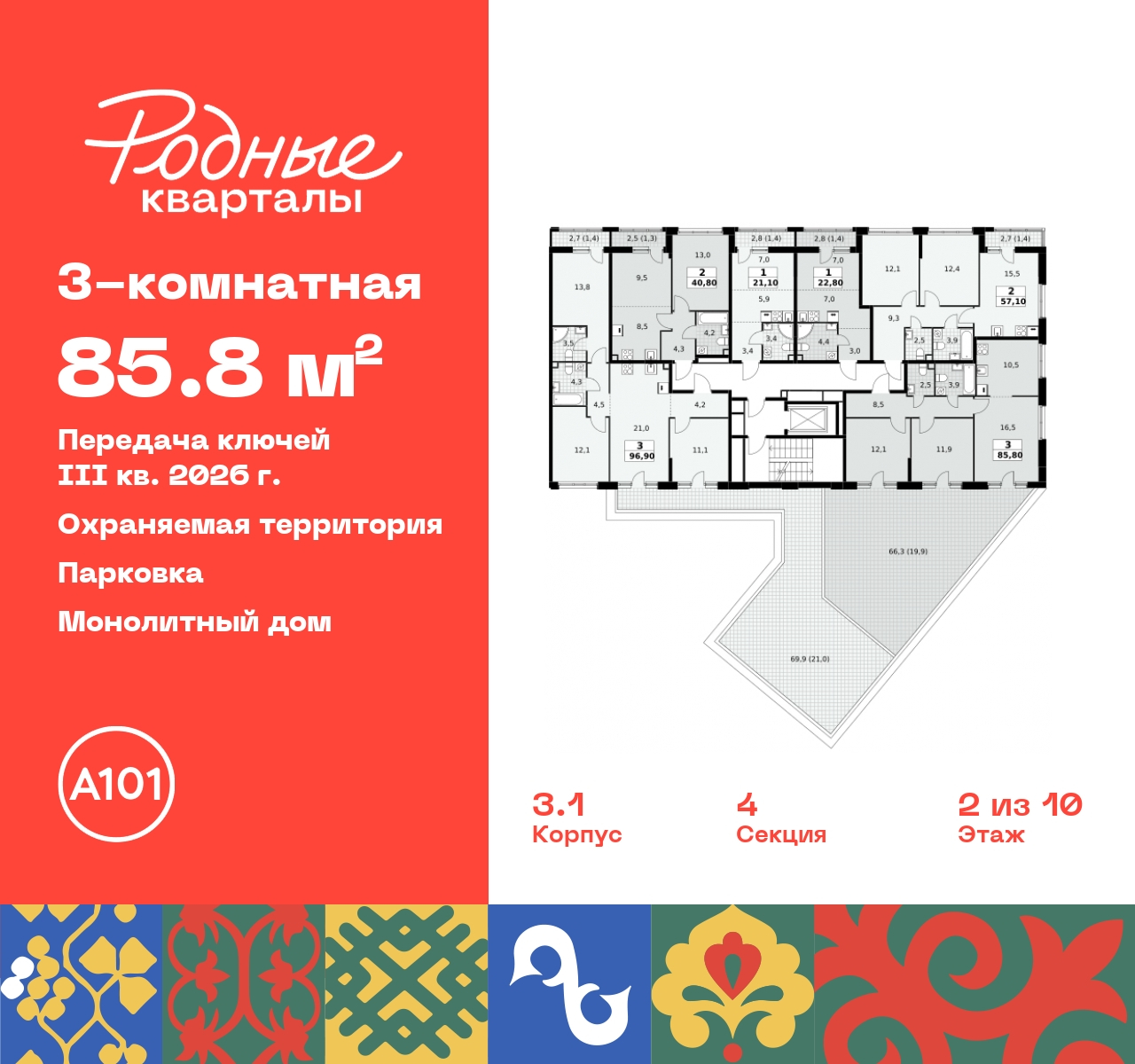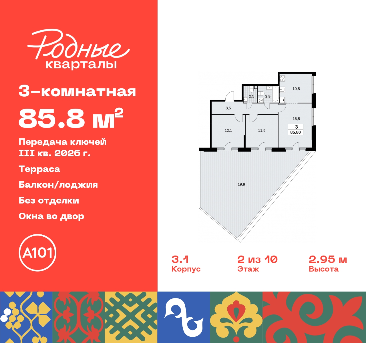 3-комн. квартира в ЖК "Родные кварталы" на 2 этаже. Квартира без отделки, после оформления собственности можно делать ремонт. Общая площадь: 85.8 кв.м., жилая: 40.5 кв.м., площадь просторной кухни-столовой: 10.5 кв.м. Угловая квартира, очень светлая, естественная вентиляция при открытии окон. В квартире один балкон, один совмещенный и один раздельный санузел. Терраса представляет собой роскошную зону отдыха, где вы на свой вкус можете создать атмосферу комфорта и уюта. Высота потолков 2.95 м. Дом монолитный, черырехподъездный, высотой 10 этажей. Квартира находится в 4-й секции в корпусе 3.1. На этаже 6 квартир. В подъезде 1 грузовой лифт. Начало строительства - 2 квартал 2024 года. Окончание строительства - 3 квартал 2026 года. Оформление сделки по договору долевого участия. Артикул квартиры по базе застройщика 96К-3.1-141. Новый жилой комплекс "Родные кварталы" строится в уютной, экологически благополучной локации на юго-западе столицы. В ближайшем окружении – ухоженные малоэтажные посёлки и живописный Ульяновский лесопарк. Благодаря этому из окон откроются вдохновляющие виды, которые не исчезнут со временем за фасадами многоэтажек. Через весь район пройдёт главный бульвар, который свяжет набережную, жилые кварталы и площади в единое дружелюбное пространство, органично наполненное узнаваемыми элементами культурных традиций разных народов. В жилом комплексе создаются условия для комфортного отдыха и занятий спортом всех жителей. Здесь можно прогуляться и отдохнуть в лесопарке на берегу ручья, позаниматься на тренажёрах под открытым небом и спортивных площадках. Для малышей построят игровые комплексы, развивающие силу, координацию и ловкость. Всего в жилом комплексе будет оборудовано 6 га территории для спокойного отдыха и около 9 га — для активного. Подъезды в домах освещены в любое время суток, входы и вестибюль хорошо просматриваются с улицы. Витражное остекление обеспечивает приток естественного света днём, а вечером зажигаются светильники. В отделке домов используется сочетание вентилируемого фасада с облицовкой из фибробетонной плитки и штукатуркой. Комфортная высота домов соразмерна человеку и в среднем составляет 10 этажей. Все дома обеспечены собственными подземными паркингами. В них размещаются машино-места и кладовые. В паркинг или кладовую можно спуститься на лифте или по лестнице. В комплексе появятся бытовые сервисы, магазины, аптеки и другие торгово-бытовые объекты. В жилом районе «Родные кварталы» будут построены: - образовательный центр: школа на 1300 учеников и детский сад на 250 малышей, - два детских сада на 200 мест каждый (один из них сдаётся в 1-й очереди). В транспортной доступности уже работают: - школа № 41 и детский сад — по Боровскому шоссе, - школа № 2057 и детский сад — на запад от района, в дер. Марушкино. ЖК «Родные кварталы» строится в Новомосковском округе столицы, в 15 минутах на автомобиле от аэропорта «Внуково». Район обеспечен удобными выездами на три крупные современные автотрассы. Здесь уже работает и активно развивается система наземного общественного транспорта, включая междугородние рейсы. Интенсивное развитие локации обеспечивают две действующие станции крупных транспортных линий: метро (станция «Внуково») и МЦД (станция «Толстопальцево»). (AQID02438180)