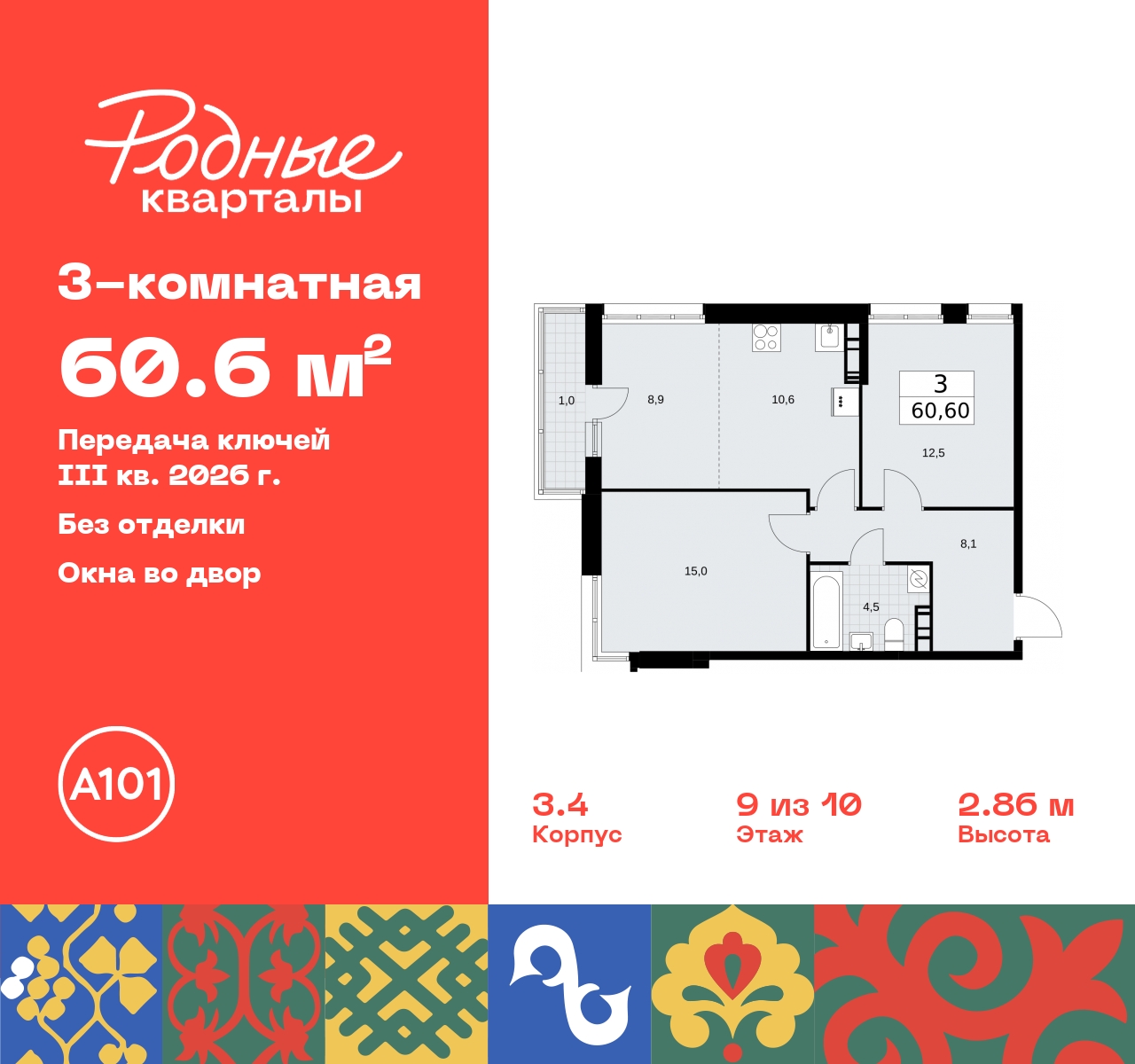 Продается трехкомнатная квартира с европланировкой от застройщика в ЖК "Родные кварталы" на 9 этаже. Квартира без отделки, после оформления собственности можно делать ремонт. Общая площадь: 60.6 кв.м., жилая: 36.9 кв.м., суммарная площадь гостиной-столовой с кухонной зоной: 18.6 кв.м. Европейская планировка, кухня-гостиная - идеальный вариант для тех, кто любит часто принимать гостей. Квартира угловая, идеально подойдет любителям тишины и панорамных видов. В квартире один балкон, два совмещенных санузла. Высота потолков 2.95 м. Квартира находится в корпусе 3.4. Дом монолитный, одноподъездный, высотой 10 этажей. На этаже 7 квартир. В подъезде 1 пассажирский и 1 грузовой лифт. Начало строительства - 2 квартал 2024 года. Окончание строительства - 3 квартал 2026 года. Оформление сделки по договору долевого участия. Артикул квартиры по базе застройщика 96К-3.4-526. Новый жилой комплекс "Родные кварталы" строится в уютной, экологически благополучной локации на юго-западе столицы. В ближайшем окружении – ухоженные малоэтажные посёлки и живописный Ульяновский лесопарк. Благодаря этому из окон откроются вдохновляющие виды, которые не исчезнут со временем за фасадами многоэтажек. Через весь район пройдёт главный бульвар, который свяжет набережную, жилые кварталы и площади в единое дружелюбное пространство, органично наполненное узнаваемыми элементами культурных традиций разных народов. В жилом комплексе создаются условия для комфортного отдыха и занятий спортом всех жителей. Здесь можно прогуляться и отдохнуть в лесопарке на берегу ручья, позаниматься на тренажёрах под открытым небом и спортивных площадках. Для малышей построят игровые комплексы, развивающие силу, координацию и ловкость. Всего в жилом комплексе будет оборудовано 6 га территории для спокойного отдыха и около 9 га — для активного. Подъезды в домах освещены в любое время суток, входы и вестибюль хорошо просматриваются с улицы. Витражное остекление обеспечивает приток естественного света днём, а вечером зажигаются светильники. В отделке домов используется сочетание вентилируемого фасада с облицовкой из фибробетонной плитки и штукатуркой. Комфортная высота домов соразмерна человеку и в среднем составляет 10 этажей. Все дома обеспечены собственными подземными паркингами. В них размещаются машино-места и кладовые. В паркинг или кладовую можно спуститься на лифте или по лестнице. В комплексе появятся бытовые сервисы, магазины, аптеки и другие торгово-бытовые объекты. В жилом районе «Родные кварталы» будут построены: - образовательный центр: школа на 1300 учеников и детский сад на 250 малышей, - два детских сада на 200 мест каждый (один из них сдаётся в 1-й очереди). В транспортной доступности уже работают: - школа № 41 и детский сад — по Боровскому шоссе, - школа № 2057 и детский сад — на запад от района, в дер. Марушкино. ЖК «Родные кварталы» строится в Новомосковском округе столицы, в 15 минутах на автомобиле от аэропорта «Внуково». Район обеспечен удобными выездами на три крупные современные автотрассы. Здесь уже работает и активно развивается система наземного общественного транспорта, включая междугородние рейсы. Интенсивное развитие локации обеспечивают две действующие станции крупных транспортных линий: метро (станция «Внуково») и МЦД (станция «Толстопальцево»). (AQID02378695)