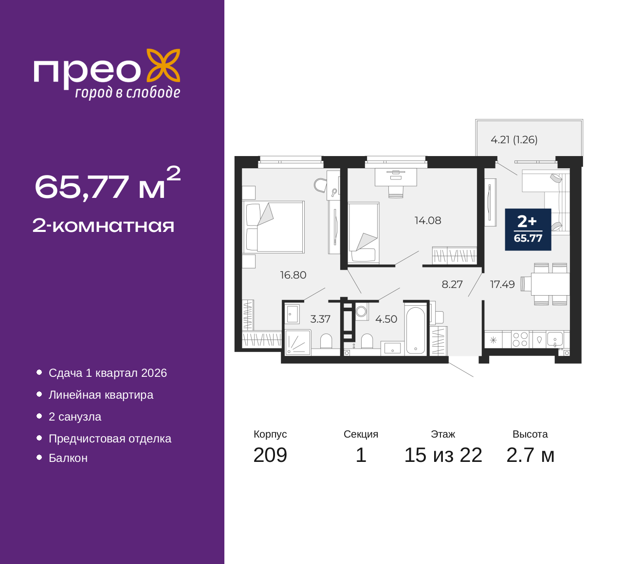 Просторная 2-комн. квартира с предчистовой отделкой в ЖК "Прео" на 15 этаже. Общая площадь: 65.77 кв.м., жилая: 30.88 кв.м., площадь просторной кухни-столовой: 17.49 кв.м. Комнаты изолированные, все окна выходят на одну сторону. В квартире один балкон, два совмещенных санузла. Высота потолков 2.7 м. Квартира находится в корпусе 209. Дом монолитный, одноподъездный, высотой 22 этажа. На этаже 8 квартир. В подъезде 1 пассажирский и 1 грузовой лифт. Окончание строительства - 1 квартал 2026 года. Оформление сделки по договору долевого участия. Преображенский — один из самых привлекательных районов для жизни! Это полностью самостоятельный жилой район с точки зрения инфраструктуры. Преображенский находится между Московским и Червишевским трактами в квартале улиц Закалужская — Вьюжная — Александра Протозанова. Не нужно ждать, когда появится инфраструктура — переезжайте на всё готовое. Вблизи расположены действующие школа и детский сад. В этом году откроется еще один сад, а в следующем году — школа. По соседству с Преображенским запланировано строительство городского парка «Комарово» площадью 38 гектар. За 10 минут можно доехать на автомобиле до крупных ТРЦ: «Лента», «Кристалл», «Леруа Мерлен», «Метро» и «Ашан». С 2018 года в районе открыт Соседский центр — пространство, созданное для формирования добрососедской среды, совместного досуга, общения и реализации соседских инициатив. Здесь проходят встречи соседей, а также сами жители района организовывают мероприятия. Организатором такого события может стать любой желающий. В квартирах выполнена качественная предчистовая отделка. Гладкие стены с финишным выравниванием по маякам. Ровный потолок для установки натяжного потолка. Установлены пятикамерные окна с двойным стеклопакетом (3 стекла). Дизайнерские холлы с видеонаблюдением, безбарьерным и прозрачным входом – всегда светло и спокойно. На первом этаже есть просторные колясочные, где все жители могут оставлять свои коляски и велосипеды. В Преображенском есть всё, что нужно для активного отдыха и занятий спортом. Мы сделали большое футбольное поле с безопасным покрытием. Также установили хоккейный корт, который оборудован по всем необходимым стандартам. Во дворах можно делать упражнения на специальных площадках с турниками. Весь район мы обустроили велодорожками, которые связаны в единый маршрут. У нас есть сухие фонтаны, бьющие из земли, деревья, веревки, сетки, скалодром, газон, песок и резинка — осталось просто дать своему ребенку право на свободную игру. По-настоящему хорошие дворы — это те, которые дети предпочитают соцсетям и телевизору. Аккредитация в банках: ПАО «Газпромбанк», ПАО «Банк Уралсиб», ОАО «Альфа-Банк», ПАО Банк «ВТБ», «Сбербанк России» и других. (AQID02355967)