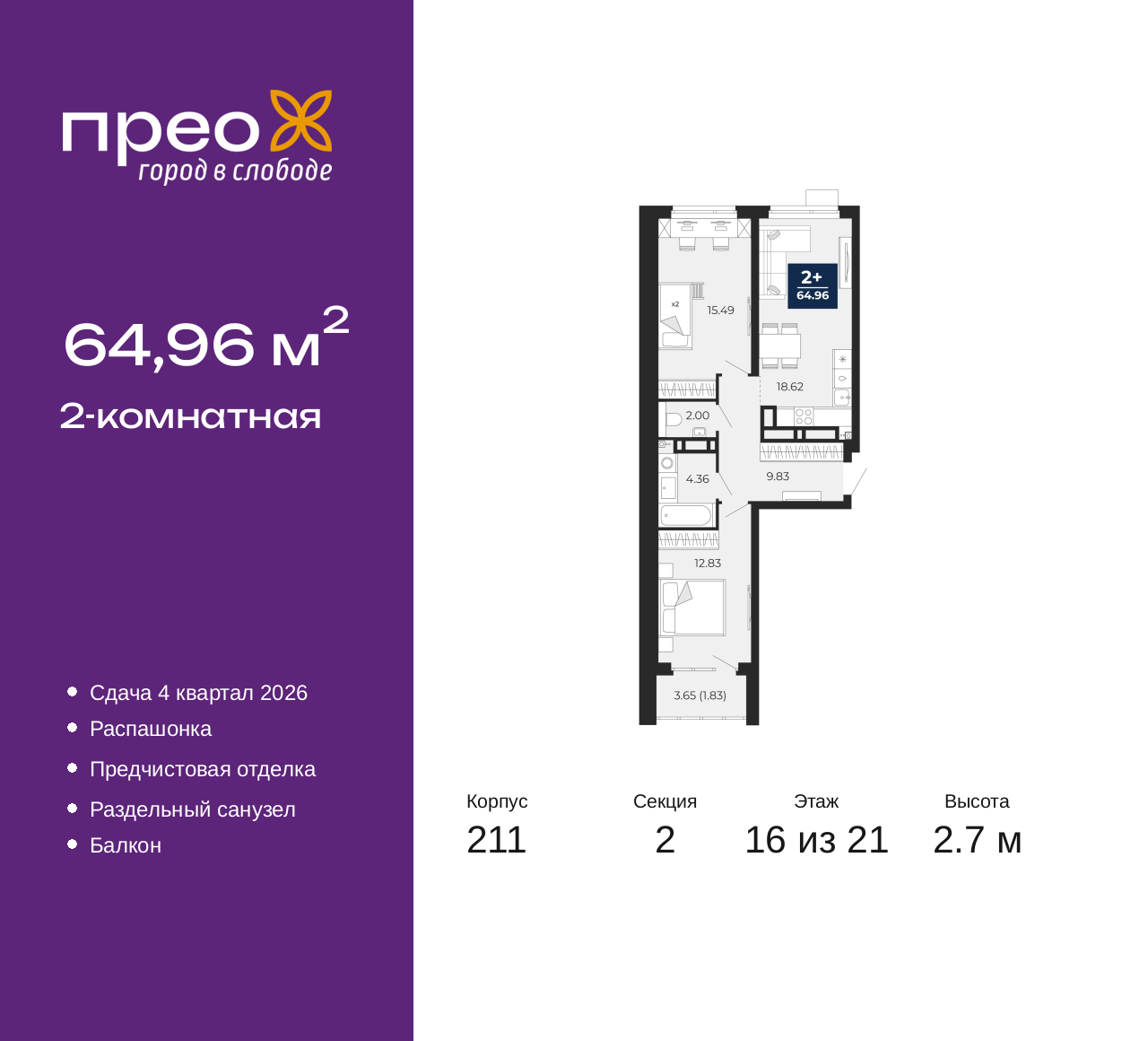 - Общая площадь 64.96 м²