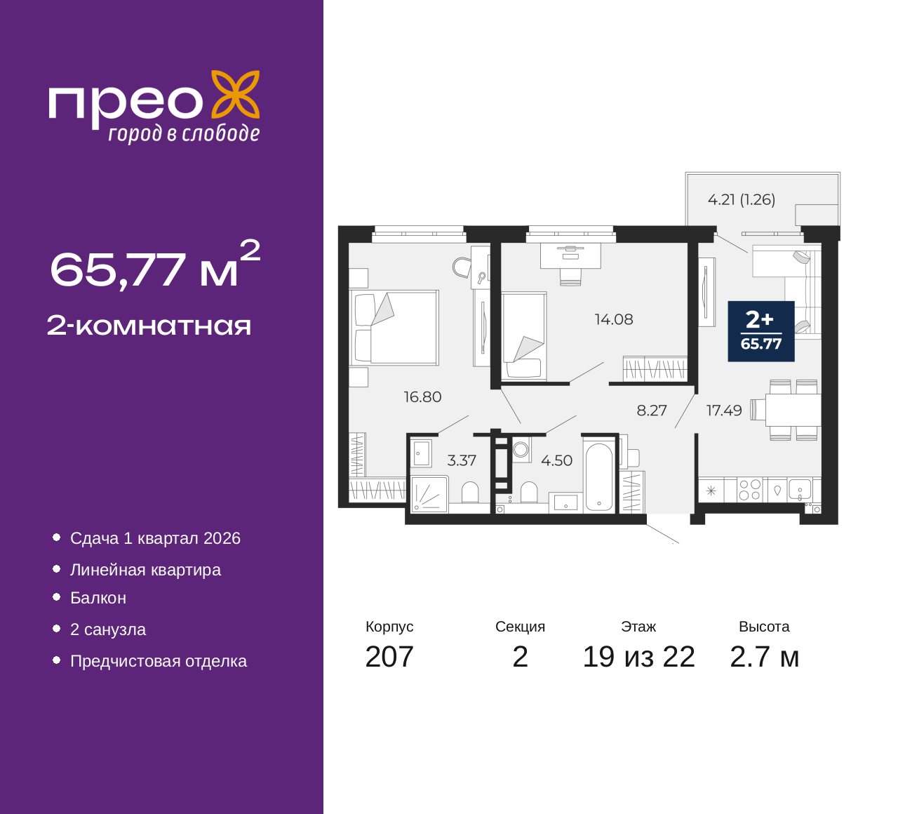Просторная 2-комн. квартира с предчистовой отделкой в ЖК "Прео" на 19 этаже. Общая площадь: 65.77 кв.м., жилая: 30.88 кв.м., площадь просторной кухни-столовой: 17.49 кв.м. Комнаты изолированные, все окна выходят на одну сторону. В квартире один балкон, два совмещенных санузла. Высота потолков 2.7 м. Дом монолитный, двухподъездный, высотой 22 этажа. Квартира находится во 2-й секции в корпусе 207. На этаже 8 квартир. В подъезде 1 пассажирский и 1 грузовой лифт. Окончание строительства - 1 квартал 2026 года. Оформление сделки по договору долевого участия. Преображенский — один из самых привлекательных районов для жизни! Это полностью самостоятельный жилой район с точки зрения инфраструктуры. Преображенский находится между Московским и Червишевским трактами в квартале улиц Закалужская — Вьюжная — Александра Протозанова. Не нужно ждать, когда появится инфраструктура — переезжайте на всё готовое. Вблизи расположены действующие школа и детский сад. В этом году откроется еще один сад, а в следующем году — школа. По соседству с Преображенским запланировано строительство городского парка «Комарово» площадью 38 гектар. За 10 минут можно доехать на автомобиле до крупных ТРЦ: «Лента», «Кристалл», «Леруа Мерлен», «Метро» и «Ашан». С 2018 года в районе открыт Соседский центр — пространство, созданное для формирования добрососедской среды, совместного досуга, общения и реализации соседских инициатив. Здесь проходят встречи соседей, а также сами жители района организовывают мероприятия. Организатором такого события может стать любой желающий. В квартирах выполнена качественная предчистовая отделка. Гладкие стены с финишным выравниванием по маякам. Ровный потолок для установки натяжного потолка. Установлены пятикамерные окна с двойным стеклопакетом (3 стекла). Дизайнерские холлы с видеонаблюдением, безбарьерным и прозрачным входом – всегда светло и спокойно. На первом этаже есть просторные колясочные, где все жители могут оставлять свои коляски и велосипеды. В Преображенском есть всё, что нужно для активного отдыха и занятий спортом. Мы сделали большое футбольное поле с безопасным покрытием. Также установили хоккейный корт, который оборудован по всем необходимым стандартам. Во дворах можно делать упражнения на специальных площадках с турниками. Весь район мы обустроили велодорожками, которые связаны в единый маршрут. У нас есть сухие фонтаны, бьющие из земли, деревья, веревки, сетки, скалодром, газон, песок и резинка — осталось просто дать своему ребенку право на свободную игру. По-настоящему хорошие дворы — это те, которые дети предпочитают соцсетям и телевизору. Аккредитация в банках: ПАО «Банк Уралсиб», ОАО «Альфа-Банк», «Сбербанк России», ПАО «Газпромбанк», ПАО Банк «ВТБ» и других. (AQID02355996)