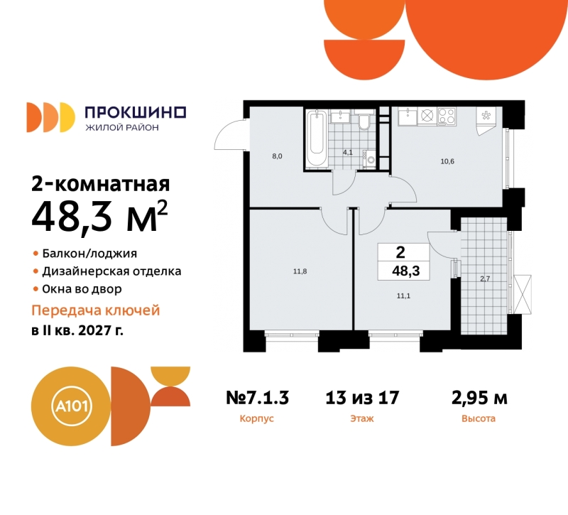 Просторная 2-комн. квартира с отделкой в ЖК "Прокшино" на 13 этаже. Общая площадь: 48.3 кв.м., жилая: 22.9 кв.м., площадь просторной кухни-столовой: 10.6 кв.м. Угловая квартира, очень светлая, естественная вентиляция при открытии окон. В квартире одна лоджия, один совмещенный санузел. Высота потолков 2.95 м. Эта квартира будет сдана с дизайнеркой отделкой "под ключ". Специально для проекта «Прокшино» разработаны два стиля дизайнерской отделки – в тёплых и холодных тонах. В отделке используются только современный высококлассные материалы, на все работы предоставляется гарантия. Квартира находится в корпусе 7.1.3. Дом монолитный, одноподъездный, высотой 17 этажей. На этаже 9 квартир. В подъезде 1 пассажирский и 1 грузовой лифт. Начало строительства - 4 квартал 2024 года. Окончание строительства - 2 квартал 2027 года. Оформление сделки по договору долевого участия. Артикул квартиры по базе застройщика 58К-7.1.3-514. В шаговой доступности от жилого комплекса имеются станции метро (расстояние по прямой): «Прокшино» (1.4 км), «Филатов луг» (1.8 км), также недалеко от этого корпуса находятся станции метро: «Саларьево», «Румянцево», «Теплый стан». ЖК «Прокшино» расположен в 7,6 км от МКАД в Новой Москве. В 8 минутах пешком находится станция метро "Прокшино" быстрой и комфортной красной линии метро. Высокую транспортную доступность обеспечивают и два крупных шоссе, до которых легко доехать за 5 минут по новой скоростной автотрассе Солнцево – Бутово – Варшавское шоссе. Жилой комплекс "Прокшино" входит в кластер Прокшино. В районе появятся дома комфорт и бизнес-класса с подземным паркингом, закрытыми благоустроенными дворами без машин, местами для активного и созерцательного отдыха, магазинами, бытовыми сервисами и другими коммерческими объектами. Рядом пруд с собственной набережной и городской парк «Хованская дубрава». Для маленьких жителей построят детские сады, образовательный комплекс. (AQID02422202)