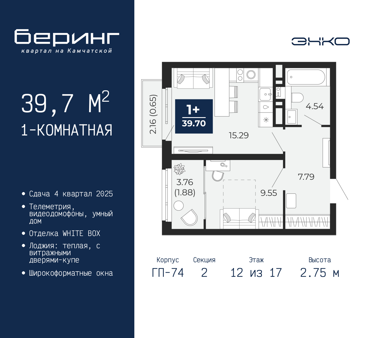 Однокомнатная квартира от застройщика в ЖК "Беринг" на 12 этаже. Квартира без отделки, полностью готова к чистовой отделке и дальнейшему ремонту. Общая площадь: 39.7 кв.м., жилая: 9.55 кв.м., площадь просторной кухни-столовой: 15.29 кв.м. Все окна выходят на одну сторону. В квартире один балкон и одна лоджия, один совмещенный санузел. Высота потолков 2.75 м. Дом монолитный, многоподъездный, переменной этажности, от 9 до 21 этажей. Квартира находится во 2-й секции высотой 17 этажей в корпусе ГП-74. На этаже 7 квартир. В подъезде 1 пассажирский и 1 грузовой лифт. Окончание строительства - 4 квартал 2025 года. Оформление сделки по договору долевого участия. Подобно знаменитому исследователю, мы чувствуем себя первооткрывателями этой локации. Хотим показать новую суть места, сформировать для вас жизненный опыт, которого ещё не было. Беринг — район зелёного цвета. Беринг — район, который откроется вам с другой стороны. Впечатлит новым уровнем комфорта и качеством жизни. Беринг — открытие на карте города. Первый квартал расположен в районе Тура, в границах улиц: Камчатская – Западносибирская – Энтузиастов. Вокруг уже есть всё для того, чтобы ежедневная рутина была лишь частью жизни и не доставляла дискомфорта. Школы и детские сады, магазины и аптеки, поликлиника, места для семейного отдыха, пеших и велопрогулок, и даже рыбалки. Масштабное озеленение дворов — визитная карточка ЭНКО и ваш оазис спокойствия, чтобы отвлечься от повседневности. Раскидистые деревья, кустарники, травы и цветы — осталось остановиться, вдохнуть и расслабиться, глядя на эту природную красоту. Стилистика подъездов продолжает концепцию Беринга, вдохновлённого Камчаткой: сдержанный, но при этом впечатляющий дизайн соседствует с удобством и функциональностью. (AQID02525455)