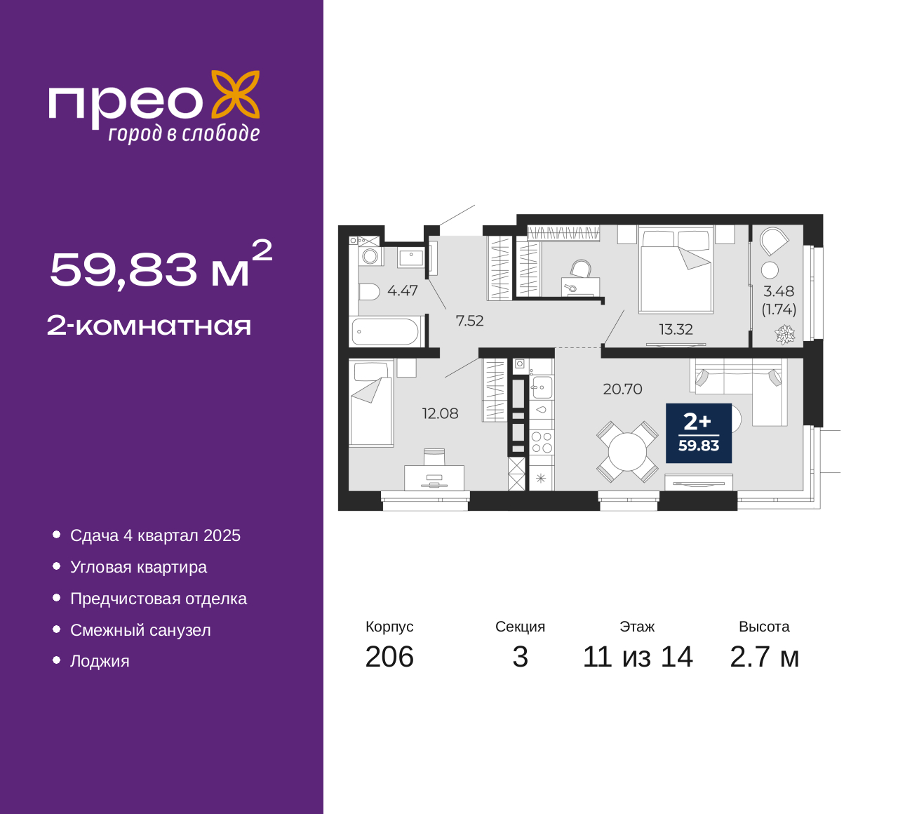 2-комн. квартира с предчистовой отделкой в ЖК "Прео" на 11 этаже. Общая площадь: 59.83 кв.м., жилая: 25.4 кв.м., площадь просторной кухни-столовой: 20.7 кв.м. Угловая квартира, окна oбecпeчивaют paвнoмepнoe ocвeщeниe в тeчeниe дня. В квартире одна лоджия, один совмещенный санузел. Высота потолков 2.7 м. Дом монолитный, трехподъездный, переменной этажности, от 14 до 23 этажей. Квартира находится в 3-й секции высотой 14 этажей в корпусе 206. На этаже 6 квартир. В подъезде 1 пассажирский и 1 грузовой лифт. Окончание строительства - 4 квартал 2025 года. Оформление сделки по договору долевого участия. Преображенский — один из самых привлекательных районов для жизни! Это полностью самостоятельный жилой район с точки зрения инфраструктуры. Преображенский находится между Московским и Червишевским трактами в квартале улиц Закалужская — Вьюжная — Александра Протозанова. Не нужно ждать, когда появится инфраструктура — переезжайте на всё готовое. Вблизи расположены действующие школа и детский сад. В этом году откроется еще один сад, а в следующем году — школа. По соседству с Преображенским запланировано строительство городского парка «Комарово» площадью 38 гектар. За 10 минут можно доехать на автомобиле до крупных ТРЦ: «Лента», «Кристалл», «Леруа Мерлен», «Метро» и «Ашан». С 2018 года в районе открыт Соседский центр — пространство, созданное для формирования добрососедской среды, совместного досуга, общения и реализации соседских инициатив. Здесь проходят встречи соседей, а также сами жители района организовывают мероприятия. Организатором такого события может стать любой желающий. В квартирах выполнена качественная предчистовая отделка. Гладкие стены с финишным выравниванием по маякам. Ровный потолок для установки натяжного потолка. Установлены пятикамерные окна с двойным стеклопакетом (3 стекла). Дизайнерские холлы с видеонаблюдением, безбарьерным и прозрачным входом – всегда светло и спокойно. На первом этаже есть просторные колясочные, где все жители могут оставлять свои коляски и велосипеды. В Преображенском есть всё, что нужно для активного отдыха и занятий спортом. Мы сделали большое футбольное поле с безопасным покрытием. Также установили хоккейный корт, который оборудован по всем необходимым стандартам. Во дворах можно делать упражнения на специальных площадках с турниками. Весь район мы обустроили велодорожками, которые связаны в единый маршрут. У нас есть сухие фонтаны, бьющие из земли, деревья, веревки, сетки, скалодром, газон, песок и резинка — осталось просто дать своему ребенку право на свободную игру. По-настоящему хорошие дворы — это те, которые дети предпочитают соцсетям и телевизору. Аккредитация в банках: «Сбербанк России», ПАО Банк «ВТБ», ОАО «Альфа-Банк», ПАО «Газпромбанк», ПАО «Банк Уралсиб» и других. (AQID02488043)