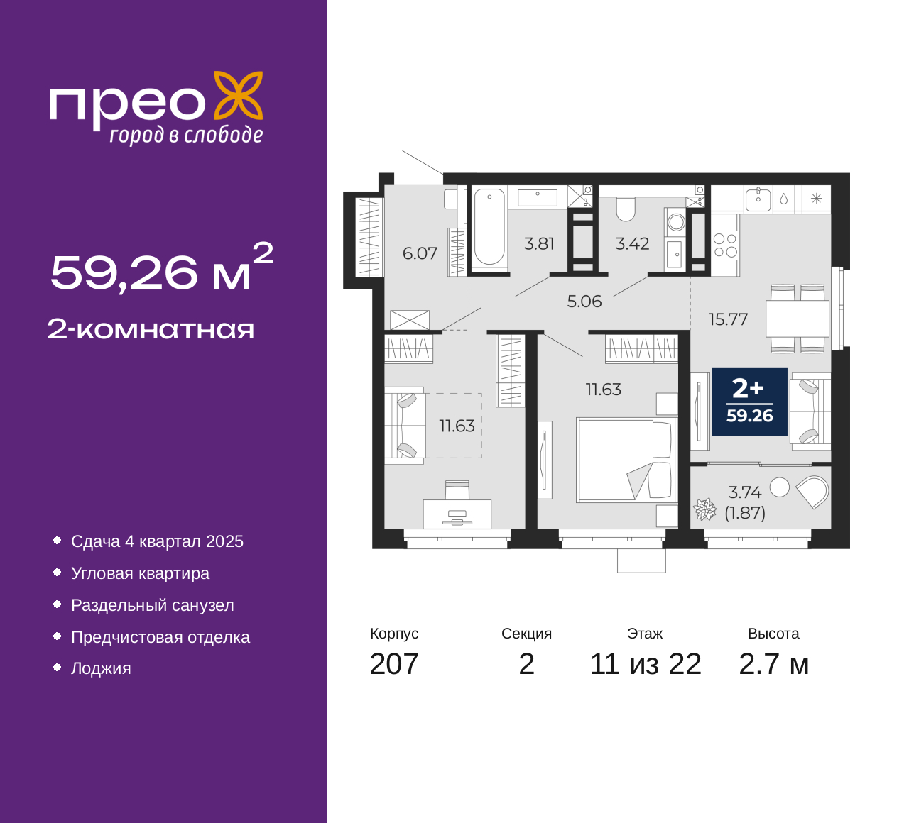 2-комн. квартира от застройщика с предчистовой отделкой в ЖК "Прео" на 11 этаже. Общая площадь: 59.26 кв.м., жилая: 23.26 кв.м., площадь просторной кухни-столовой: 15.77 кв.м. Квартира угловая, идеально подойдет любителям тишины и панорамных видов. В квартире одна лоджия, один раздельный санузел. Высота потолков 2.7 м. Дом монолитный, двухподъездный, высотой 22 этажа. Квартира находится во 2-й секции в корпусе 207. На этаже 8 квартир. В подъезде 1 пассажирский и 1 грузовой лифт. Окончание строительства - 4 квартал 2025 года. Оформление сделки по договору долевого участия. Преображенский — один из самых привлекательных районов для жизни! Это полностью самостоятельный жилой район с точки зрения инфраструктуры. Преображенский находится между Московским и Червишевским трактами в квартале улиц Закалужская — Вьюжная — Александра Протозанова. Не нужно ждать, когда появится инфраструктура — переезжайте на всё готовое. Вблизи расположены действующие школа и детский сад. В этом году откроется еще один сад, а в следующем году — школа. По соседству с Преображенским запланировано строительство городского парка «Комарово» площадью 38 гектар. За 10 минут можно доехать на автомобиле до крупных ТРЦ: «Лента», «Кристалл», «Леруа Мерлен», «Метро» и «Ашан». С 2018 года в районе открыт Соседский центр — пространство, созданное для формирования добрососедской среды, совместного досуга, общения и реализации соседских инициатив. Здесь проходят встречи соседей, а также сами жители района организовывают мероприятия. Организатором такого события может стать любой желающий. В квартирах выполнена качественная предчистовая отделка. Гладкие стены с финишным выравниванием по маякам. Ровный потолок для установки натяжного потолка. Установлены пятикамерные окна с двойным стеклопакетом (3 стекла). Дизайнерские холлы с видеонаблюдением, безбарьерным и прозрачным входом – всегда светло и спокойно. На первом этаже есть просторные колясочные, где все жители могут оставлять свои коляски и велосипеды. В Преображенском есть всё, что нужно для активного отдыха и занятий спортом. Мы сделали большое футбольное поле с безопасным покрытием. Также установили хоккейный корт, который оборудован по всем необходимым стандартам. Во дворах можно делать упражнения на специальных площадках с турниками. Весь район мы обустроили велодорожками, которые связаны в единый маршрут. У нас есть сухие фонтаны, бьющие из земли, деревья, веревки, сетки, скалодром, газон, песок и резинка — осталось просто дать своему ребенку право на свободную игру. По-настоящему хорошие дворы — это те, которые дети предпочитают соцсетям и телевизору. Аккредитация в банках: ОАО «Альфа-Банк», ПАО Банк «ВТБ», ПАО «Банк Уралсиб», ПАО «Газпромбанк», «Сбербанк России» и других. (AQID02488155)