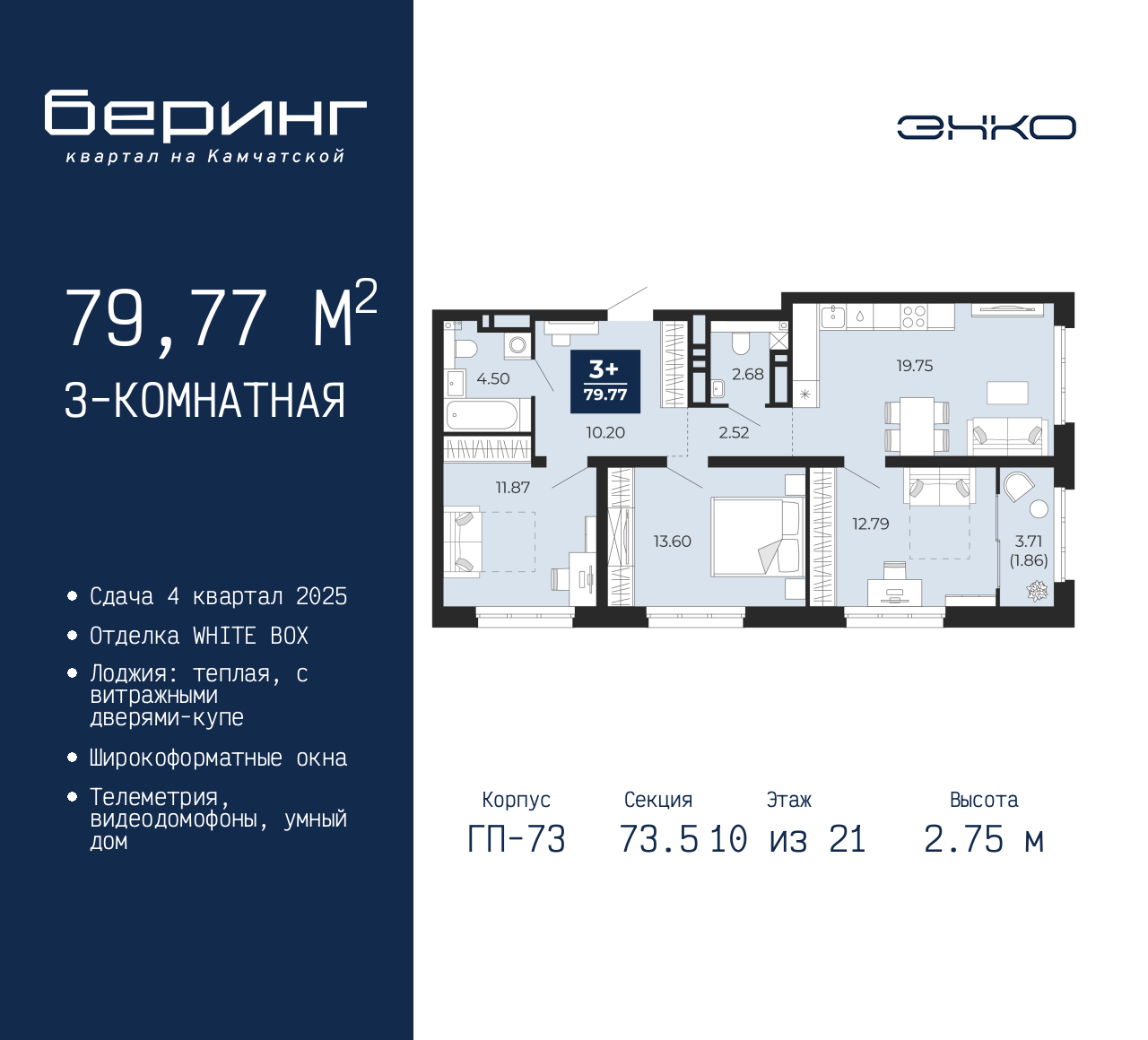 Трехкомнатная квартира в ЖК "Беринг" на 10 этаже. Квартира без отделки, после оформления собственности можно делать ремонт. Общая площадь: 79.77 кв.м., жилая: 38.26 кв.м., площадь просторной кухни-столовой: 19.75 кв.м. Угловая квартира, очень светлая, естественная вентиляция при открытии окон. В квартире одна лоджия, один совмещенный и один раздельный санузел. Высота потолков 2.75 м. Дом монолитный, многоподъездный, переменной этажности, от 9 до 22 этажей. Квартира находится в 73.5-й секции высотой 21 этаж в корпусе ГП-73. На этаже 6 квартир. В подъезде 1 пассажирский и 1 грузовой лифт. Окончание строительства - 4 квартал 2025 года. Оформление сделки по договору долевого участия. Подобно знаменитому исследователю, мы чувствуем себя первооткрывателями этой локации. Хотим показать новую суть места, сформировать для вас жизненный опыт, которого ещё не было. Беринг — район зелёного цвета. Беринг — район, который откроется вам с другой стороны. Впечатлит новым уровнем комфорта и качеством жизни. Беринг — открытие на карте города. Первый квартал расположен в районе Тура, в границах улиц: Камчатская – Западносибирская – Энтузиастов. Вокруг уже есть всё для того, чтобы ежедневная рутина была лишь частью жизни и не доставляла дискомфорта. Школы и детские сады, магазины и аптеки, поликлиника, места для семейного отдыха, пеших и велопрогулок, и даже рыбалки. Масштабное озеленение дворов — визитная карточка ЭНКО и ваш оазис спокойствия, чтобы отвлечься от повседневности. Раскидистые деревья, кустарники, травы и цветы — осталось остановиться, вдохнуть и расслабиться, глядя на эту природную красоту. Стилистика подъездов продолжает концепцию Беринга, вдохновлённого Камчаткой: сдержанный, но при этом впечатляющий дизайн соседствует с удобством и функциональностью. (AQID02484012)