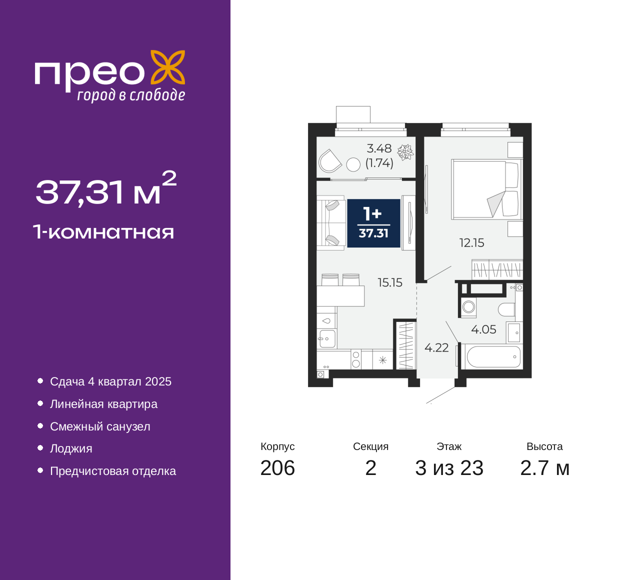 Продается однокомнатная квартира от застройщика с предчистовой отделкой в ЖК "Прео" на 3 этаже. Общая площадь: 37.31 кв.м., жилая: 12.15 кв.м., площадь просторной кухни-столовой: 15.15 кв.м. Все окна выходят на одну сторону. В квартире одна лоджия, один совмещенный санузел. Высота потолков 2.7 м. Дом монолитный, трехподъездный, переменной этажности, от 14 до 23 этажей. Квартира находится во 2-й секции высотой 23 этажа в корпусе 206. На этаже 10 квартир. В подъезде 1 пассажирский и 1 грузовой лифт. Окончание строительства - 4 квартал 2025 года. Оформление сделки по договору долевого участия. Преображенский — один из самых привлекательных районов для жизни! Это полностью самостоятельный жилой район с точки зрения инфраструктуры. Преображенский находится между Московским и Червишевским трактами в квартале улиц Закалужская — Вьюжная — Александра Протозанова. Не нужно ждать, когда появится инфраструктура — переезжайте на всё готовое. Вблизи расположены действующие школа и детский сад. В этом году откроется еще один сад, а в следующем году — школа. По соседству с Преображенским запланировано строительство городского парка «Комарово» площадью 38 гектар. За 10 минут можно доехать на автомобиле до крупных ТРЦ: «Лента», «Кристалл», «Леруа Мерлен», «Метро» и «Ашан». С 2018 года в районе открыт Соседский центр — пространство, созданное для формирования добрососедской среды, совместного досуга, общения и реализации соседских инициатив. Здесь проходят встречи соседей, а также сами жители района организовывают мероприятия. Организатором такого события может стать любой желающий. В квартирах выполнена качественная предчистовая отделка. Гладкие стены с финишным выравниванием по маякам. Ровный потолок для установки натяжного потолка. Установлены пятикамерные окна с двойным стеклопакетом (3 стекла). Дизайнерские холлы с видеонаблюдением, безбарьерным и прозрачным входом – всегда светло и спокойно. На первом этаже есть просторные колясочные, где все жители могут оставлять свои коляски и велосипеды. В Преображенском есть всё, что нужно для активного отдыха и занятий спортом. Мы сделали большое футбольное поле с безопасным покрытием. Также установили хоккейный корт, который оборудован по всем необходимым стандартам. Во дворах можно делать упражнения на специальных площадках с турниками. Весь район мы обустроили велодорожками, которые связаны в единый маршрут. У нас есть сухие фонтаны, бьющие из земли, деревья, веревки, сетки, скалодром, газон, песок и резинка — осталось просто дать своему ребенку право на свободную игру. По-настоящему хорошие дворы — это те, которые дети предпочитают соцсетям и телевизору. (AQID02526968)