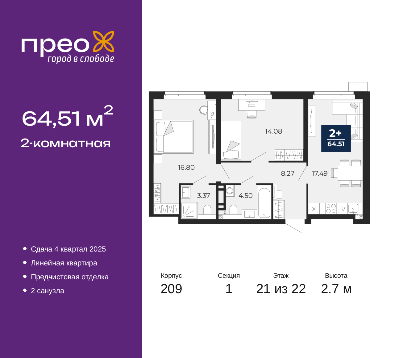 Просторная 2-комн. квартира с предчистовой отделкой в ЖК "Прео" на 21 этаже. Общая площадь: 64.51 кв.м., жилая: 30.88 кв.м., площадь просторной кухни-столовой: 17.49 кв.м. Комнаты изолированные, все окна выходят на одну сторону. В квартире два совмещенных санузла. Высота потолков 2.7 м. Квартира находится в корпусе 209. Дом монолитный, одноподъездный, высотой 22 этажа. На этаже 8 квартир. В подъезде 1 пассажирский и 1 грузовой лифт. Окончание строительства - 4 квартал 2025 года. Оформление сделки по договору долевого участия. Преображенский — один из самых привлекательных районов для жизни! Это полностью самостоятельный жилой район с точки зрения инфраструктуры. Преображенский находится между Московским и Червишевским трактами в квартале улиц Закалужская — Вьюжная — Александра Протозанова. Не нужно ждать, когда появится инфраструктура — переезжайте на всё готовое. Вблизи расположены действующие школа и детский сад. В этом году откроется еще один сад, а в следующем году — школа. По соседству с Преображенским запланировано строительство городского парка «Комарово» площадью 38 гектар. За 10 минут можно доехать на автомобиле до крупных ТРЦ: «Лента», «Кристалл», «Леруа Мерлен», «Метро» и «Ашан». С 2018 года в районе открыт Соседский центр — пространство, созданное для формирования добрососедской среды, совместного досуга, общения и реализации соседских инициатив. Здесь проходят встречи соседей, а также сами жители района организовывают мероприятия. Организатором такого события может стать любой желающий. В квартирах выполнена качественная предчистовая отделка. Гладкие стены с финишным выравниванием по маякам. Ровный потолок для установки натяжного потолка. Установлены пятикамерные окна с двойным стеклопакетом (3 стекла). Дизайнерские холлы с видеонаблюдением, безбарьерным и прозрачным входом – всегда светло и спокойно. На первом этаже есть просторные колясочные, где все жители могут оставлять свои коляски и велосипеды. В Преображенском есть всё, что нужно для активного отдыха и занятий спортом. Мы сделали большое футбольное поле с безопасным покрытием. Также установили хоккейный корт, который оборудован по всем необходимым стандартам. Во дворах можно делать упражнения на специальных площадках с турниками. Весь район мы обустроили велодорожками, которые связаны в единый маршрут. У нас есть сухие фонтаны, бьющие из земли, деревья, веревки, сетки, скалодром, газон, песок и резинка — осталось просто дать своему ребенку право на свободную игру. По-настоящему хорошие дворы — это те, которые дети предпочитают соцсетям и телевизору. (AQID02525460)