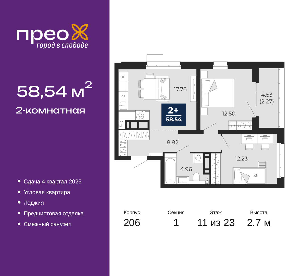 Просторная 2-комн. квартира с предчистовой отделкой в ЖК "Прео" на 11 этаже. Общая площадь: 58.54 кв.м., жилая: 24.73 кв.м., площадь просторной кухни-столовой: 17.76 кв.м. Угловая квартира, очень светлая, естественная вентиляция при открытии окон. В квартире одна лоджия, один совмещенный санузел. Высота потолков 2.7 м. Дом монолитный, трехподъездный, переменной этажности, от 14 до 23 этажей. Квартира находится в 1-й секции высотой 23 этажа в корпусе 206. На этаже 8 квартир. В подъезде 1 пассажирский и 1 грузовой лифт. Окончание строительства - 4 квартал 2025 года. Оформление сделки по договору долевого участия. Преображенский — один из самых привлекательных районов для жизни! Это полностью самостоятельный жилой район с точки зрения инфраструктуры. Преображенский находится между Московским и Червишевским трактами в квартале улиц Закалужская — Вьюжная — Александра Протозанова. Не нужно ждать, когда появится инфраструктура — переезжайте на всё готовое. Вблизи расположены действующие школа и детский сад. В этом году откроется еще один сад, а в следующем году — школа. По соседству с Преображенским запланировано строительство городского парка «Комарово» площадью 38 гектар. За 10 минут можно доехать на автомобиле до крупных ТРЦ: «Лента», «Кристалл», «Леруа Мерлен», «Метро» и «Ашан». С 2018 года в районе открыт Соседский центр — пространство, созданное для формирования добрососедской среды, совместного досуга, общения и реализации соседских инициатив. Здесь проходят встречи соседей, а также сами жители района организовывают мероприятия. Организатором такого события может стать любой желающий. В квартирах выполнена качественная предчистовая отделка. Гладкие стены с финишным выравниванием по маякам. Ровный потолок для установки натяжного потолка. Установлены пятикамерные окна с двойным стеклопакетом (3 стекла). Дизайнерские холлы с видеонаблюдением, безбарьерным и прозрачным входом – всегда светло и спокойно. На первом этаже есть просторные колясочные, где все жители могут оставлять свои коляски и велосипеды. В Преображенском есть всё, что нужно для активного отдыха и занятий спортом. Мы сделали большое футбольное поле с безопасным покрытием. Также установили хоккейный корт, который оборудован по всем необходимым стандартам. Во дворах можно делать упражнения на специальных площадках с турниками. Весь район мы обустроили велодорожками, которые связаны в единый маршрут. У нас есть сухие фонтаны, бьющие из земли, деревья, веревки, сетки, скалодром, газон, песок и резинка — осталось просто дать своему ребенку право на свободную игру. По-настоящему хорошие дворы — это те, которые дети предпочитают соцсетям и телевизору. (AQID02527001)