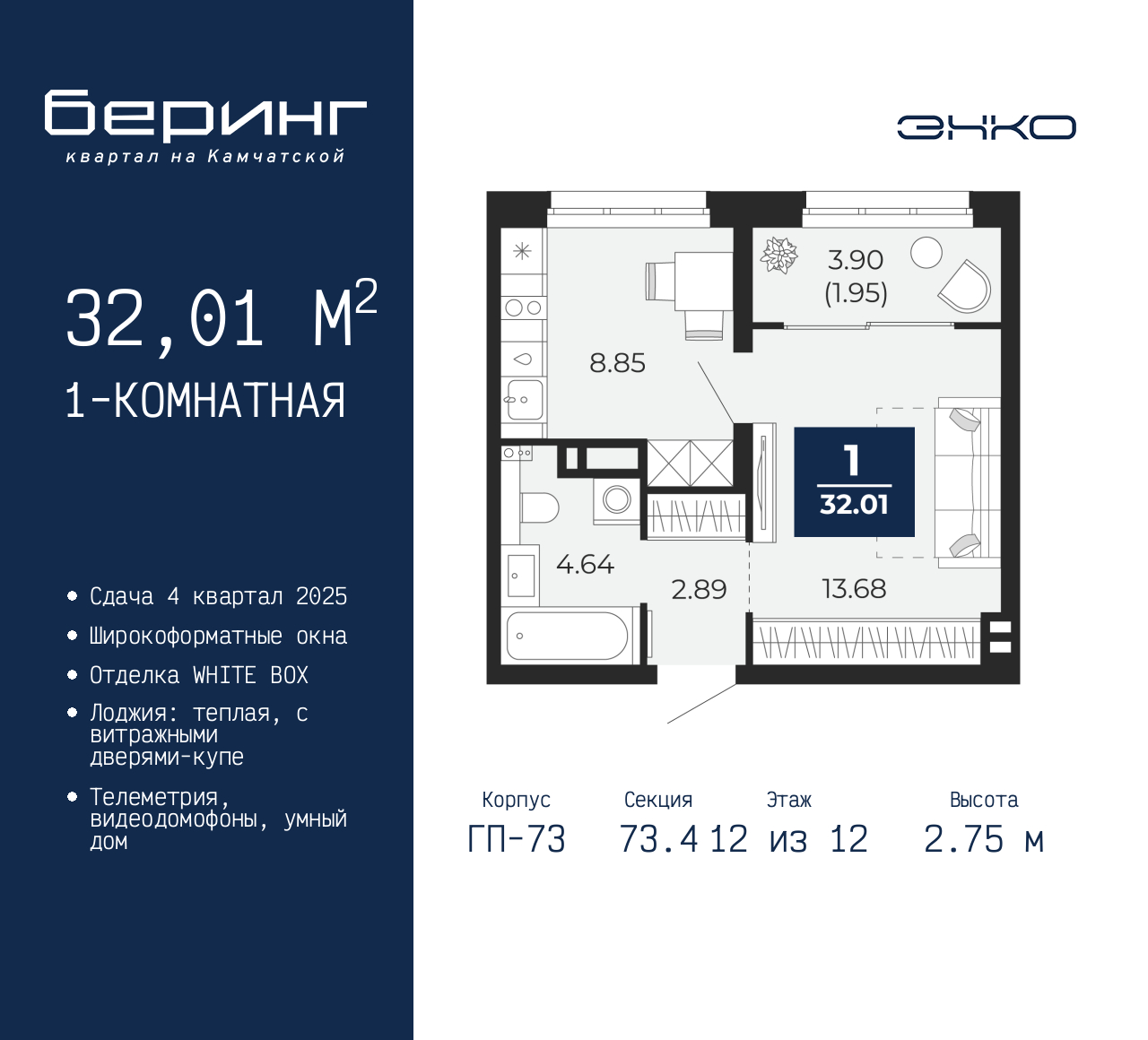 Просторная 1-комн. квартира в ЖК "Беринг" на 12 этаже. Квартира без отделки, полностью готова к ремонту. Общая площадь: 32.01 кв.м., жилая: 13.68 кв.м., площадь кухни: 8.85 кв.м. Все окна выходят на одну сторону. В квартире одна лоджия, один совмещенный санузел. Высота потолков 2.75 м. Дом монолитный, многоподъездный, переменной этажности, от 9 до 22 этажей. Квартира находится в 73.4-й секции высотой 12 этажей в корпусе ГП-73. На этаже 8 квартир. В подъезде 1 пассажирский и 1 грузовой лифт. Окончание строительства - 4 квартал 2025 года. Оформление сделки по договору долевого участия. Подобно знаменитому исследователю, мы чувствуем себя первооткрывателями этой локации. Хотим показать новую суть места, сформировать для вас жизненный опыт, которого ещё не было. Беринг — район зелёного цвета. Беринг — район, который откроется вам с другой стороны. Впечатлит новым уровнем комфорта и качеством жизни. Беринг — открытие на карте города. Первый квартал расположен в районе Тура, в границах улиц: Камчатская – Западносибирская – Энтузиастов. Вокруг уже есть всё для того, чтобы ежедневная рутина была лишь частью жизни и не доставляла дискомфорта. Школы и детские сады, магазины и аптеки, поликлиника, места для семейного отдыха, пеших и велопрогулок, и даже рыбалки. Масштабное озеленение дворов — визитная карточка ЭНКО и ваш оазис спокойствия, чтобы отвлечься от повседневности. Раскидистые деревья, кустарники, травы и цветы — осталось остановиться, вдохнуть и расслабиться, глядя на эту природную красоту. Стилистика подъездов продолжает концепцию Беринга, вдохновлённого Камчаткой: сдержанный, но при этом впечатляющий дизайн соседствует с удобством и функциональностью. (AQID02525036)