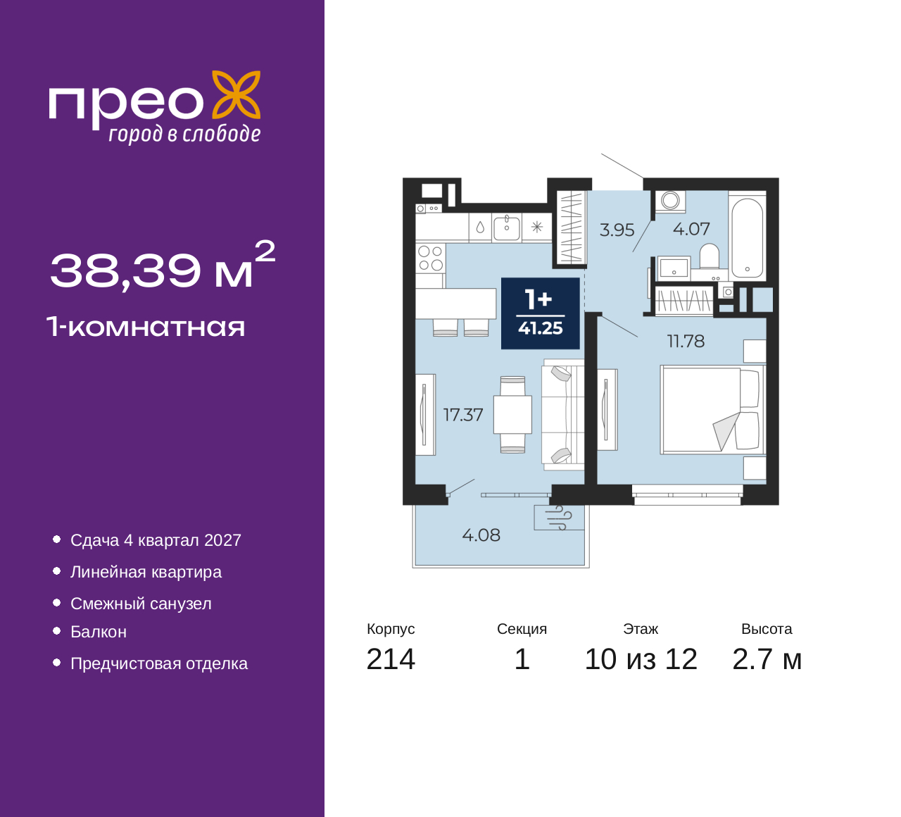 Однокомнатная квартира с предчистовой отделкой в ЖК "Прео" на 10 этаже. Общая площадь: 38.39 кв.м., жилая: 11.78 кв.м., площадь просторной кухни-столовой: 17.37 кв.м. Все окна выходят на одну сторону. В квартире один балкон, один совмещенный санузел. Высота потолков 2.7 м. Дом монолитный, двухподъездный, переменной этажности, от 12 до 20 этажей. Квартира находится в 1-й секции высотой 12 этажей в корпусе 214. На этаже 8 квартир. В подъезде 1 пассажирский и 1 грузовой лифт. Окончание строительства - 4 квартал 2027 года. Оформление сделки по договору долевого участия. Преображенский — один из самых привлекательных районов для жизни! Это полностью самостоятельный жилой район с точки зрения инфраструктуры. Преображенский находится между Московским и Червишевским трактами в квартале улиц Закалужская — Вьюжная — Александра Протозанова. Не нужно ждать, когда появится инфраструктура — переезжайте на всё готовое. Вблизи расположены действующие школа и детский сад. В этом году откроется еще один сад, а в следующем году — школа. По соседству с Преображенским запланировано строительство городского парка «Комарово» площадью 38 гектар. За 10 минут можно доехать на автомобиле до крупных ТРЦ: «Лента», «Кристалл», «Леруа Мерлен», «Метро» и «Ашан». С 2018 года в районе открыт Соседский центр — пространство, созданное для формирования добрососедской среды, совместного досуга, общения и реализации соседских инициатив. Здесь проходят встречи соседей, а также сами жители района организовывают мероприятия. Организатором такого события может стать любой желающий. В квартирах выполнена качественная предчистовая отделка. Гладкие стены с финишным выравниванием по маякам. Ровный потолок для установки натяжного потолка. Установлены пятикамерные окна с двойным стеклопакетом (3 стекла). Дизайнерские холлы с видеонаблюдением, безбарьерным и прозрачным входом – всегда светло и спокойно. На первом этаже есть просторные колясочные, где все жители могут оставлять свои коляски и велосипеды. В Преображенском есть всё, что нужно для активного отдыха и занятий спортом. Мы сделали большое футбольное поле с безопасным покрытием. Также установили хоккейный корт, который оборудован по всем необходимым стандартам. Во дворах можно делать упражнения на специальных площадках с турниками. Весь район мы обустроили велодорожками, которые связаны в единый маршрут. У нас есть сухие фонтаны, бьющие из земли, деревья, веревки, сетки, скалодром, газон, песок и резинка — осталось просто дать своему ребенку право на свободную игру. По-настоящему хорошие дворы — это те, которые дети предпочитают соцсетям и телевизору. Аккредитация в банках: ПАО «Газпромбанк», «Сбербанк России», ПАО «Банк Уралсиб», ОАО «Альфа-Банк», ПАО Банк «ВТБ» и других. (AQID02525477)