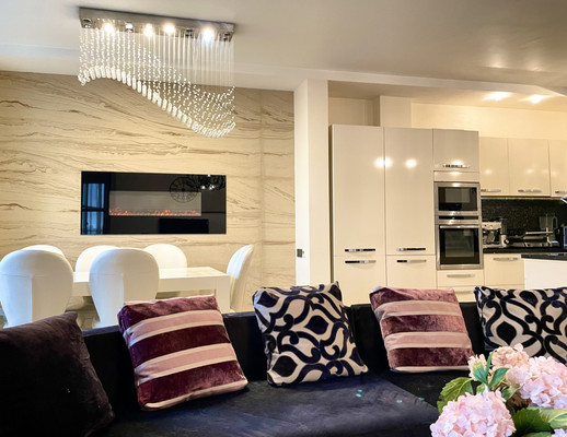 Квартира прекрасно подойдет для больших праздников и теплых семейных посиделок. Диван вмещает до 20 человек, а большой раздвижной стол располагает к шумному застолью, откуда можно любоваться камином. В каждой комнате находиться кондиционер. Мастер спальня. Теплые полы. Сауна. На этаже всего две квартиры, тихие соседи.