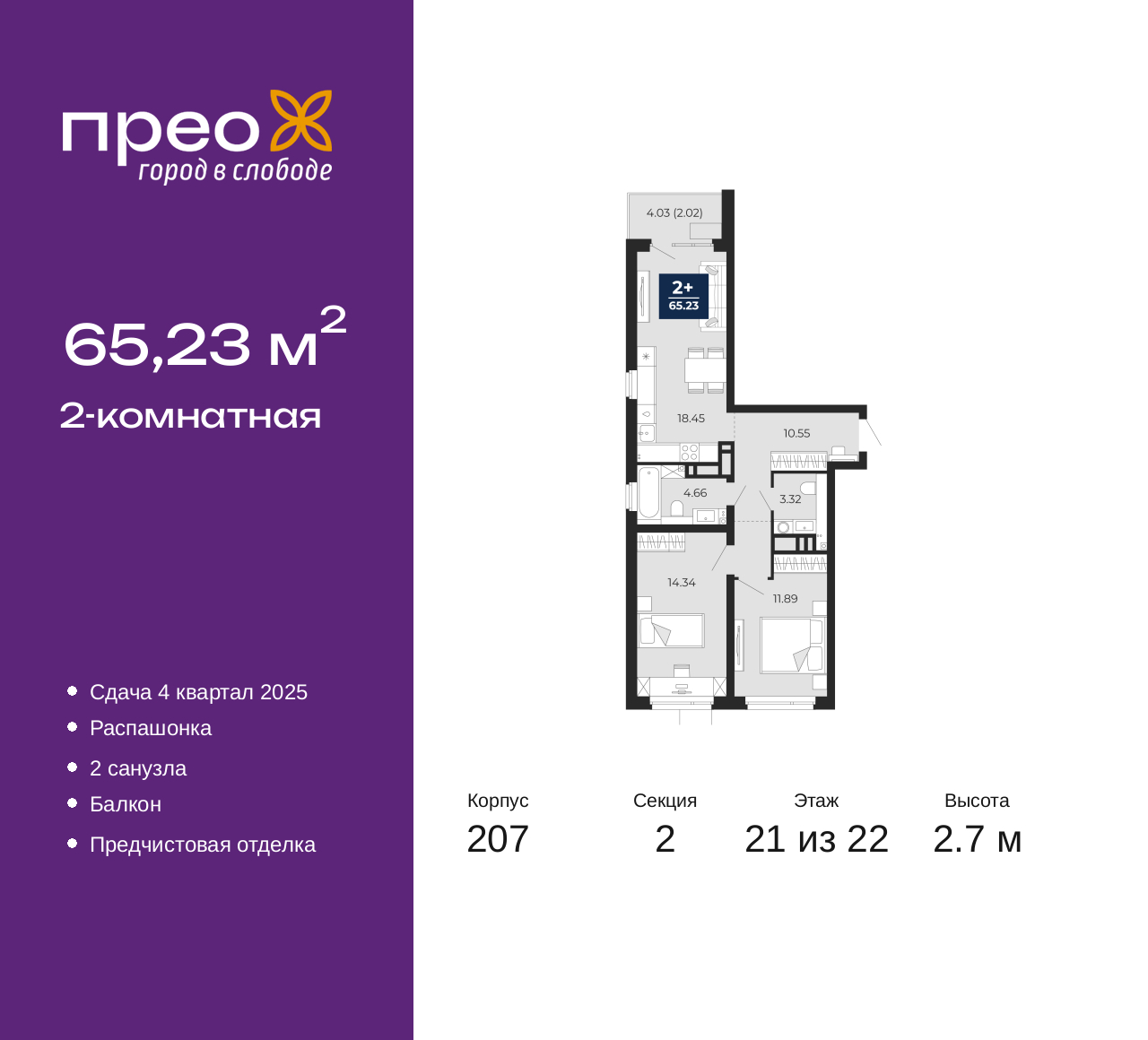 2-комн. квартира от застройщика с предчистовой отделкой в ЖК "Прео" на 21 этаже. Общая площадь: 65.23 кв.м., жилая: 26.23 кв.м., площадь просторной кухни-столовой: 18.45 кв.м. Квартира - распашонка, без проходных комнат, окна выходят на paзные стороны дома. В квартире один балкон, один совмещенный и один раздельный санузел. Высота потолков 2.7 м. Дом монолитный, двухподъездный, высотой 22 этажа. Квартира находится во 2-й секции в корпусе 207. На этаже 8 квартир. В подъезде 1 пассажирский и 1 грузовой лифт. Окончание строительства - 4 квартал 2025 года. Оформление сделки по договору долевого участия. Преображенский — один из самых привлекательных районов для жизни! Это полностью самостоятельный жилой район с точки зрения инфраструктуры. Преображенский находится между Московским и Червишевским трактами в квартале улиц Закалужская — Вьюжная — Александра Протозанова. Не нужно ждать, когда появится инфраструктура — переезжайте на всё готовое. Вблизи расположены действующие школа и детский сад. В этом году откроется еще один сад, а в следующем году — школа. По соседству с Преображенским запланировано строительство городского парка «Комарово» площадью 38 гектар. За 10 минут можно доехать на автомобиле до крупных ТРЦ: «Лента», «Кристалл», «Леруа Мерлен», «Метро» и «Ашан». С 2018 года в районе открыт Соседский центр — пространство, созданное для формирования добрососедской среды, совместного досуга, общения и реализации соседских инициатив. Здесь проходят встречи соседей, а также сами жители района организовывают мероприятия. Организатором такого события может стать любой желающий. В квартирах выполнена качественная предчистовая отделка. Гладкие стены с финишным выравниванием по маякам. Ровный потолок для установки натяжного потолка. Установлены пятикамерные окна с двойным стеклопакетом (3 стекла). Дизайнерские холлы с видеонаблюдением, безбарьерным и прозрачным входом – всегда светло и спокойно. На первом этаже есть просторные колясочные, где все жители могут оставлять свои коляски и велосипеды. В Преображенском есть всё, что нужно для активного отдыха и занятий спортом. Мы сделали большое футбольное поле с безопасным покрытием. Также установили хоккейный корт, который оборудован по всем необходимым стандартам. Во дворах можно делать упражнения на специальных площадках с турниками. Весь район мы обустроили велодорожками, которые связаны в единый маршрут. У нас есть сухие фонтаны, бьющие из земли, деревья, веревки, сетки, скалодром, газон, песок и резинка — осталось просто дать своему ребенку право на свободную игру. По-настоящему хорошие дворы — это те, которые дети предпочитают соцсетям и телевизору. (AQID02527005)