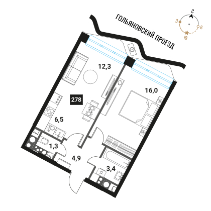 - Общая площадь 44.4 м²