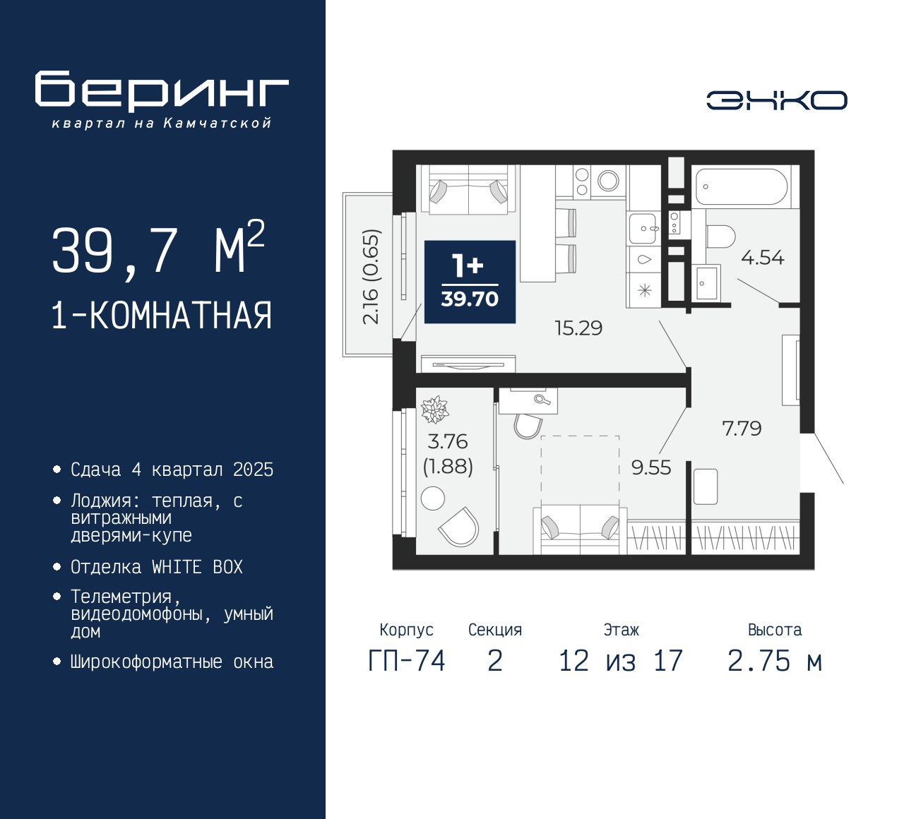 Просторная 1-комн. квартира в ЖК "Беринг" на 12 этаже. Квартира без отделки, полностью готова к ремонту. Общая площадь: 39.7 кв.м., жилая: 9.55 кв.м., площадь просторной кухни-столовой: 15.29 кв.м. Все окна выходят на одну сторону. В квартире один балкон и одна лоджия, один совмещенный санузел. Высота потолков 2.75 м. Дом монолитный, многоподъездный, переменной этажности, от 9 до 21 этажей. Квартира находится во 2-й секции высотой 17 этажей в корпусе ГП-74. На этаже 7 квартир. В подъезде 1 пассажирский и 1 грузовой лифт. Окончание строительства - 4 квартал 2025 года. Оформление сделки по договору долевого участия. Подобно знаменитому исследователю, мы чувствуем себя первооткрывателями этой локации. Хотим показать новую суть места, сформировать для вас жизненный опыт, которого ещё не было. Беринг — район зелёного цвета. Беринг — район, который откроется вам с другой стороны. Впечатлит новым уровнем комфорта и качеством жизни. Беринг — открытие на карте города. Первый квартал расположен в районе Тура, в границах улиц: Камчатская – Западносибирская – Энтузиастов. Вокруг уже есть всё для того, чтобы ежедневная рутина была лишь частью жизни и не доставляла дискомфорта. Школы и детские сады, магазины и аптеки, поликлиника, места для семейного отдыха, пеших и велопрогулок, и даже рыбалки. Масштабное озеленение дворов — визитная карточка ЭНКО и ваш оазис спокойствия, чтобы отвлечься от повседневности. Раскидистые деревья, кустарники, травы и цветы — осталось остановиться, вдохнуть и расслабиться, глядя на эту природную красоту. Стилистика подъездов продолжает концепцию Беринга, вдохновлённого Камчаткой: сдержанный, но при этом впечатляющий дизайн соседствует с удобством и функциональностью. (AQID02525455)