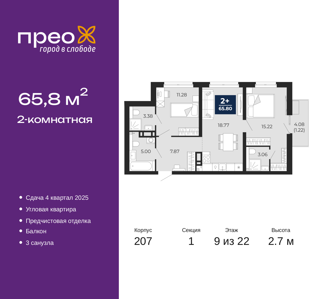 Продается 2-комн. квартира с предчистовой отделкой в ЖК "Прео" на 9 этаже. Общая площадь: 65.8 кв.м., жилая: 26.5 кв.м., площадь просторной кухни-столовой: 18.77 кв.м. Квартира угловая, очень светлая, естественная вентиляция при открытии окон. В квартире один балкон, три совмещенных санузла. Высота потолков 2.7 м. Дом монолитный, двухподъездный, высотой 22 этажа. Квартира находится в 1-й секции в корпусе 207. На этаже 8 квартир. В подъезде 1 пассажирский и 1 грузовой лифт. Окончание строительства - 4 квартал 2025 года. Оформление сделки по договору долевого участия. Преображенский — один из самых привлекательных районов для жизни! Это полностью самостоятельный жилой район с точки зрения инфраструктуры. Преображенский находится между Московским и Червишевским трактами в квартале улиц Закалужская — Вьюжная — Александра Протозанова. Не нужно ждать, когда появится инфраструктура — переезжайте на всё готовое. Вблизи расположены действующие школа и детский сад. В этом году откроется еще один сад, а в следующем году — школа. По соседству с Преображенским запланировано строительство городского парка «Комарово» площадью 38 гектар. За 10 минут можно доехать на автомобиле до крупных ТРЦ: «Лента», «Кристалл», «Леруа Мерлен», «Метро» и «Ашан». С 2018 года в районе открыт Соседский центр — пространство, созданное для формирования добрососедской среды, совместного досуга, общения и реализации соседских инициатив. Здесь проходят встречи соседей, а также сами жители района организовывают мероприятия. Организатором такого события может стать любой желающий. В квартирах выполнена качественная предчистовая отделка. Гладкие стены с финишным выравниванием по маякам. Ровный потолок для установки натяжного потолка. Установлены пятикамерные окна с двойным стеклопакетом (3 стекла). Дизайнерские холлы с видеонаблюдением, безбарьерным и прозрачным входом – всегда светло и спокойно. На первом этаже есть просторные колясочные, где все жители могут оставлять свои коляски и велосипеды. В Преображенском есть всё, что нужно для активного отдыха и занятий спортом. Мы сделали большое футбольное поле с безопасным покрытием. Также установили хоккейный корт, который оборудован по всем необходимым стандартам. Во дворах можно делать упражнения на специальных площадках с турниками. Весь район мы обустроили велодорожками, которые связаны в единый маршрут. У нас есть сухие фонтаны, бьющие из земли, деревья, веревки, сетки, скалодром, газон, песок и резинка — осталось просто дать своему ребенку право на свободную игру. По-настоящему хорошие дворы — это те, которые дети предпочитают соцсетям и телевизору. (AQID02527009)