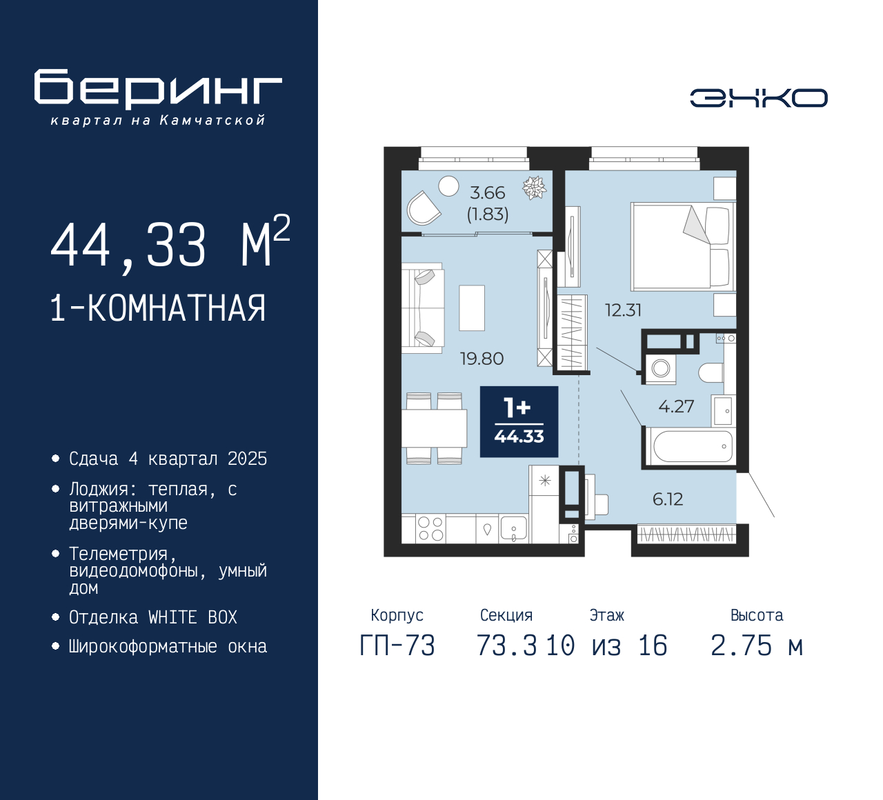 Однокомнатная квартира от застройщика в ЖК "Беринг" на 10 этаже. Квартира без отделки, после выдачи ключей можно делать ремонт. Общая площадь: 44.33 кв.м., жилая: 12.31 кв.м., площадь просторной кухни-столовой: 19.8 кв.м. Все окна выходят на одну сторону. В квартире одна лоджия, один совмещенный санузел. Высота потолков 2.75 м. Дом монолитный, многоподъездный, переменной этажности, от 9 до 22 этажей. Квартира находится в 73.3-й секции высотой 16 этажей в корпусе ГП-73. На этаже 8 квартир. В подъезде 1 пассажирский и 1 грузовой лифт. Окончание строительства - 4 квартал 2025 года. Оформление сделки по договору долевого участия. Подобно знаменитому исследователю, мы чувствуем себя первооткрывателями этой локации. Хотим показать новую суть места, сформировать для вас жизненный опыт, которого ещё не было. Беринг — район зелёного цвета. Беринг — район, который откроется вам с другой стороны. Впечатлит новым уровнем комфорта и качеством жизни. Беринг — открытие на карте города. Первый квартал расположен в районе Тура, в границах улиц: Камчатская – Западносибирская – Энтузиастов. Вокруг уже есть всё для того, чтобы ежедневная рутина была лишь частью жизни и не доставляла дискомфорта. Школы и детские сады, магазины и аптеки, поликлиника, места для семейного отдыха, пеших и велопрогулок, и даже рыбалки. Масштабное озеленение дворов — визитная карточка ЭНКО и ваш оазис спокойствия, чтобы отвлечься от повседневности. Раскидистые деревья, кустарники, травы и цветы — осталось остановиться, вдохнуть и расслабиться, глядя на эту природную красоту. Стилистика подъездов продолжает концепцию Беринга, вдохновлённого Камчаткой: сдержанный, но при этом впечатляющий дизайн соседствует с удобством и функциональностью. (AQID02528157)