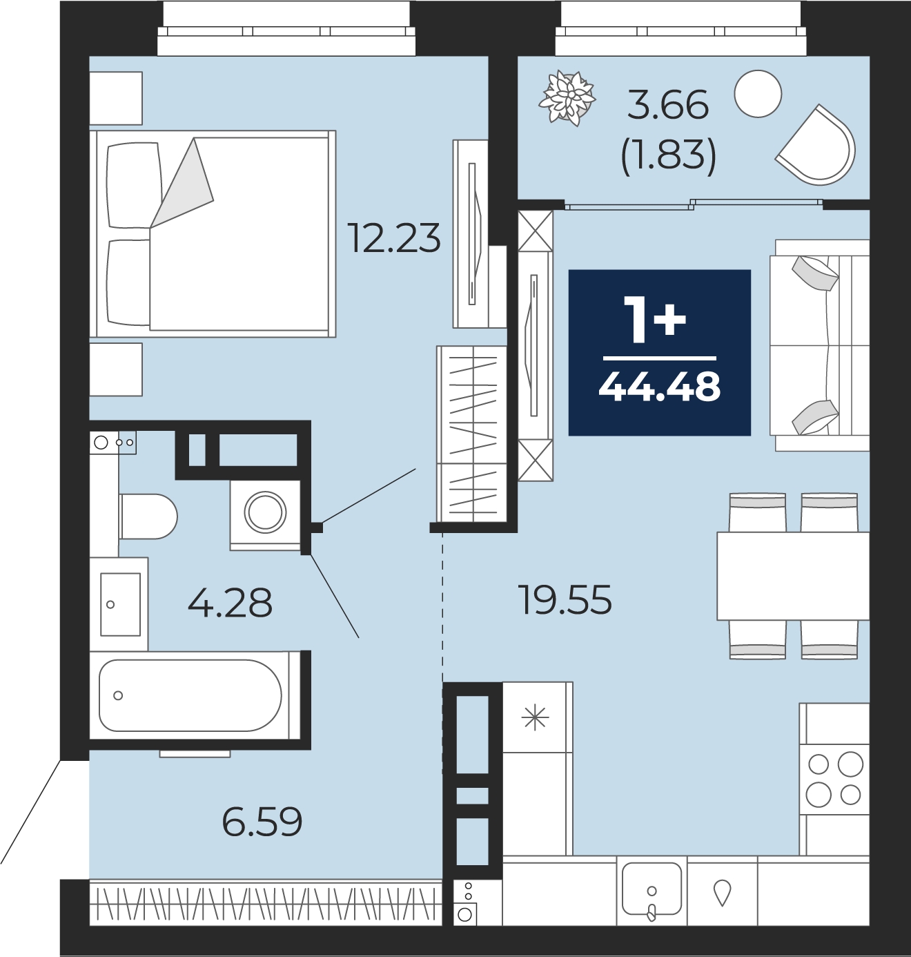 - Общая площадь 44.48 м²